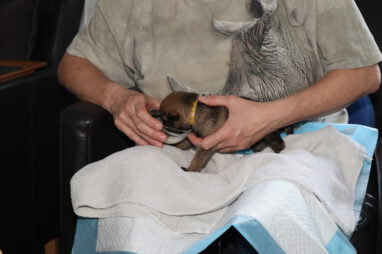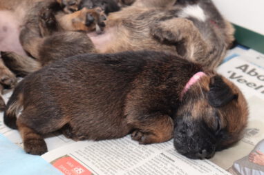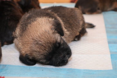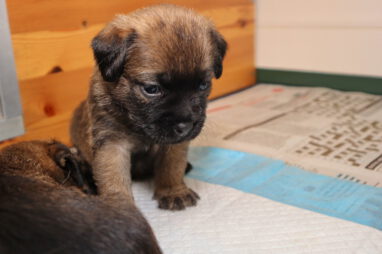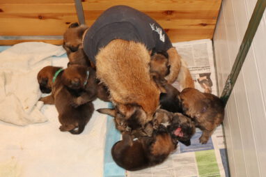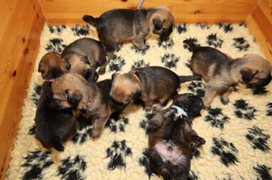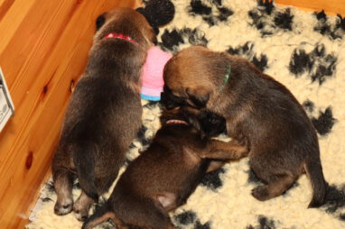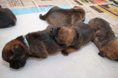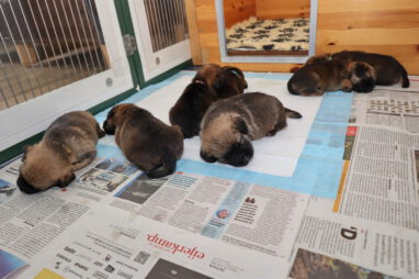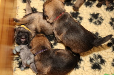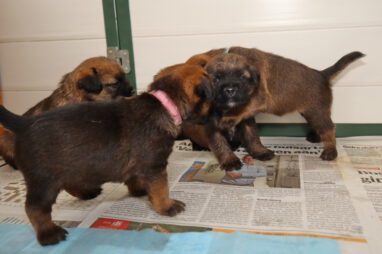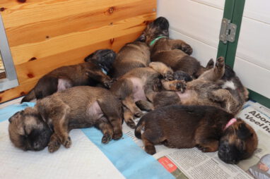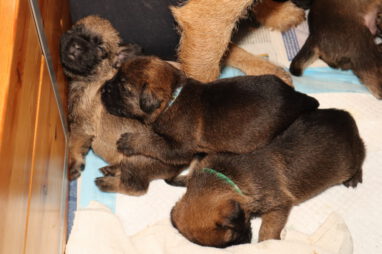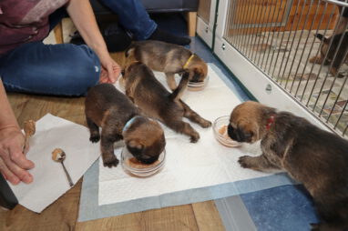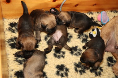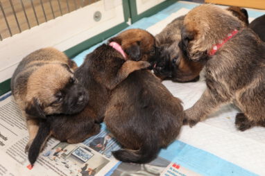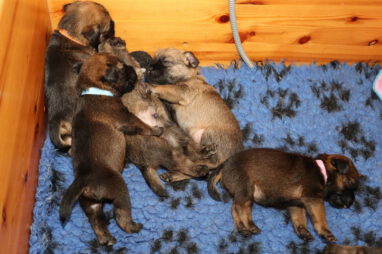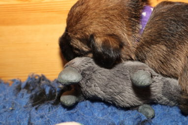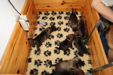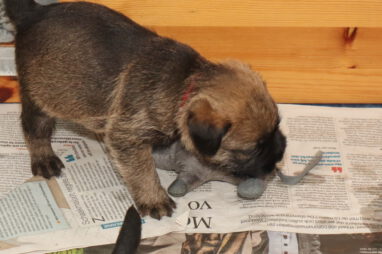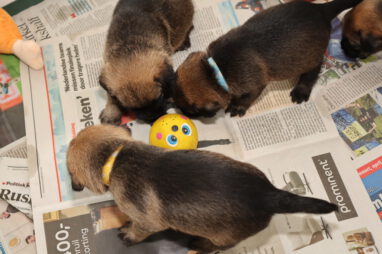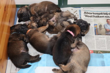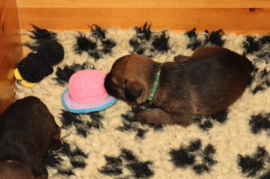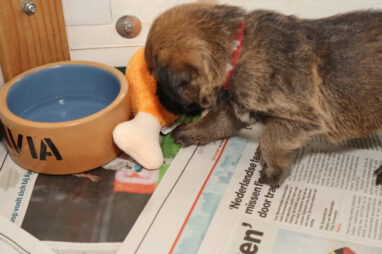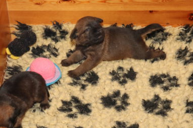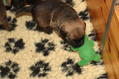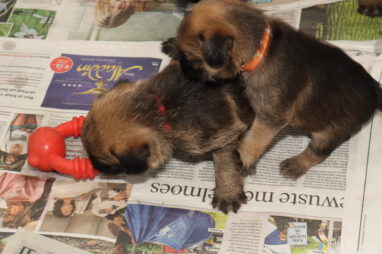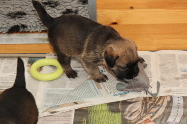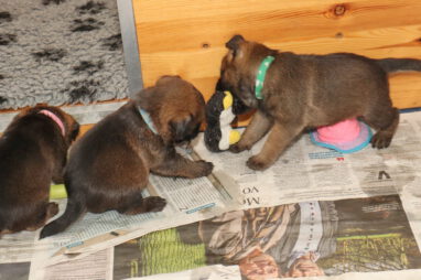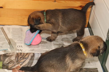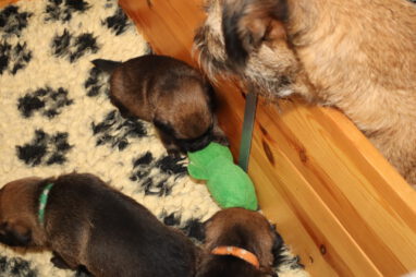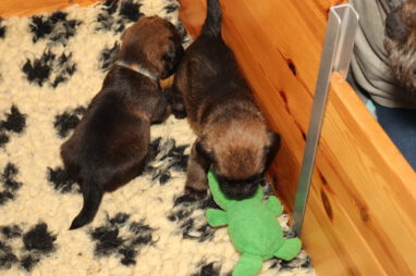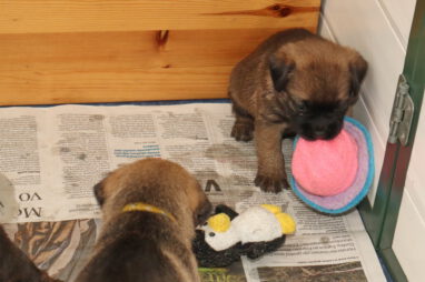 De pups amuseren zich prima in de werpkist. Ze spelen steeds vaker met elkaar en ze hebben ook al wat speeltjes waarmee ze heel leuk bezig zijn. Je merkt dat ze heel nieuwsgierig zijn, de speeltjes worden aan alle kanten onderzocht.