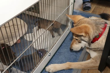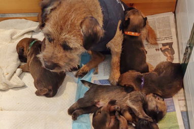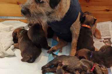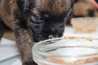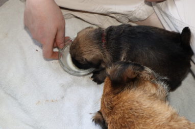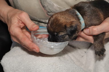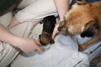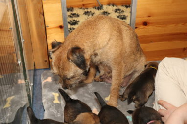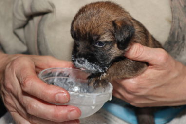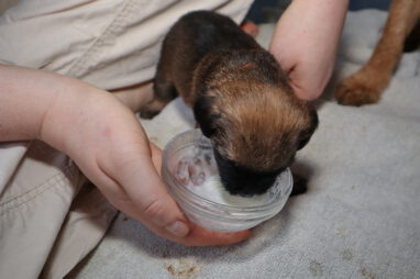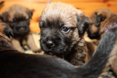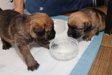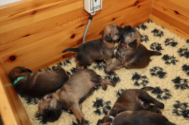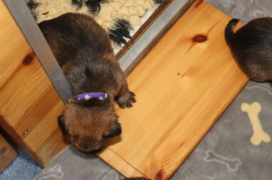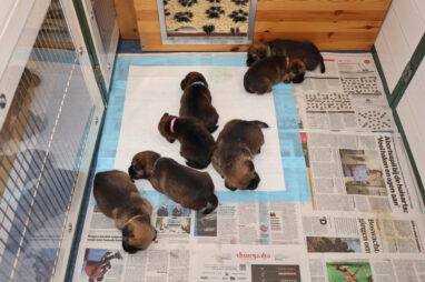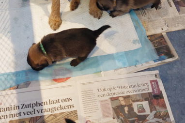 De pups beginnen ook door te krijgen dat er een wereld buiten de werpkist is. Ze kijken zo af en toe eens over het randje om te kunnen zien hoe het er daar uit ziet.