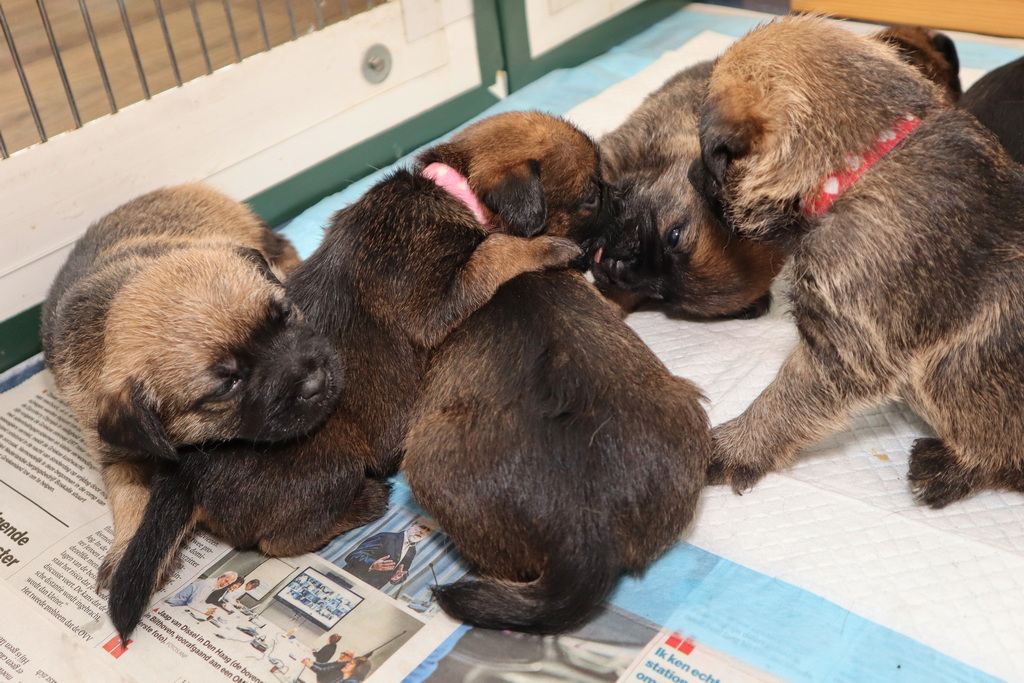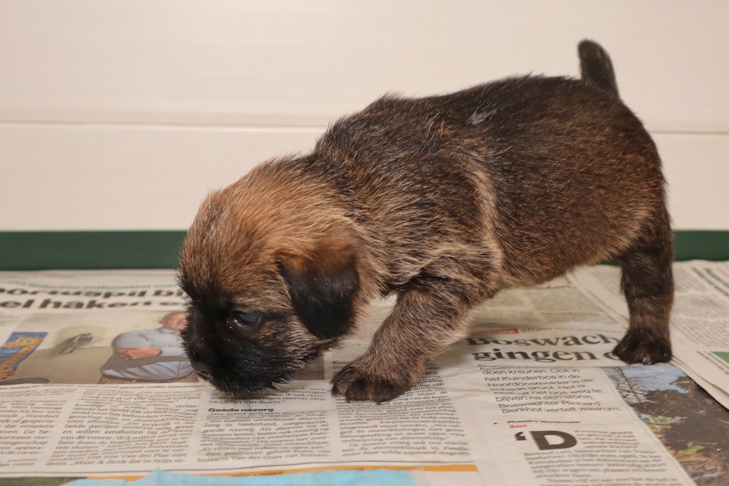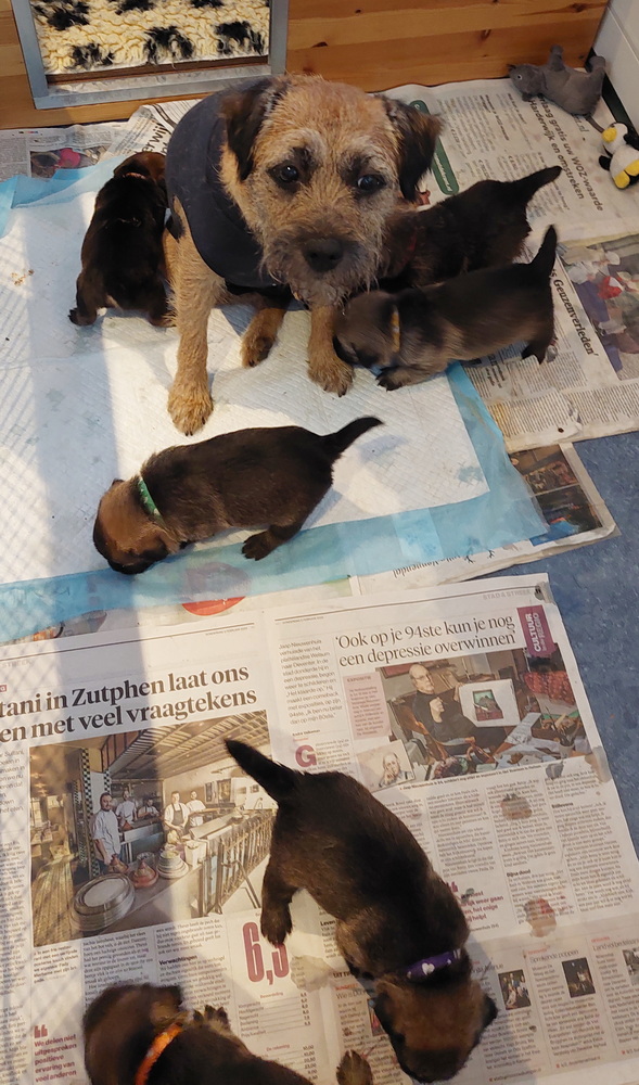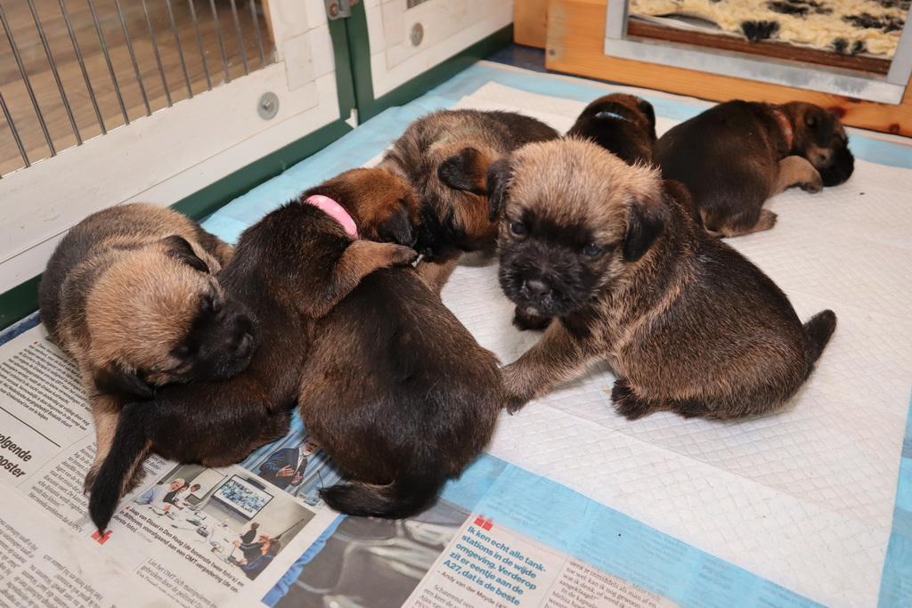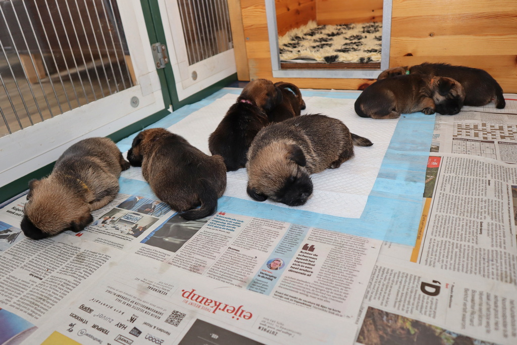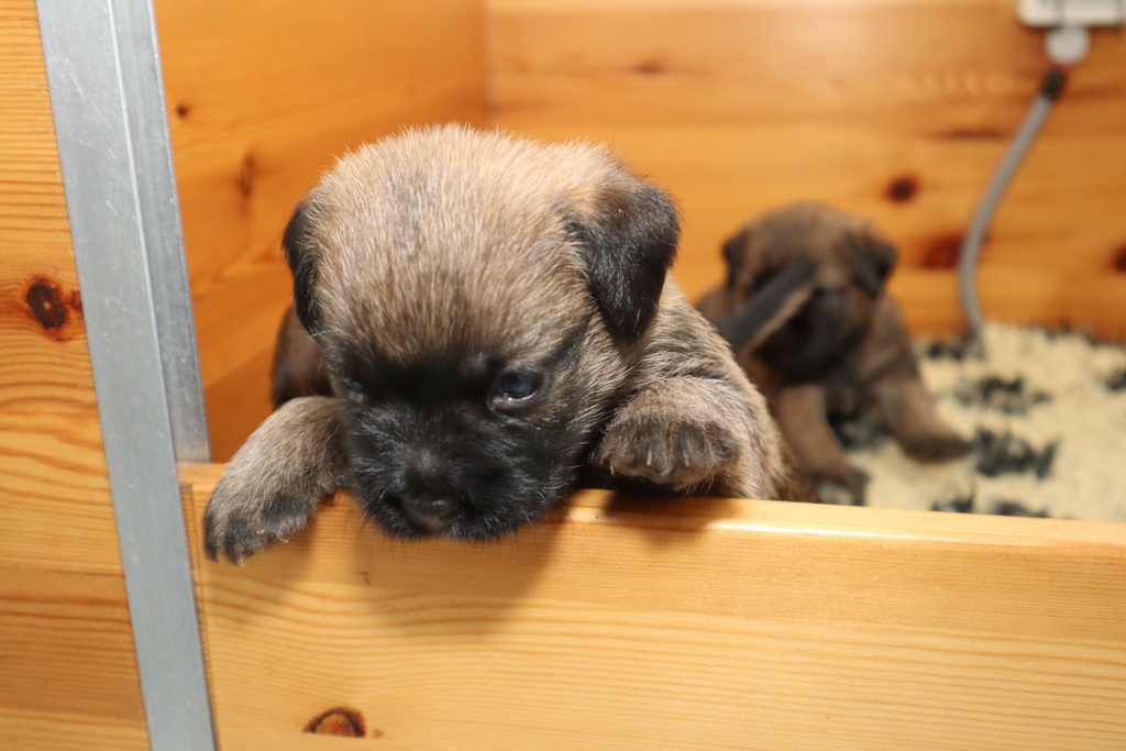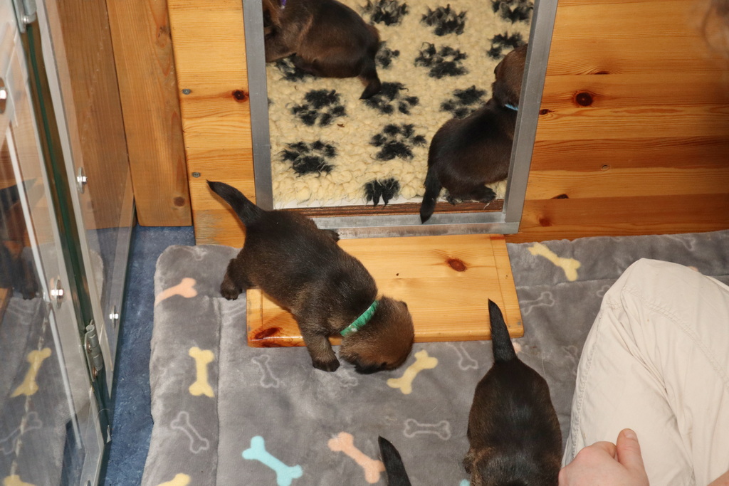 De pups beginnen ook door te krijgen dat er een wereld buiten de werpkist is. Ze kijken zo af en toe eens over het randje om te kunnen zien hoe het er daar uit ziet.