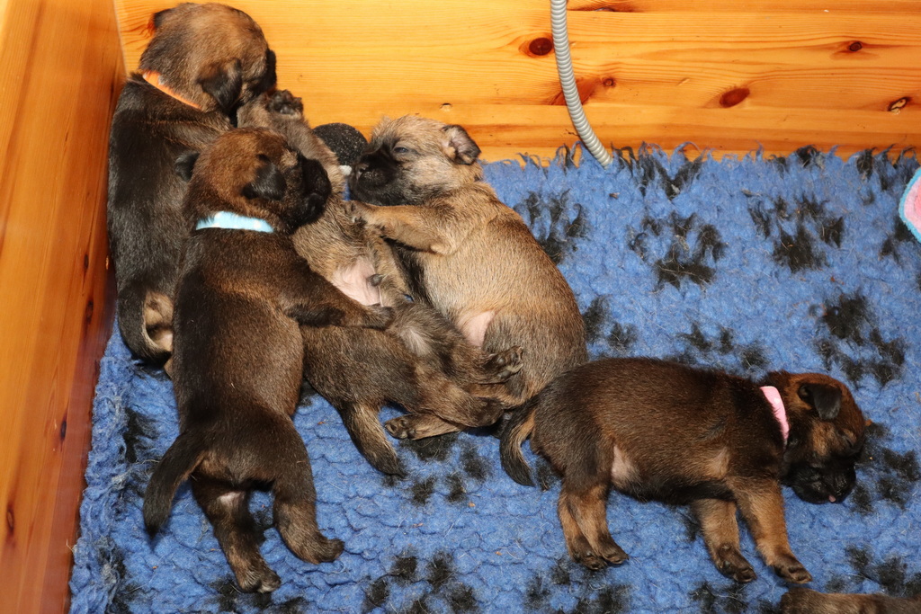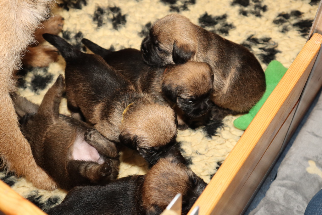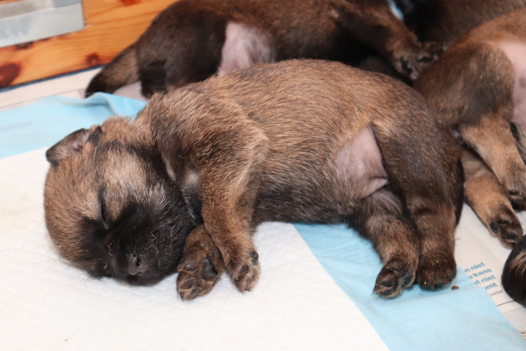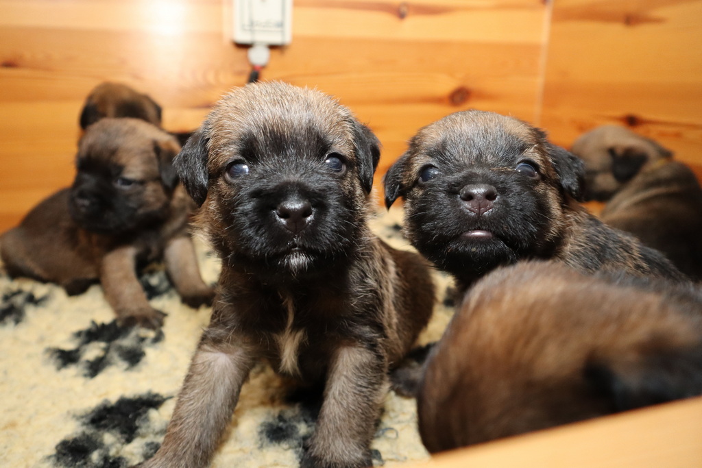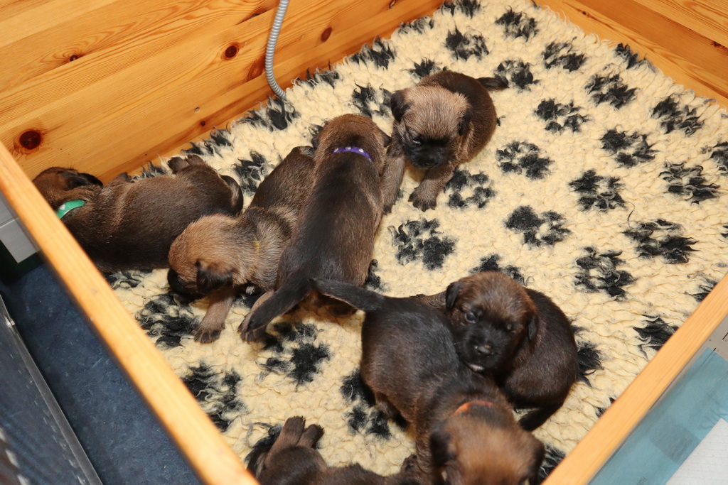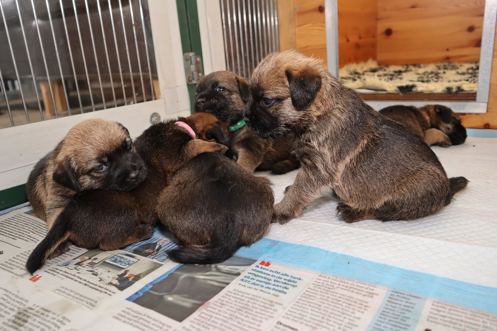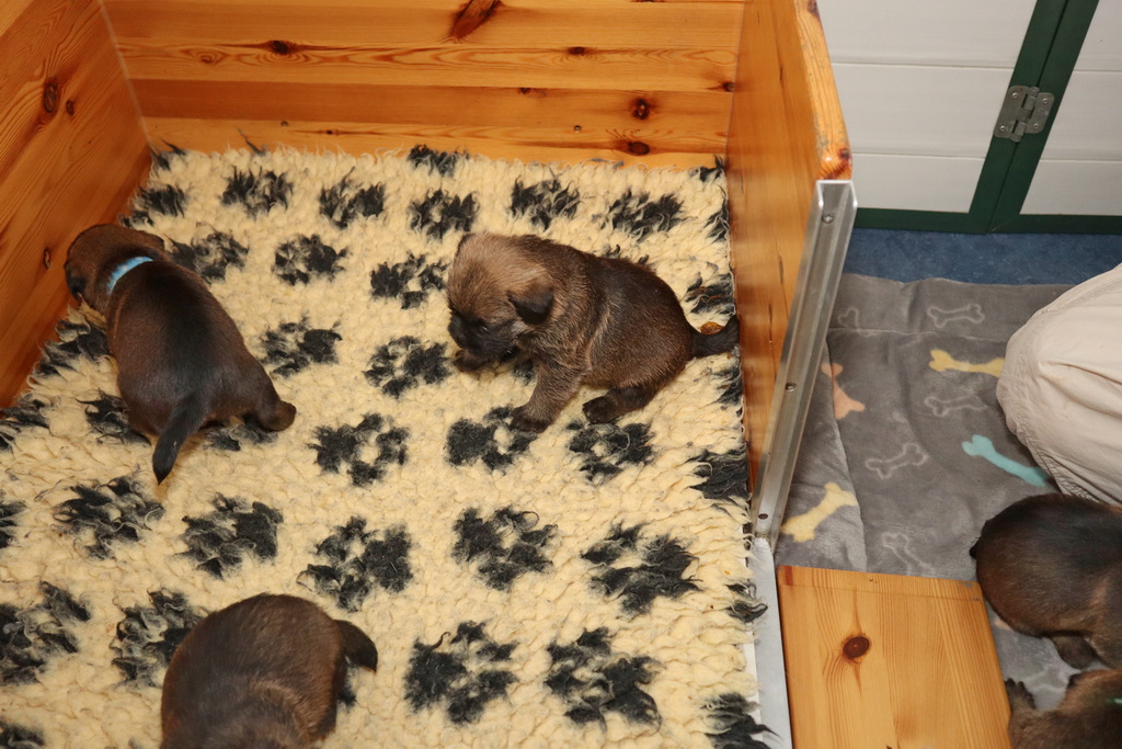 De pups beginnen ook door te krijgen dat er een wereld buiten de werpkist is. Ze kijken zo af en toe eens over het randje om te kunnen zien hoe het er daar uit ziet.