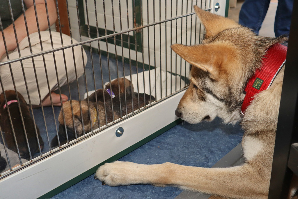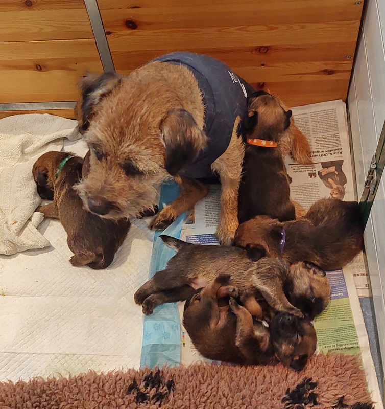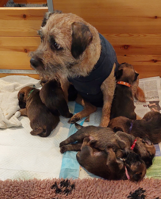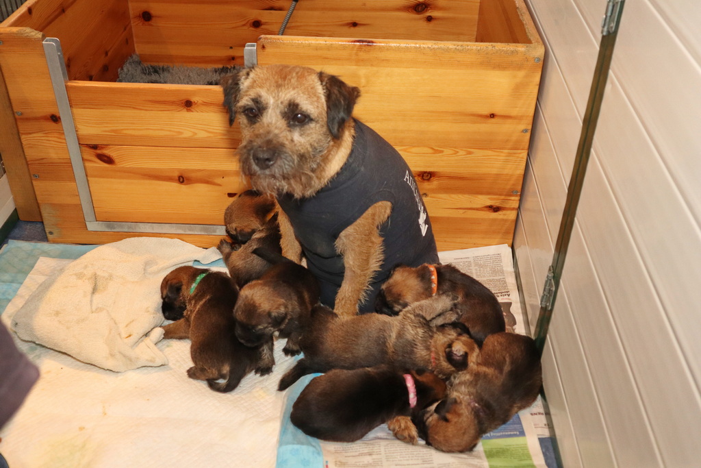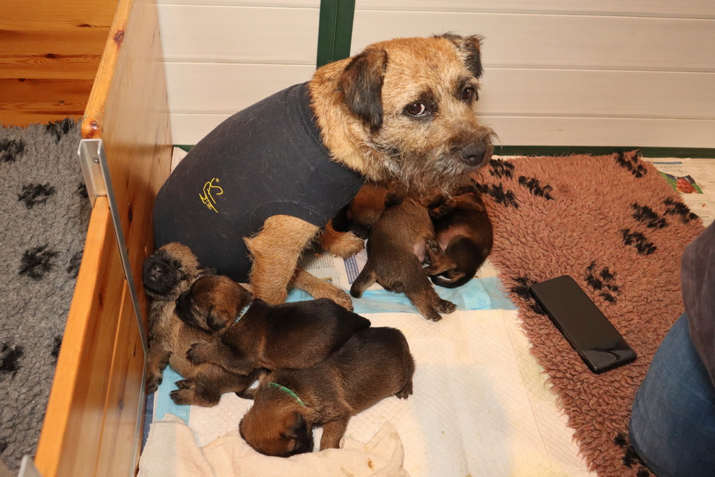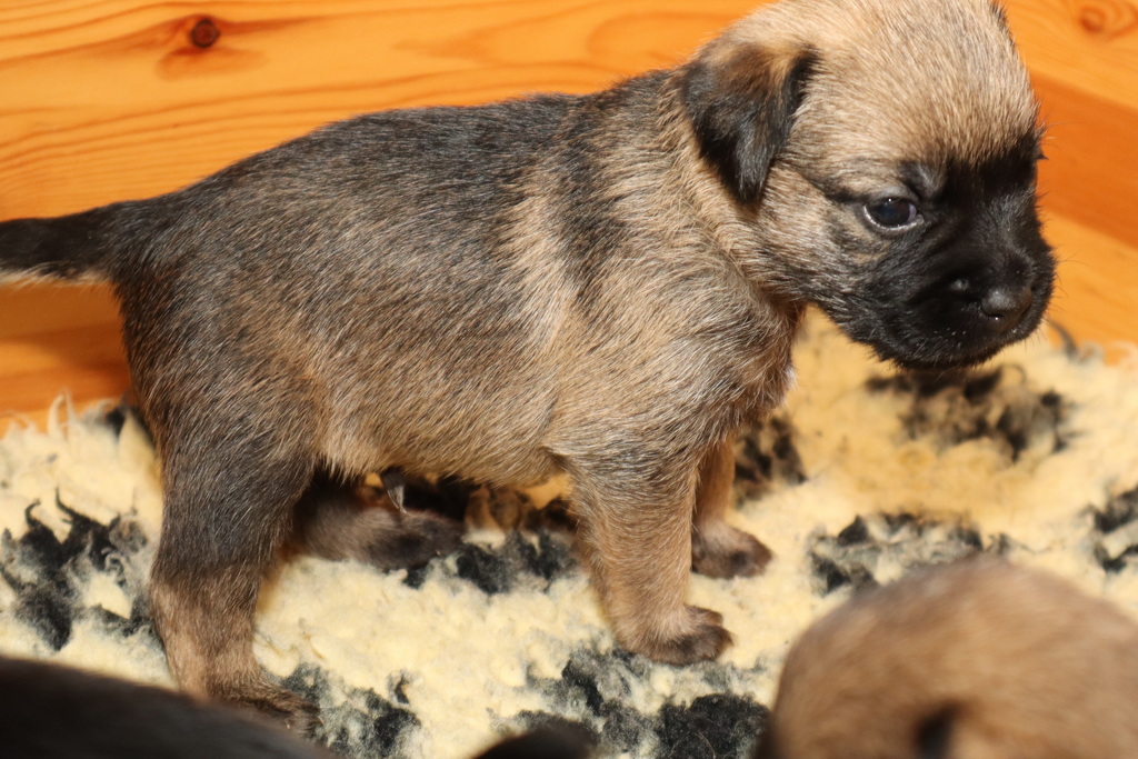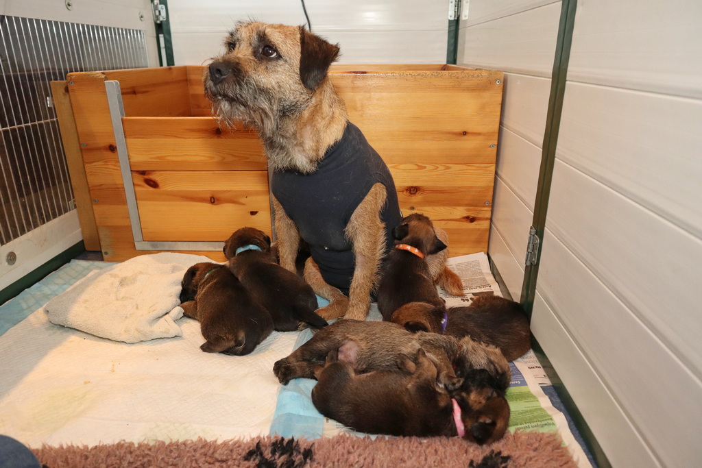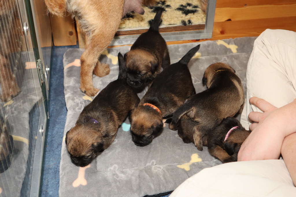 De pups beginnen ook door te krijgen dat er een wereld buiten de werpkist is. Ze kijken zo af en toe eens over het randje om te kunnen zien hoe het er daar uit ziet.