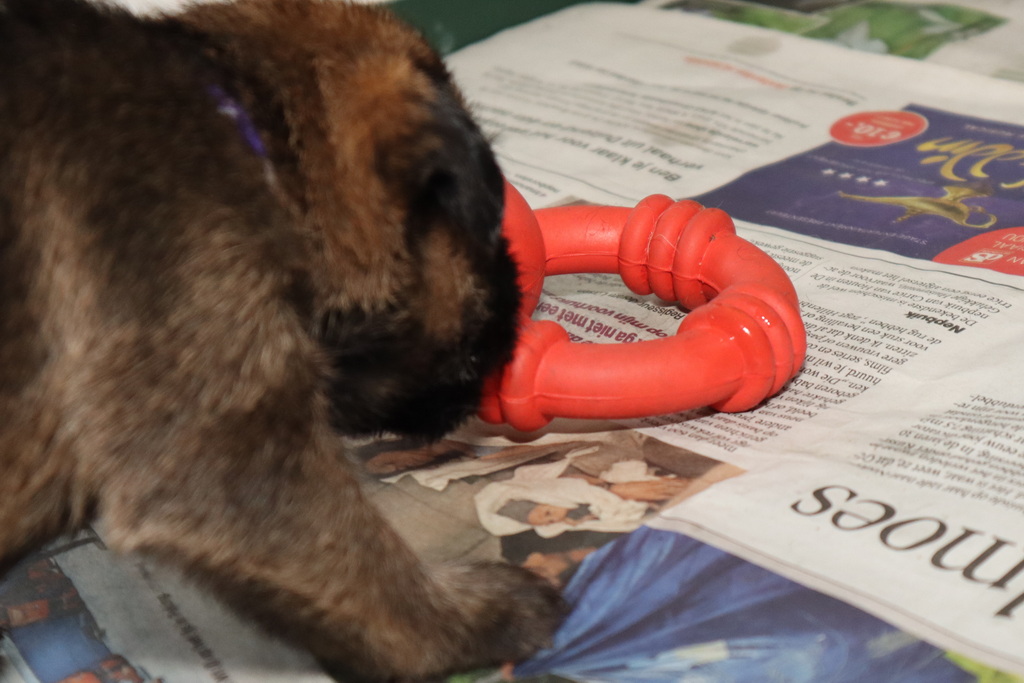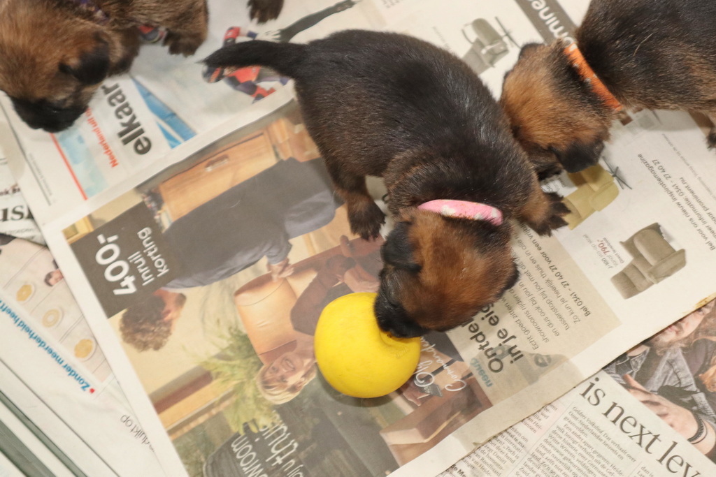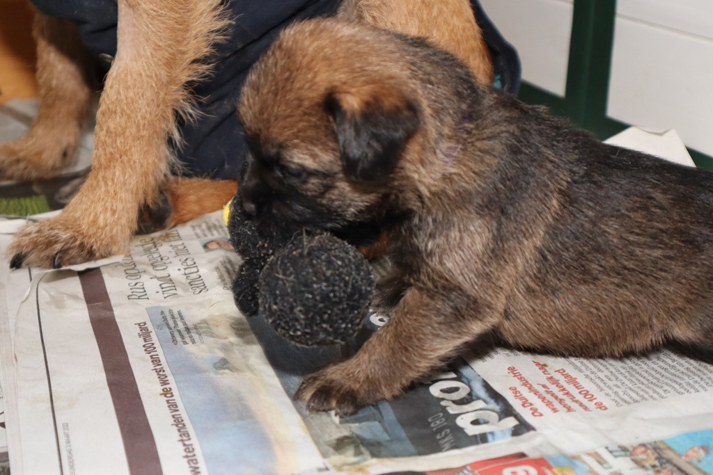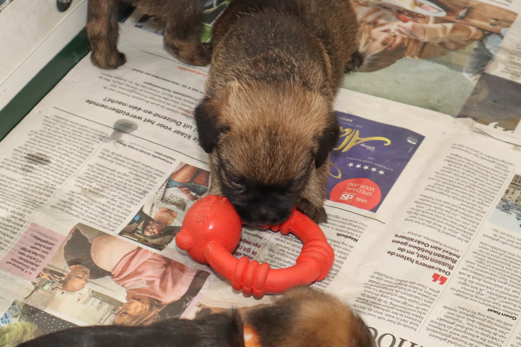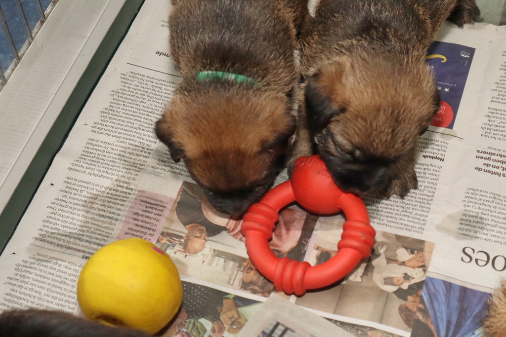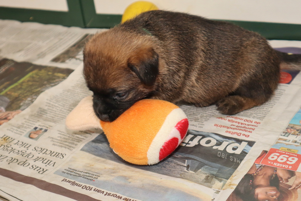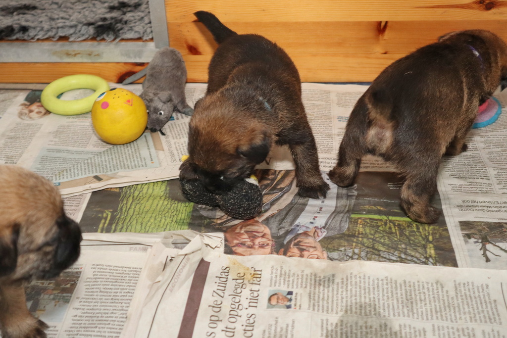 De pups amuseren zich prima in de werpkist. Ze spelen steeds vaker met elkaar en ze hebben ook al wat speeltjes waarmee ze heel leuk bezig zijn. Je merkt dat ze heel nieuwsgierig zijn, de speeltjes worden aan alle kanten onderzocht.