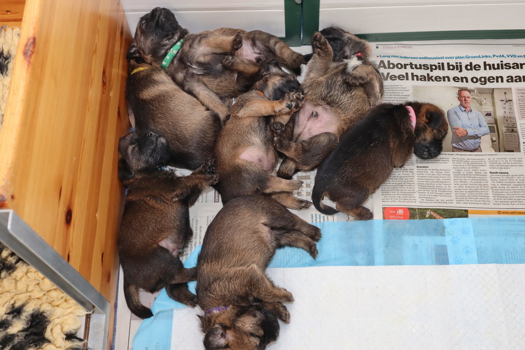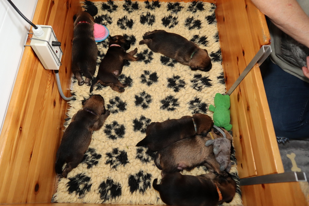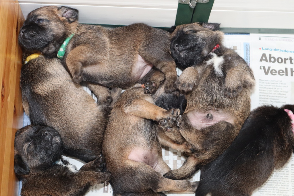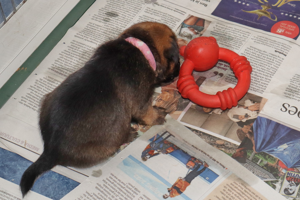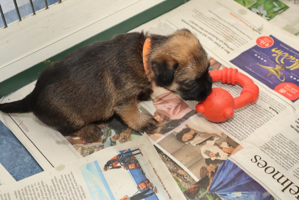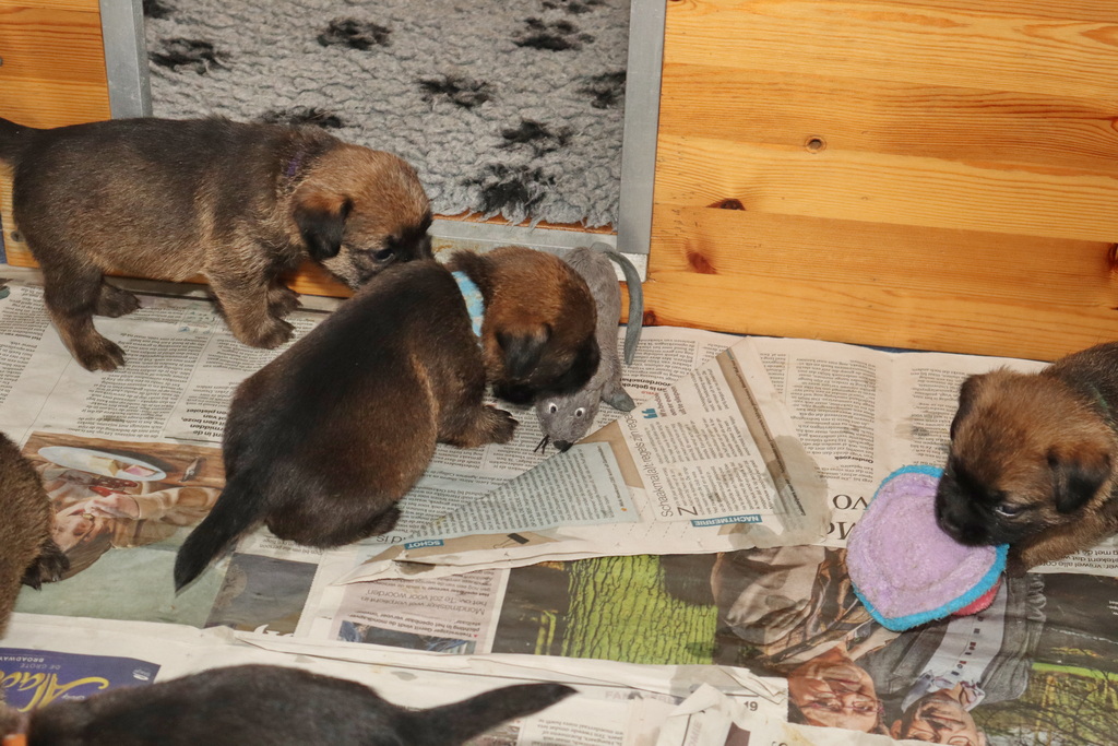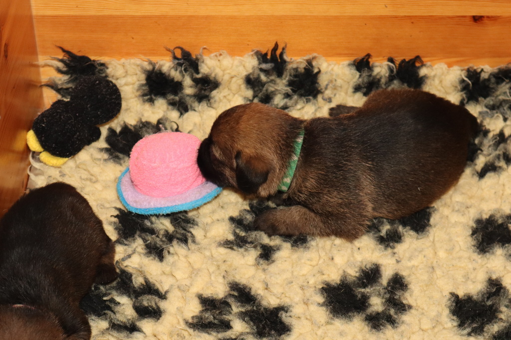 De pups amuseren zich prima in de werpkist. Ze spelen steeds vaker met elkaar en ze hebben ook al wat speeltjes waarmee ze heel leuk bezig zijn. Je merkt dat ze heel nieuwsgierig zijn, de speeltjes worden aan alle kanten onderzocht.
