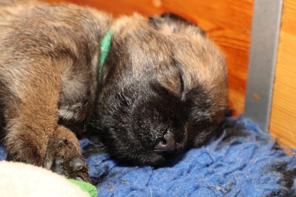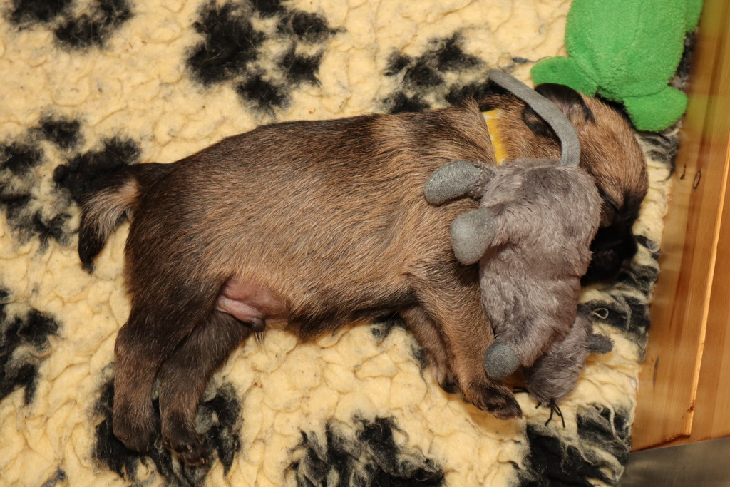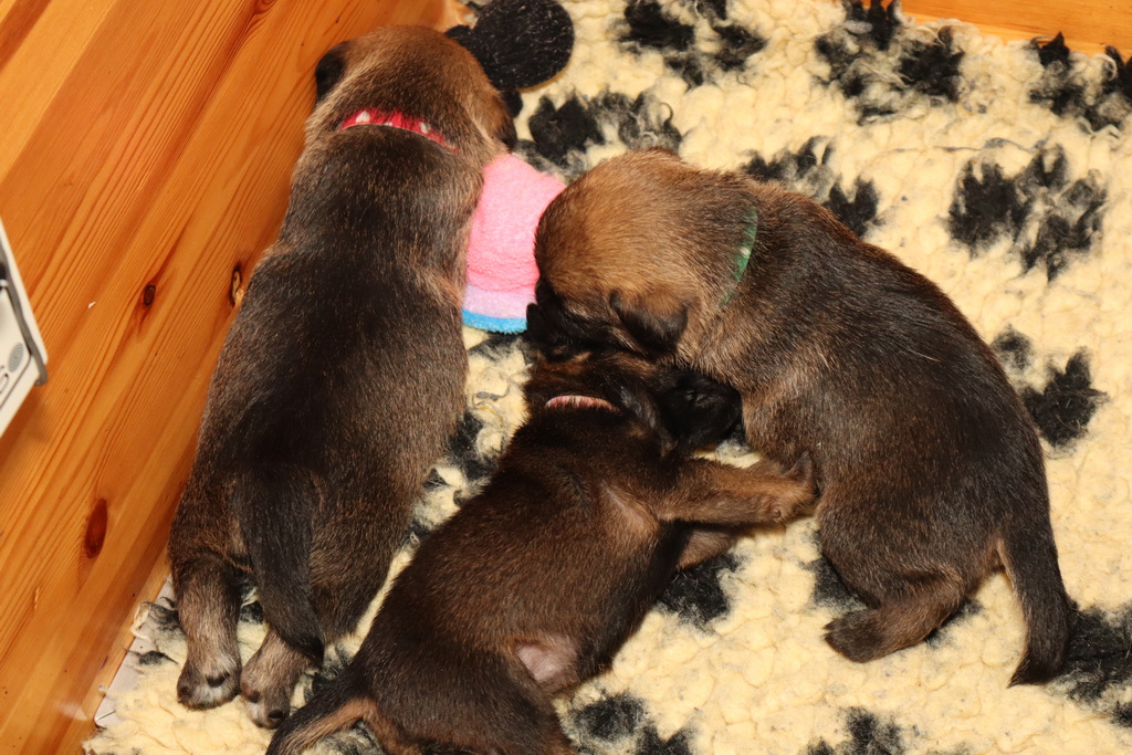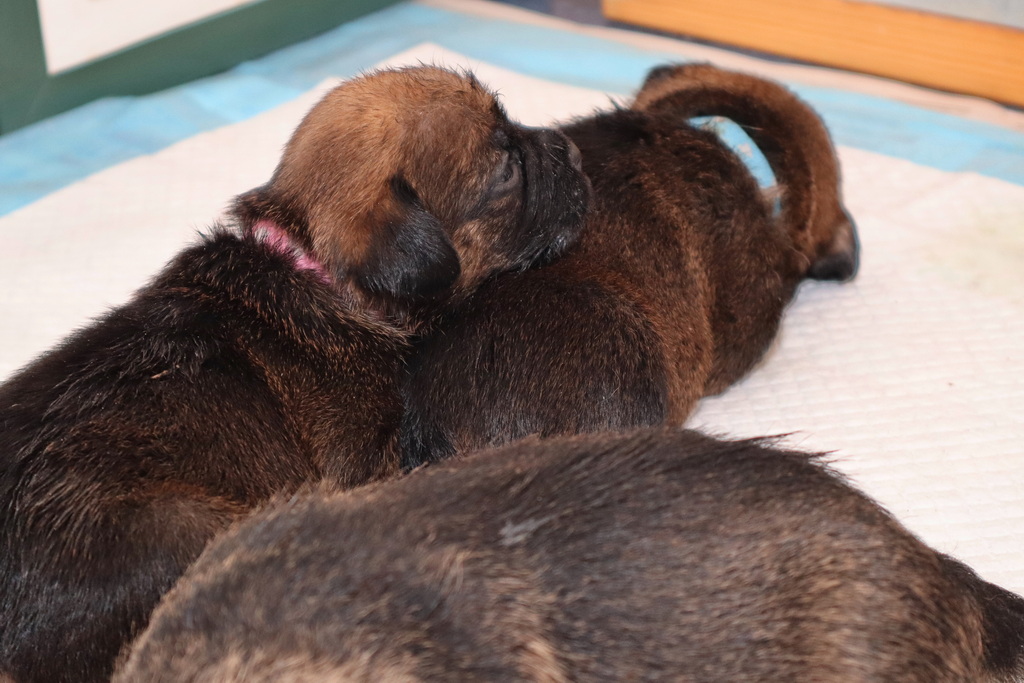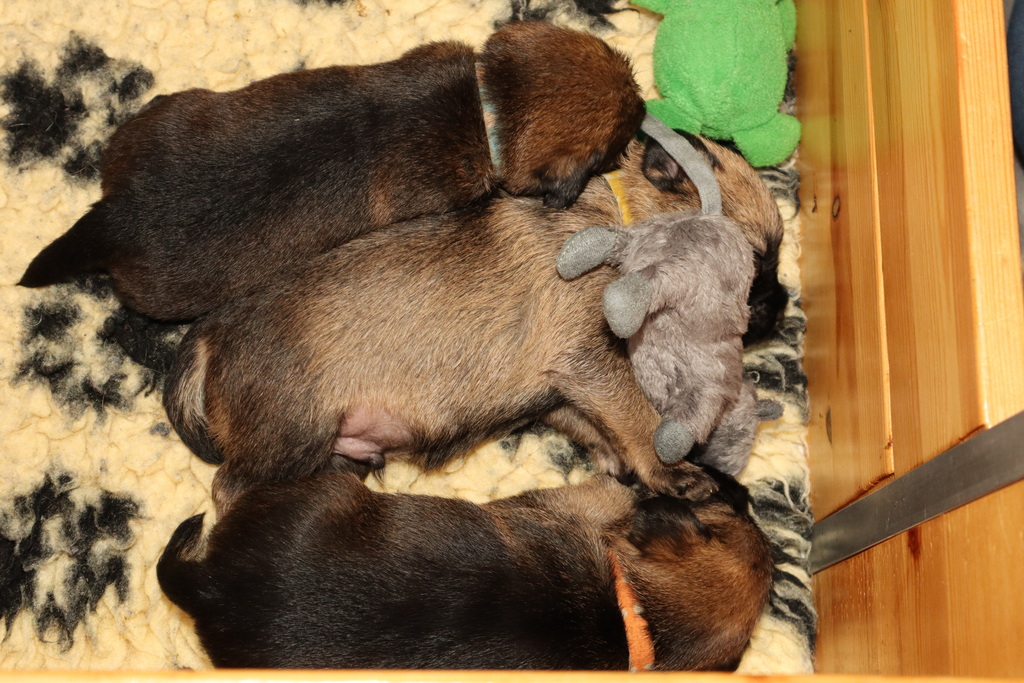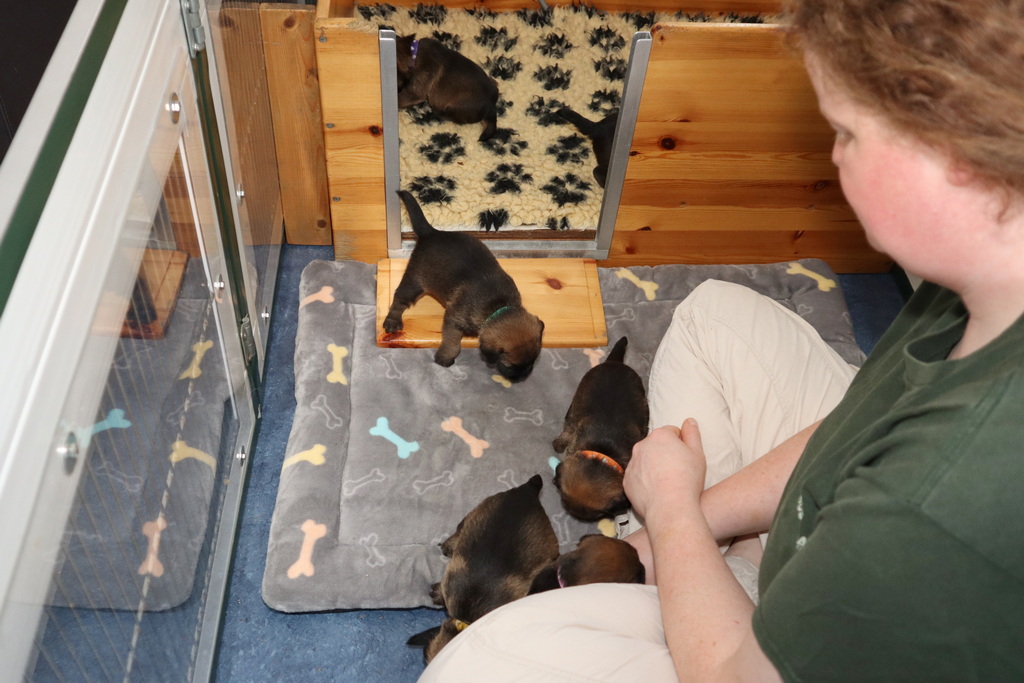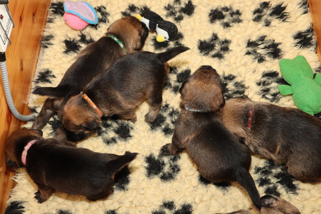 De pups amuseren zich prima in de werpkist. Ze spelen steeds vaker met elkaar en ze hebben ook al wat speeltjes waarmee ze heel leuk bezig zijn. Je merkt dat ze heel nieuwsgierig zijn, de speeltjes worden aan alle kanten onderzocht.