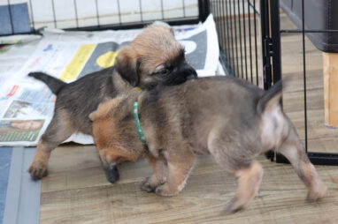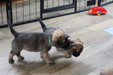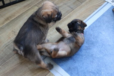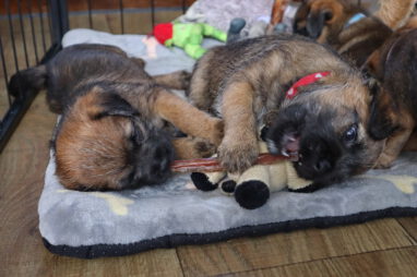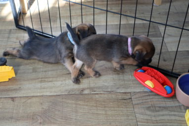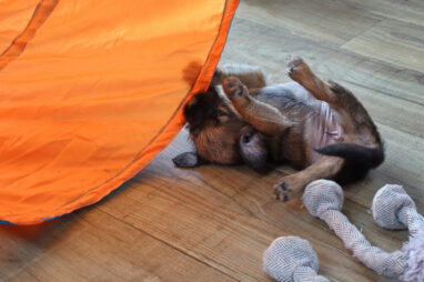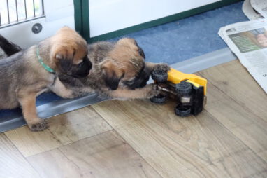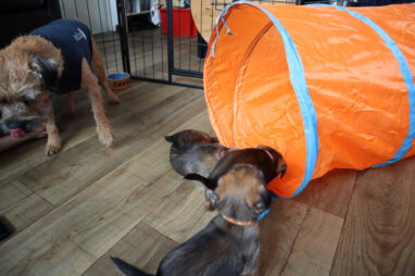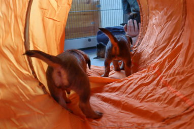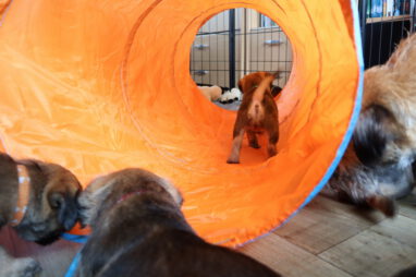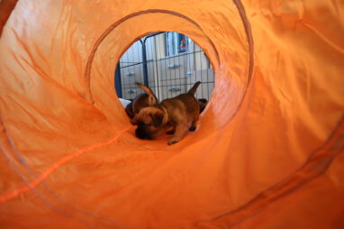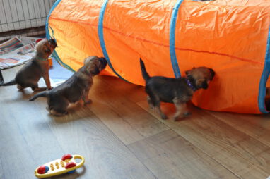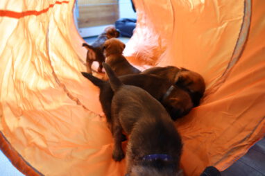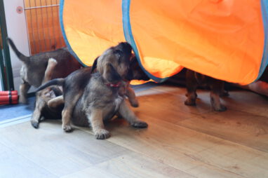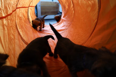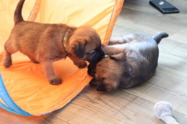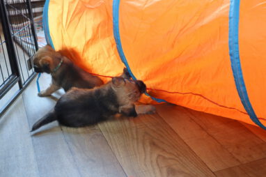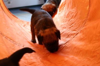 Deze week hebben ze voor het eerst kennis gemaakt met een tunneltje. Ze vonden het prachtig en hadden heel gauw door dat je er doorheen kon lopen. Maar er onderdoor was ook erg leuk. En natuurlijk moest even onderzocht worden hoe sterk de tunnel is, lekker overal in bijten dus. De tunnel heeft dan ook alle hoeken van de ren gezien!