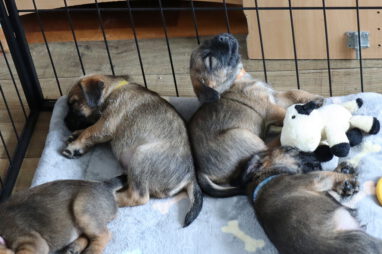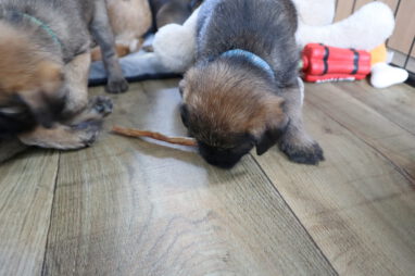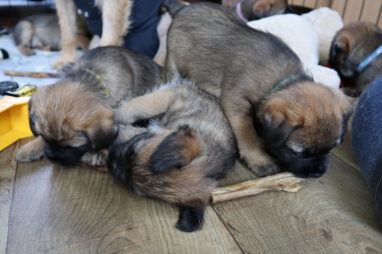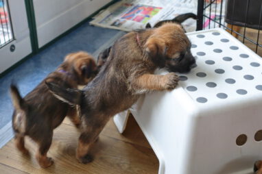 Een simpel krukje is ook reuzeleuk. De pups hebben het van alle kanten bekeken. Ze willen er ook graag bovenop komen, maar daar zijn ze nog net te klein voor. Volgende week misschien?