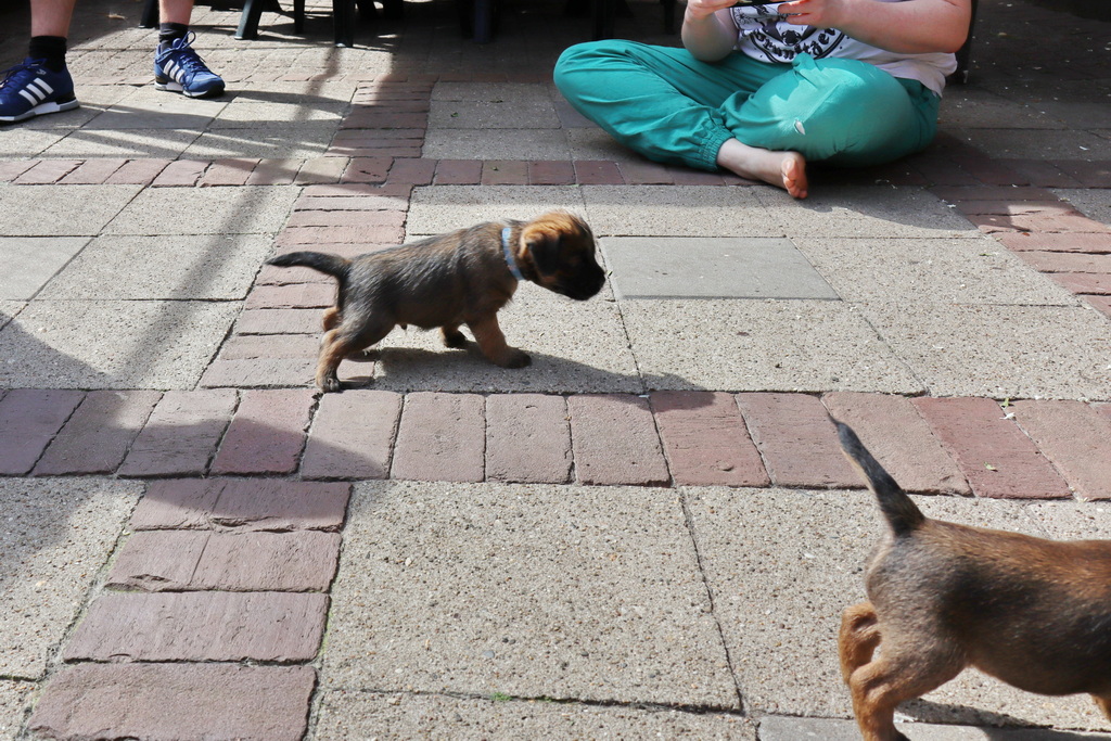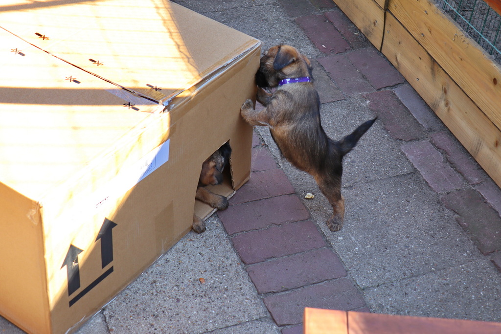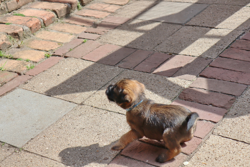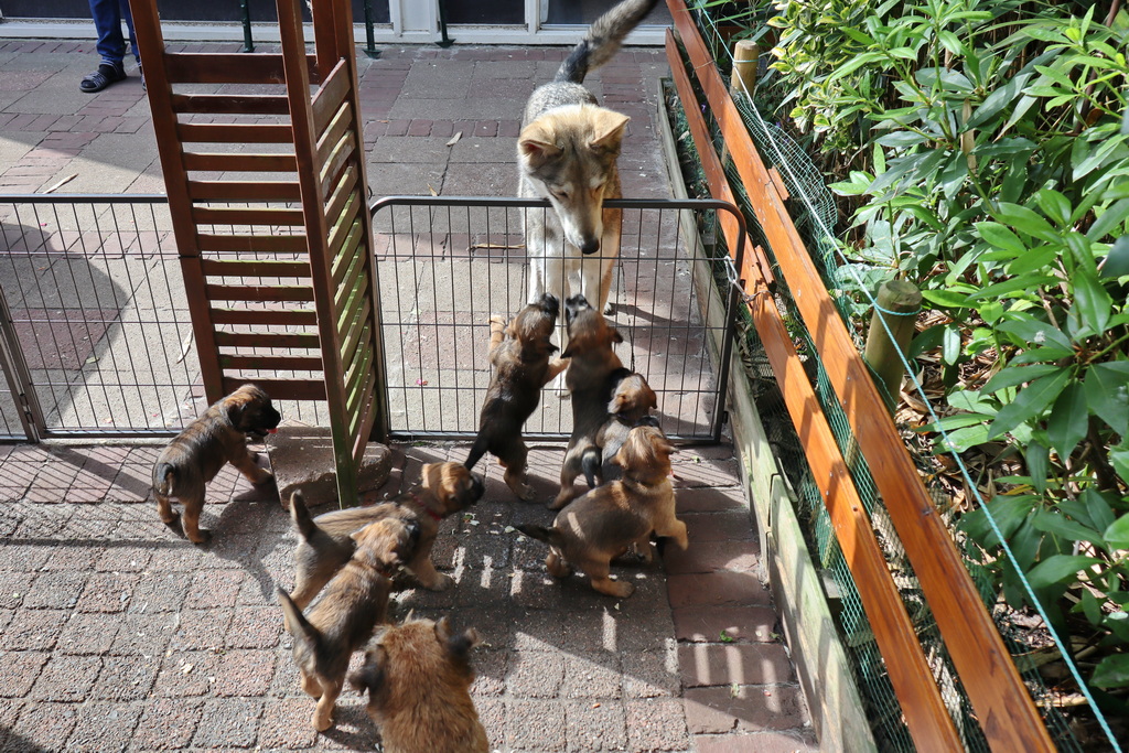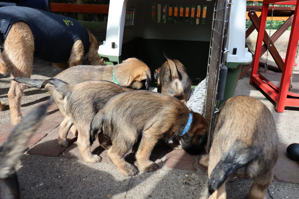 De pups waren buiten heel nieuwsgierig en gingen gelijk alles onderzoeken. Elk hoekje, gaatje, plantje en blaadje moest verkend worden. Natuurlijk  onder toeziend oog van moeder Jane. De pups genoten er echt van, ze vonden de nieuwe wereld heel leuk.