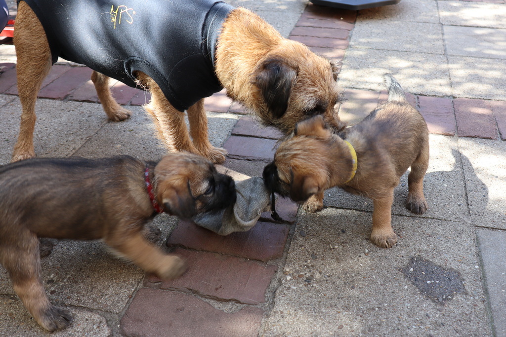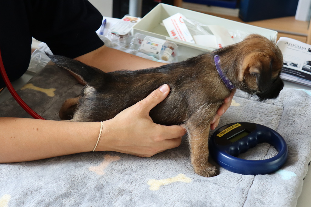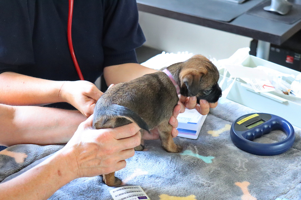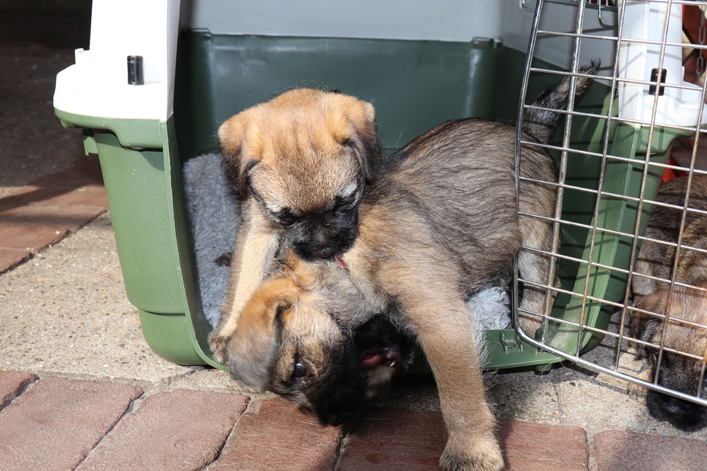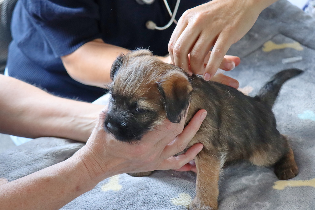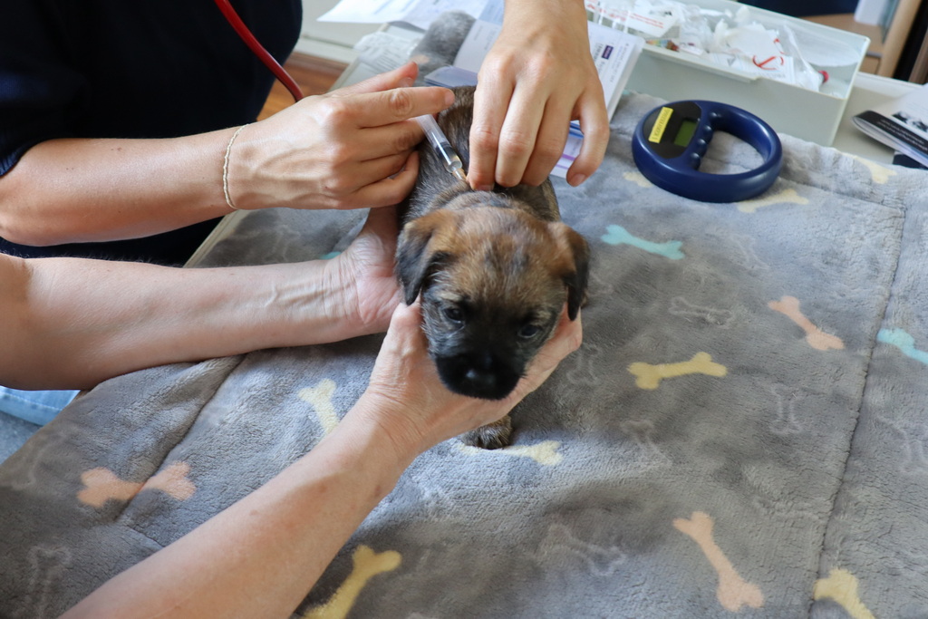 De pups hebben allemaal een compleet gezondheidsonderzoek gekregen en daarna hun eerste enting. Alle pups waren prima in orde (we hadden ook niet anders verwacht). De enting ondergingen ze gelaten, maar zonder piepen of zeuren. Het zijn gewoon stoere Border Terriërs. Ze hebben nu ook allemaal een eigen dierenpaspoort.