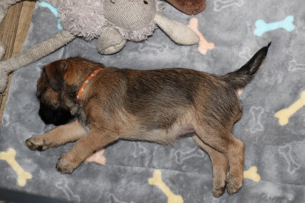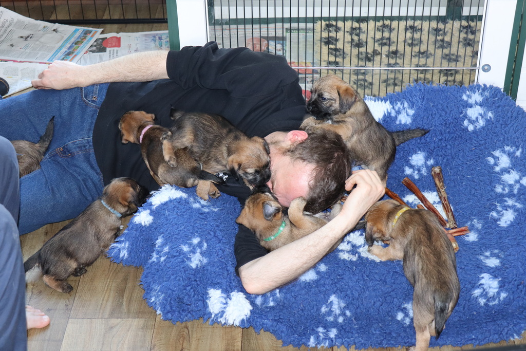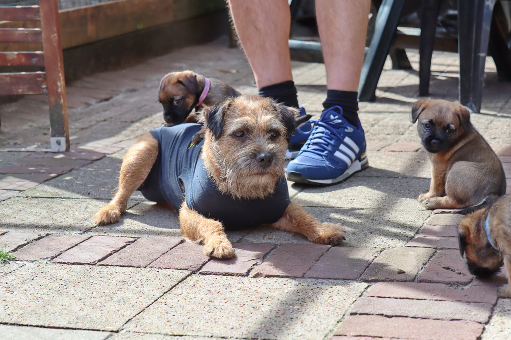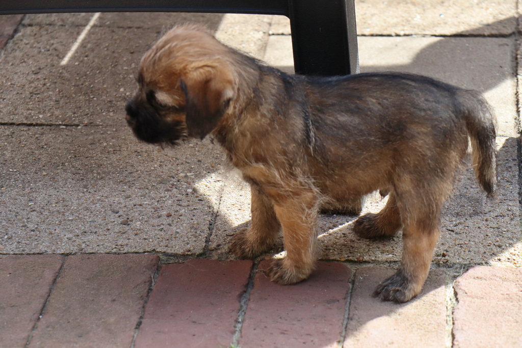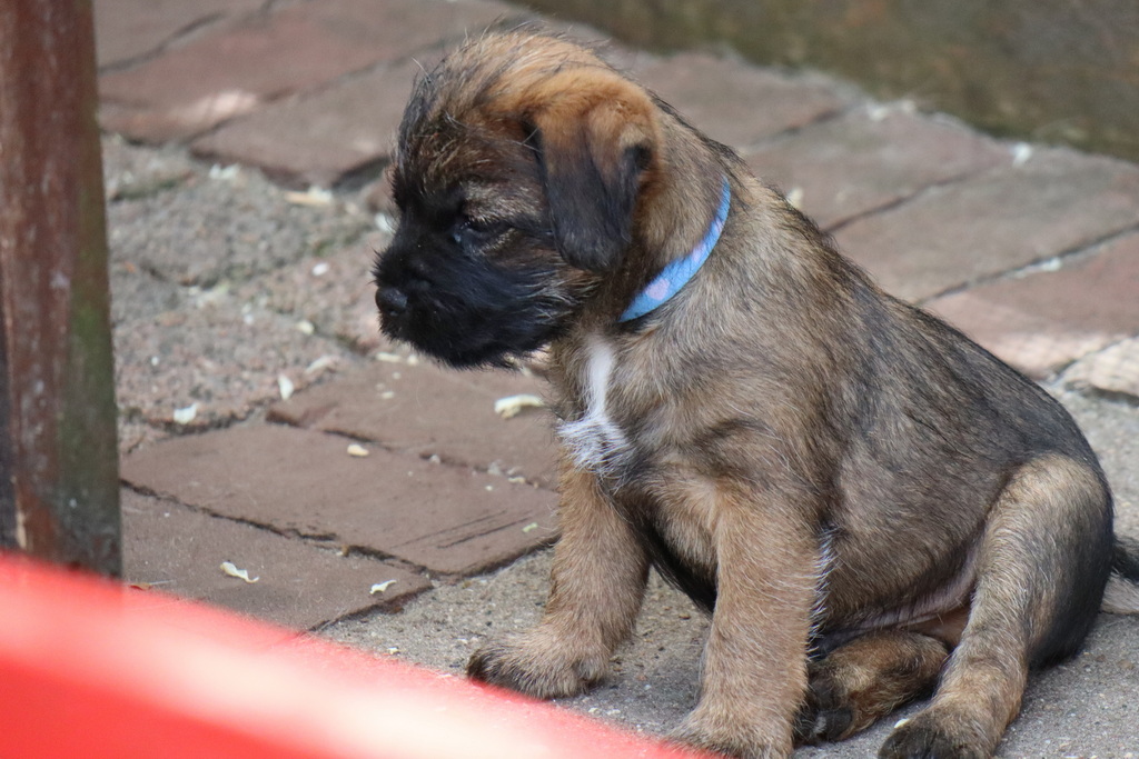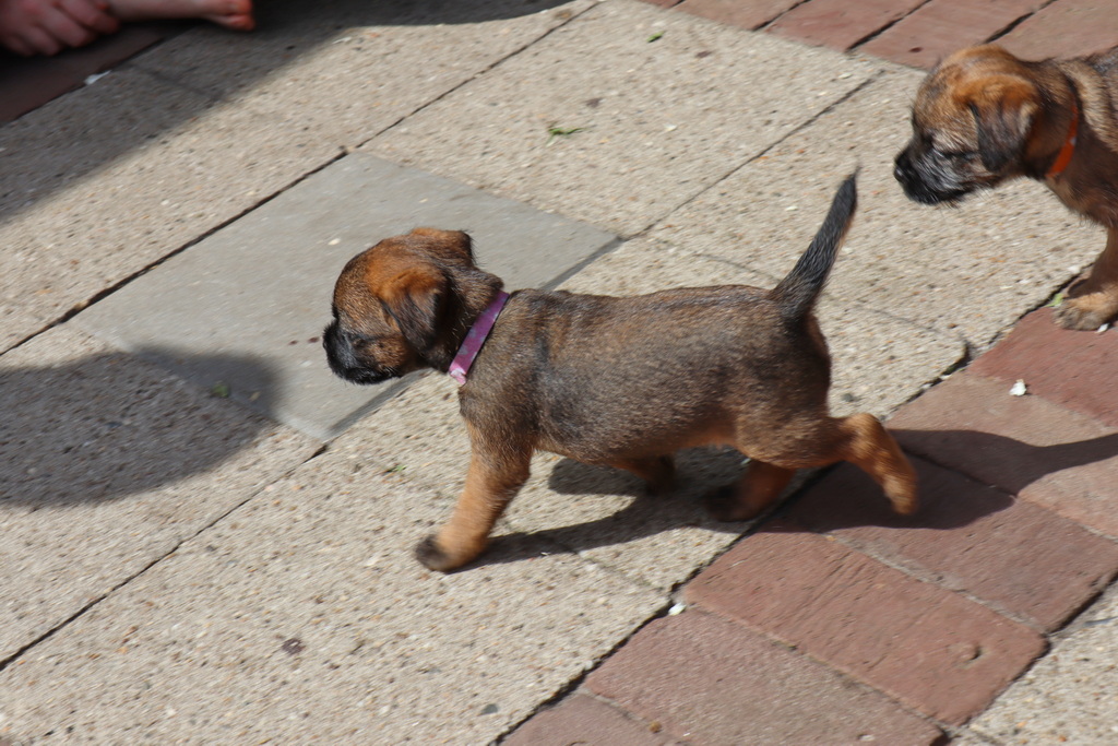 De pups hebben allemaal een compleet gezondheidsonderzoek gekregen en daarna hun eerste enting. Alle pups waren prima in orde (we hadden ook niet anders verwacht). De enting ondergingen ze gelaten, maar zonder piepen of zeuren. Het zijn gewoon stoere Border Terriërs. Ze hebben nu ook allemaal een eigen dierenpaspoort.
