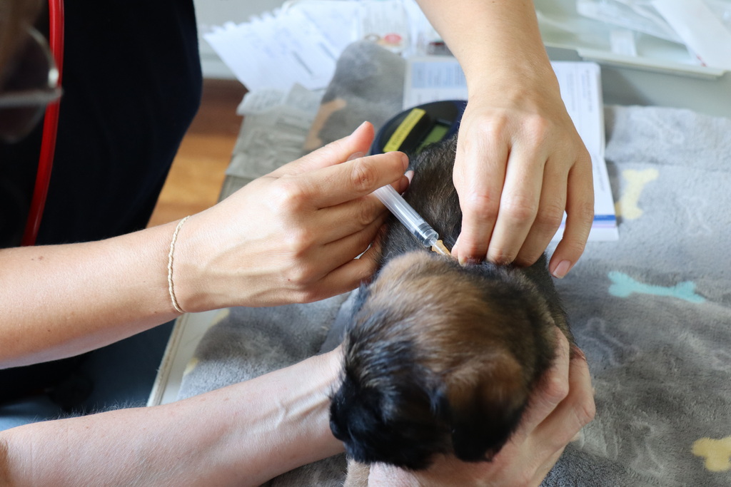 Nu de pups gechipt zijn kunnen ze ook geënt worden. Onze dierenarts komt daarvoor lekker naar ons toe. Dat is voor de pups (en ook voor Jane) veel relaxter dan een bezoek aan de praktijk.