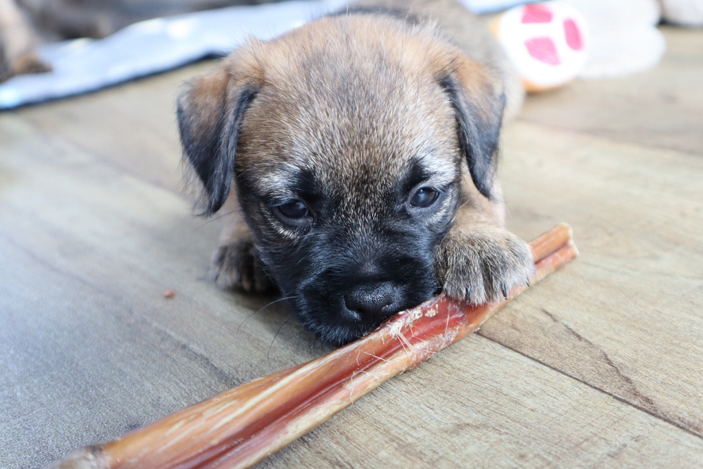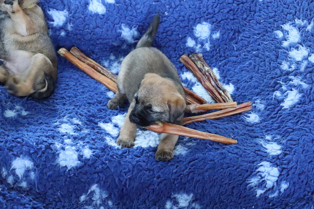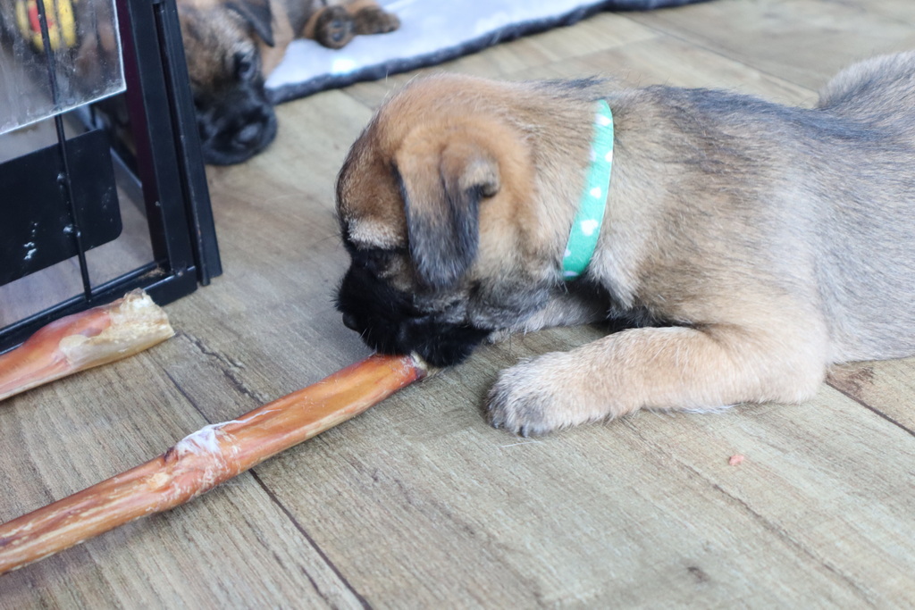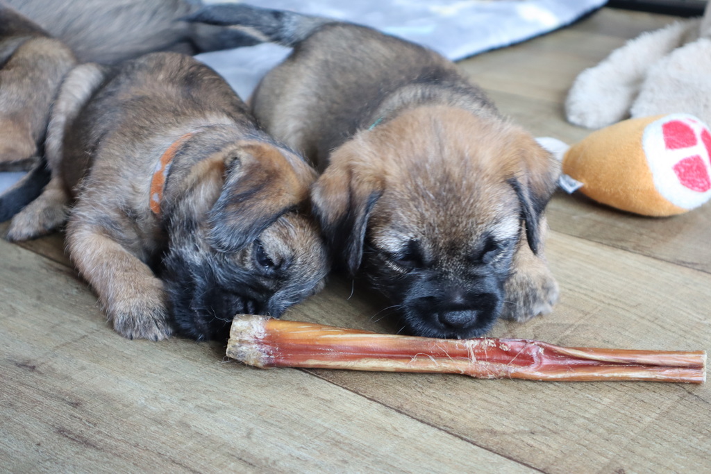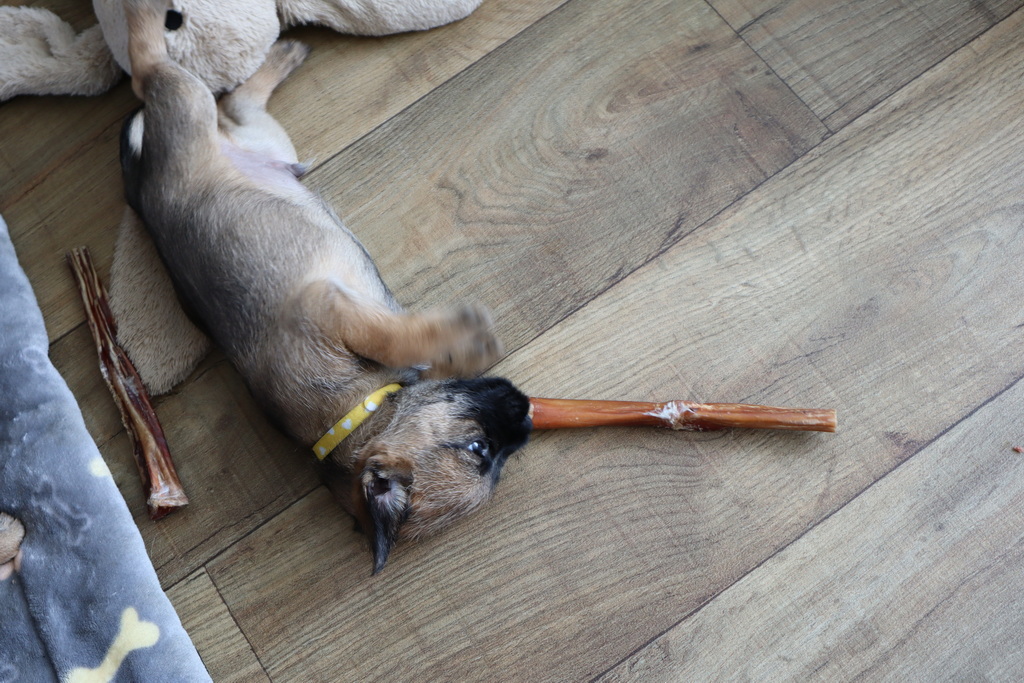 De pups kunnen heerlijk relaxed bezig zijn in de kamerren. Na druk binnen of buiten gespeeld te hebben vinden ze het heerlijk om op een bullepees liggen kauwen. Ze kunnen daarmee heel goed hun spanning kwijt en komen dan helemaal tot rust. Als ze er een tijdje op hebben liggen kauwen vallen ze lekker in slaap.