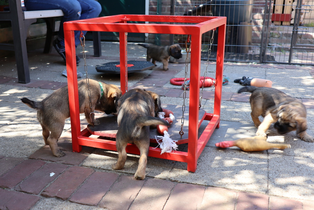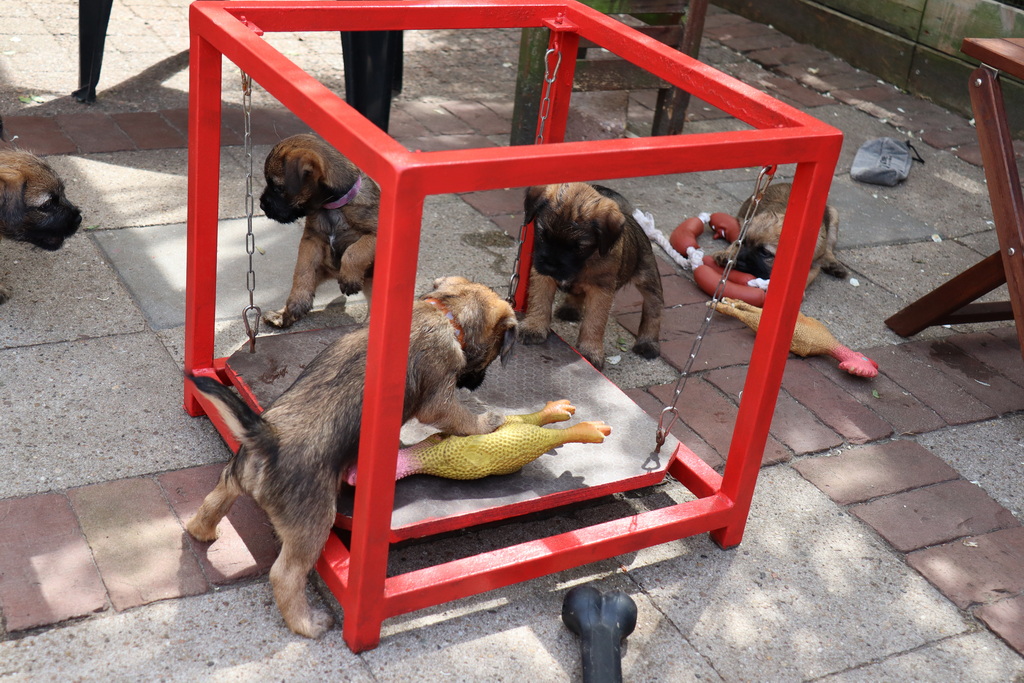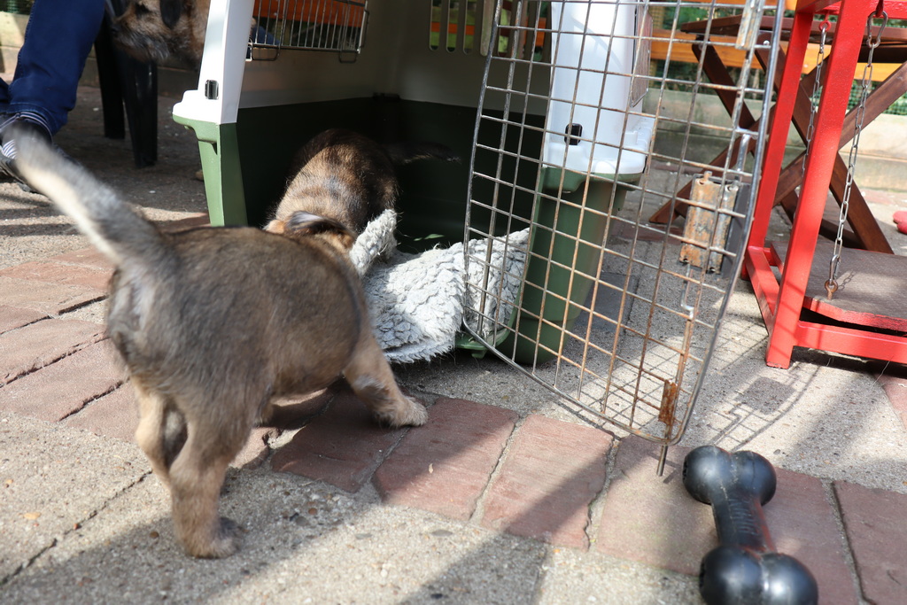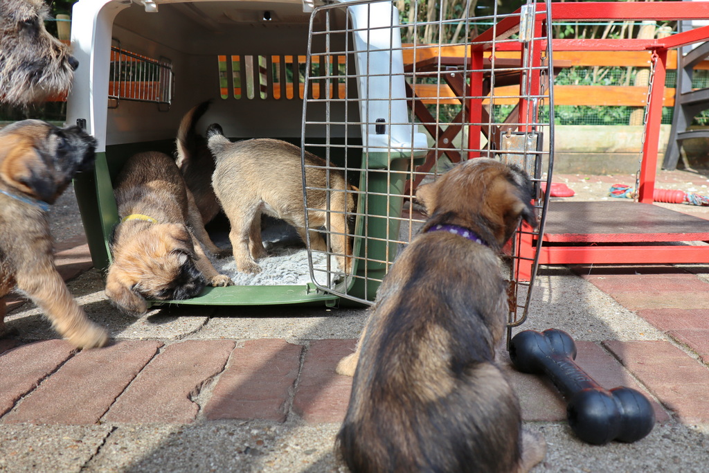 De pups moeten natuurlijk ook wennen aan een bench. We hebben daarom in de tuin vaak een bench staan. De pups kunnen er in kjken en lekker in spelen. Op die manier raken ze gewend aan de bench en vinden die heel normaal.