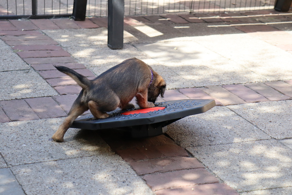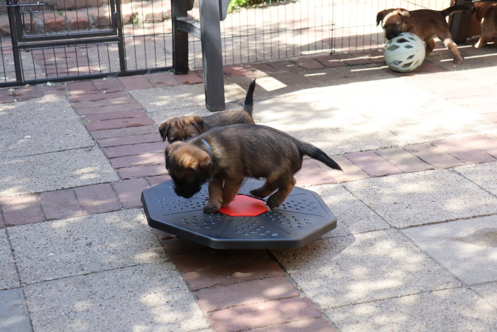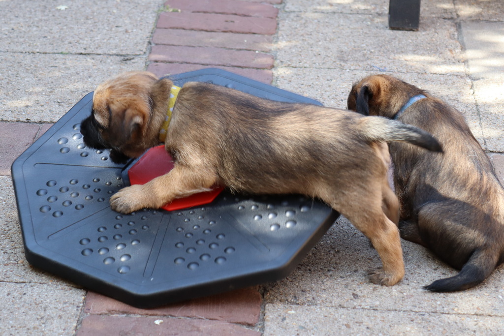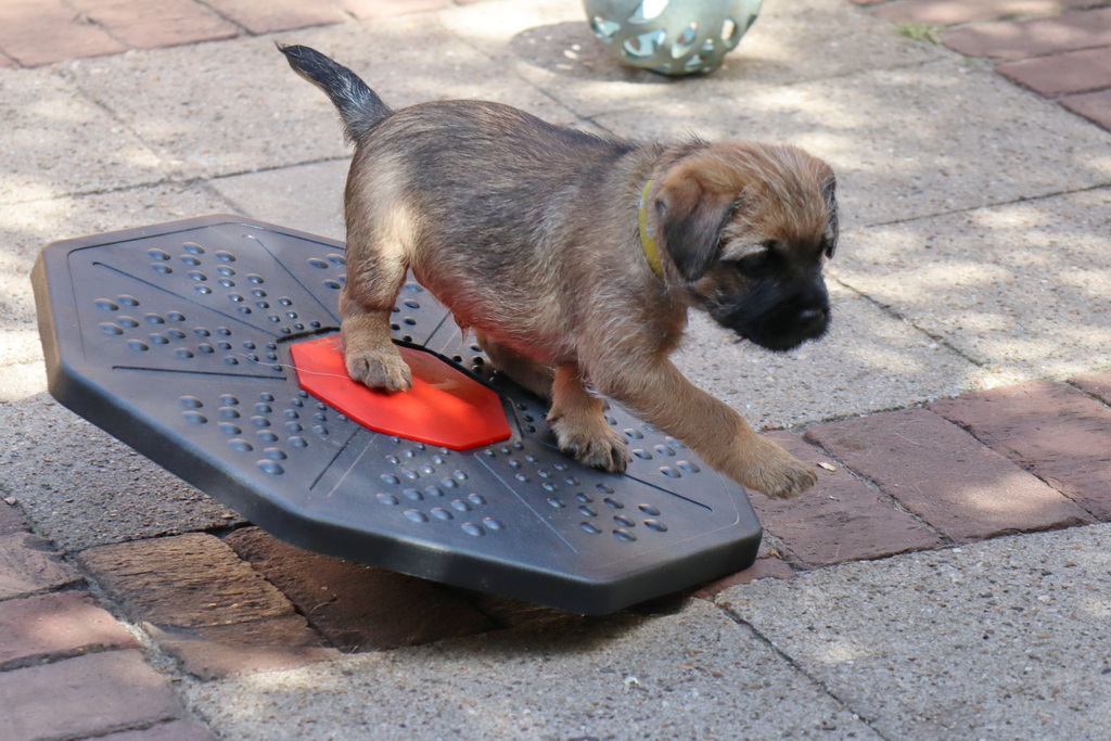 Zelf hadden wij al een evenwichtsplaat. Die is bedoeld voor mensen, maar voor de pups is het ook prachtig. Ze racen er soms overheen en lanceren zichzelf zo’n beetje. De plaat is gelukkig heel laag, dus er gebeuren geen ongelukken.