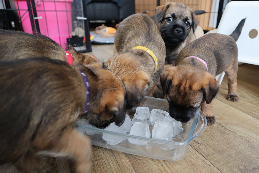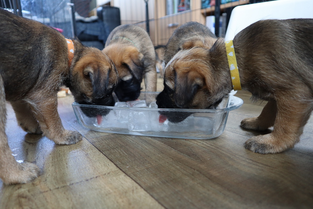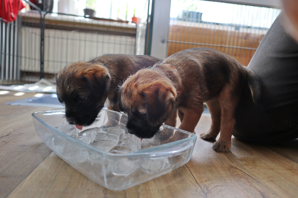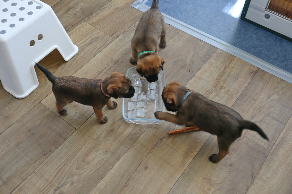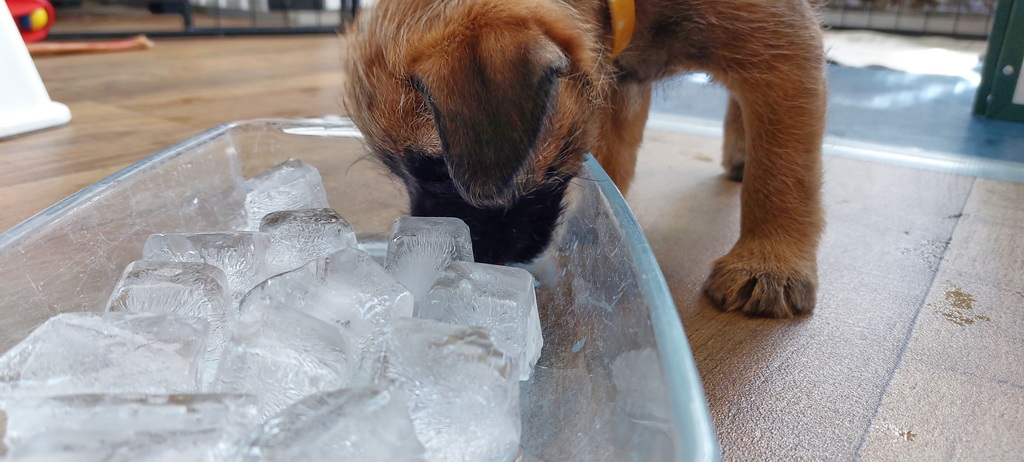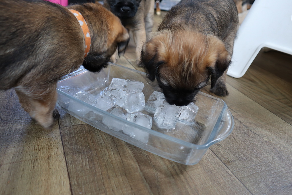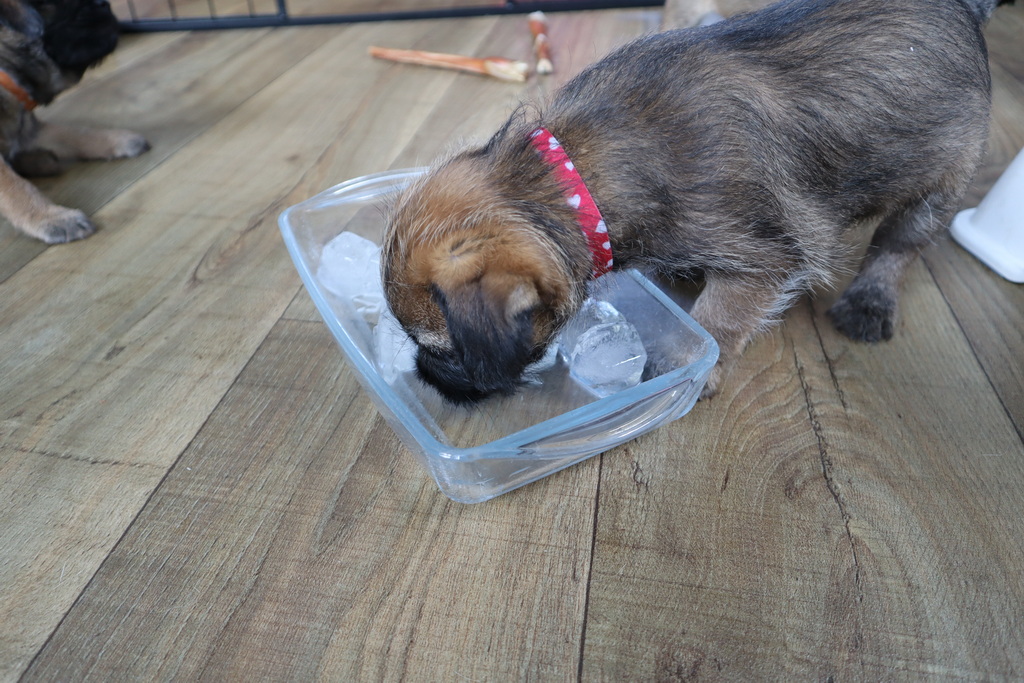 We proberen de pups met zoveel mogelijk dingen in aanraking te brengen. IJsblokjes zijn daarvan een goed voorbeeld. De pups vonden het heel interessant. Eerst was het een raar gevoel aan hun tong, maar toch ook wel lekker. Je kan er aan likken en dan wordt het water! een hele gewaarwording.