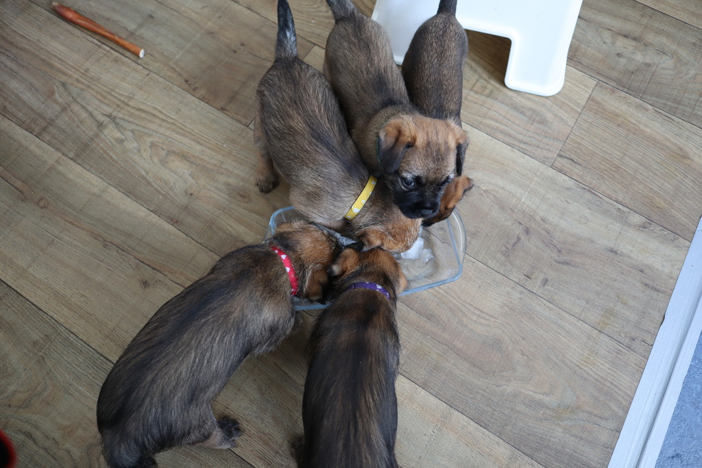 Ze krijgen Carnibest vers vlees voeding met daar door een klein beetje pap gemaakt van puppymelk. We leren ze om elk uit een eigen bakje te eten. Dat gaat heel goed, maar als er eentje wat sneller is dan de anderen gaat die toch even buurten. Proberen kan natuurlijk altijd.