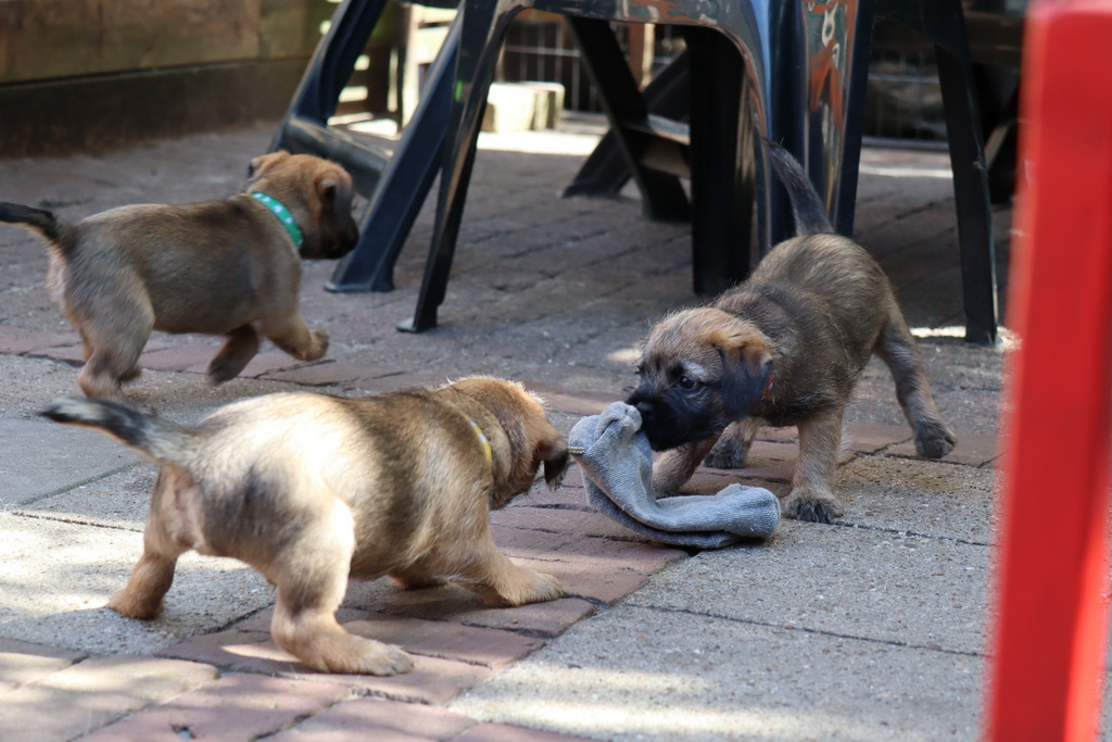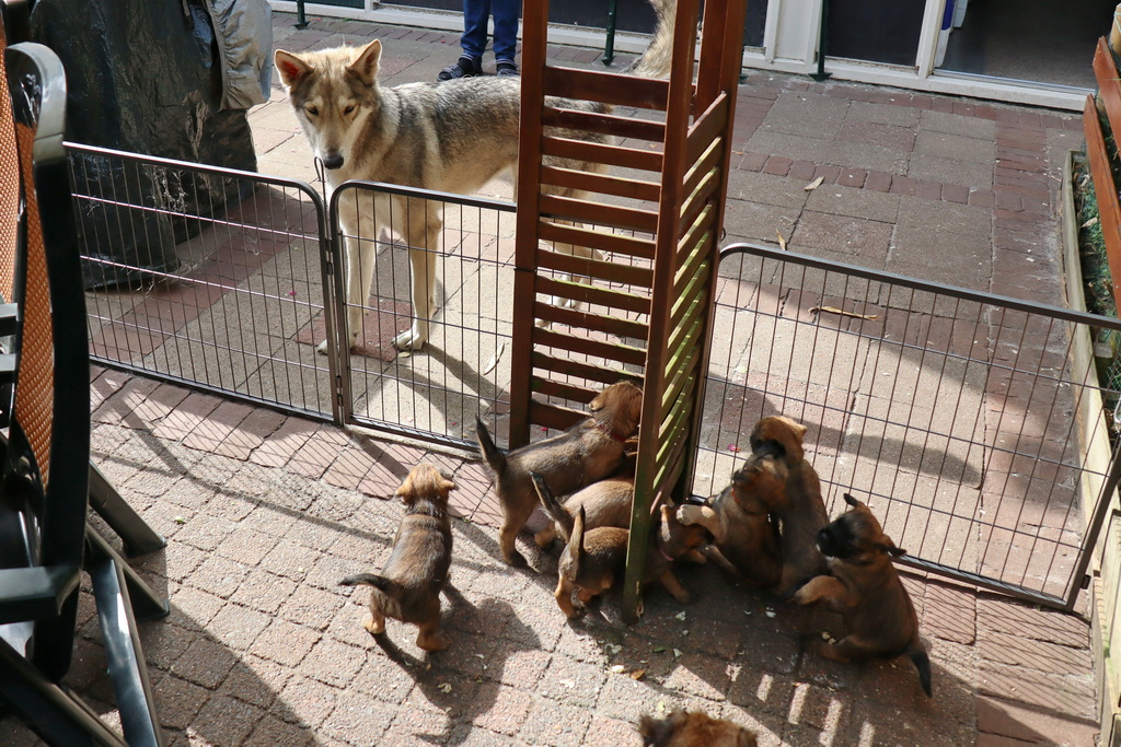 Het is lekker weer en de pups zijn er groot genoeg voor, dus de hele meute mag lekker naar buiten in de tuin.