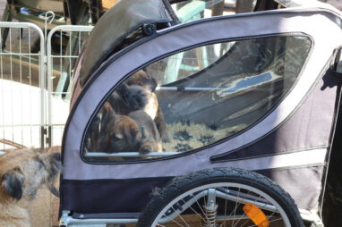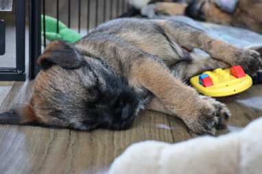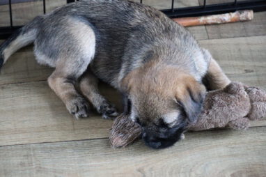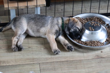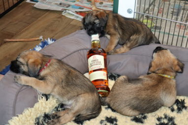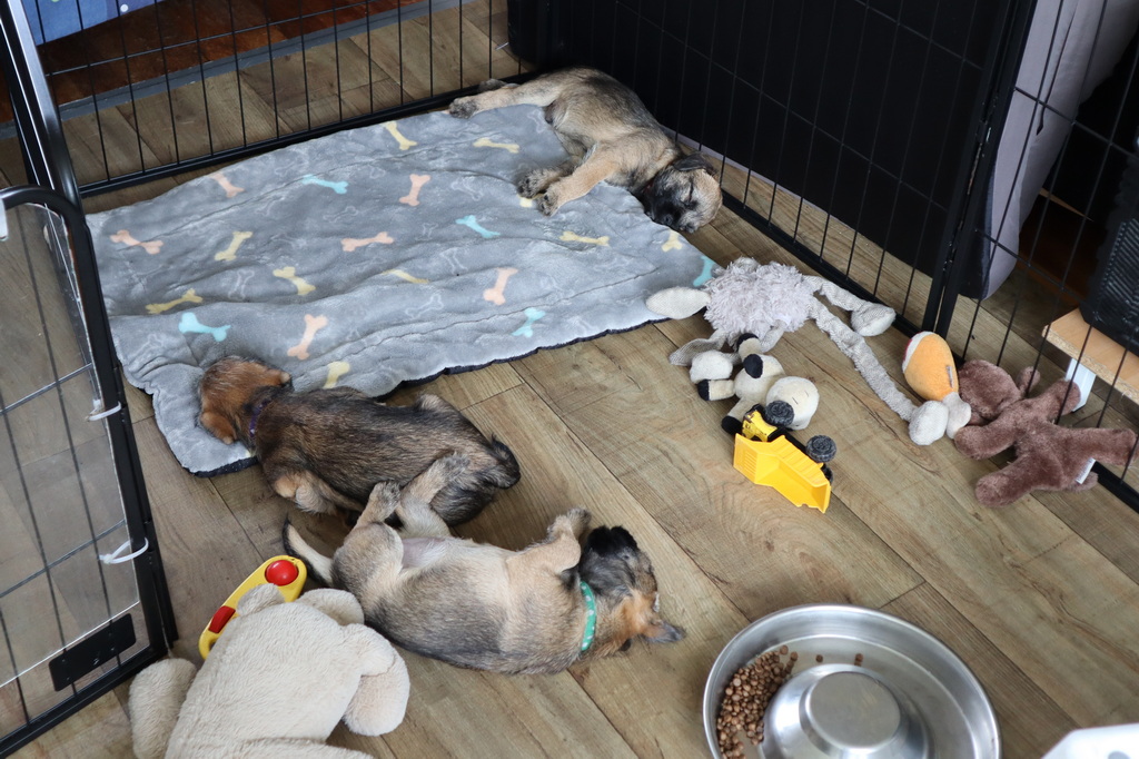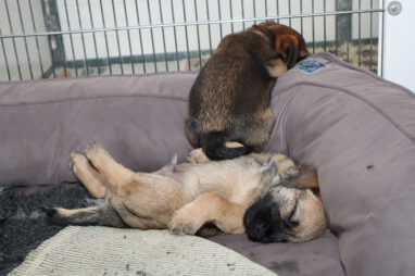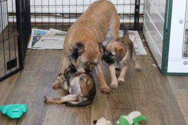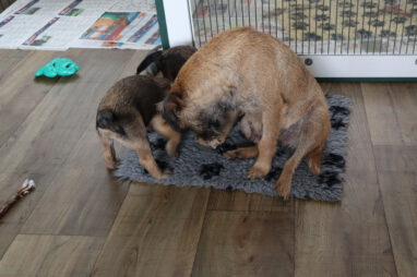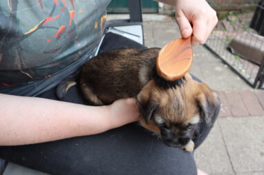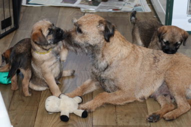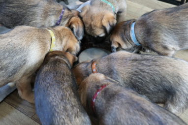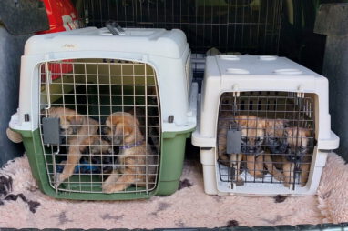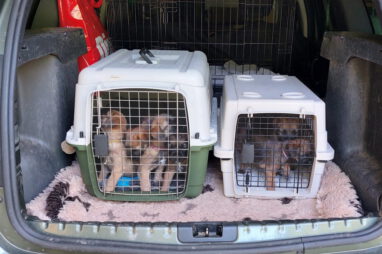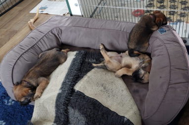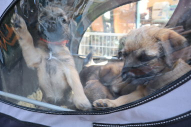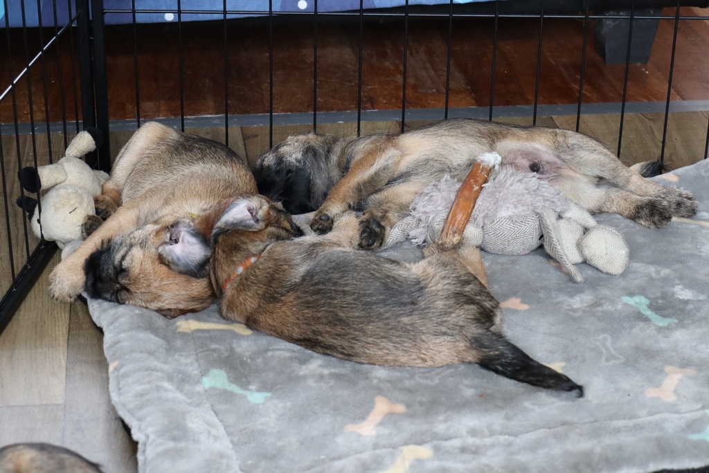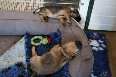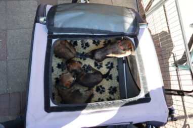 We hebben ook ritjes met de auto gemaakt en dan helpt het als de pups al bekend zijn met een bench. Er werd niemand wagenziek.