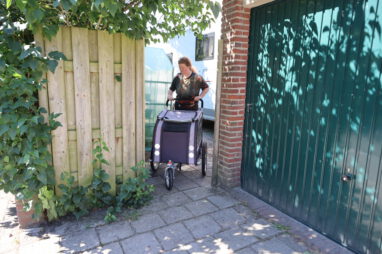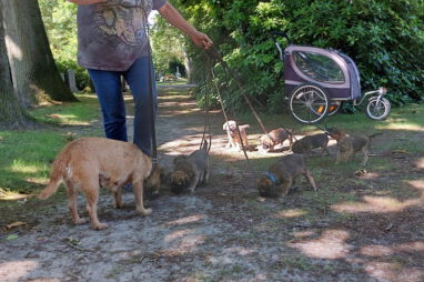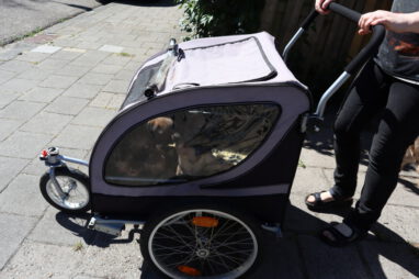 En we zijn op pad geweest met de hondenbuggy. Dat was spannend!. Naar de begraafplaats om daar lekker rustig te kunnen oefenen met wandelen aan de riem. Maar zeven pups uit de knoop houden is een hele opgave.