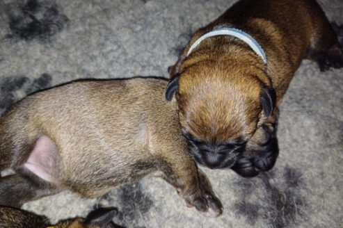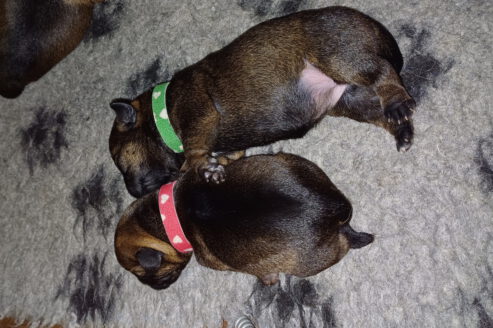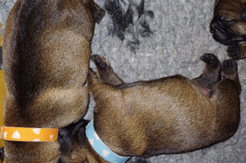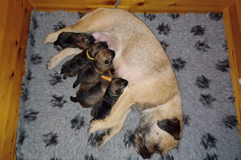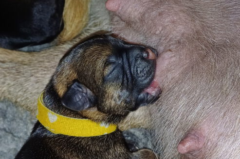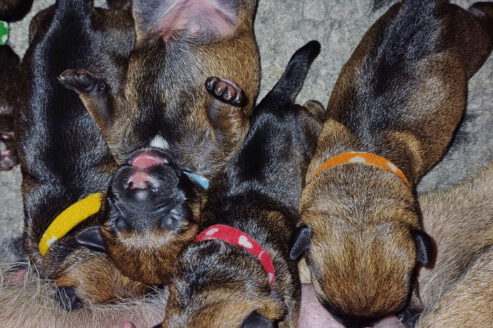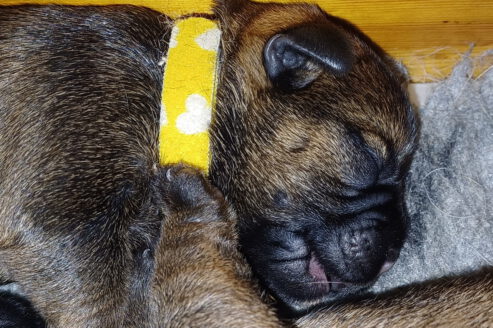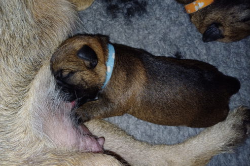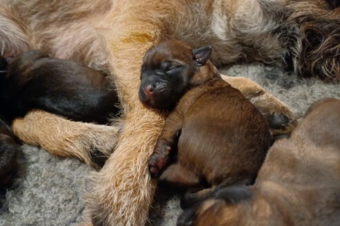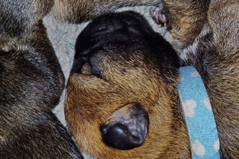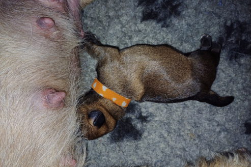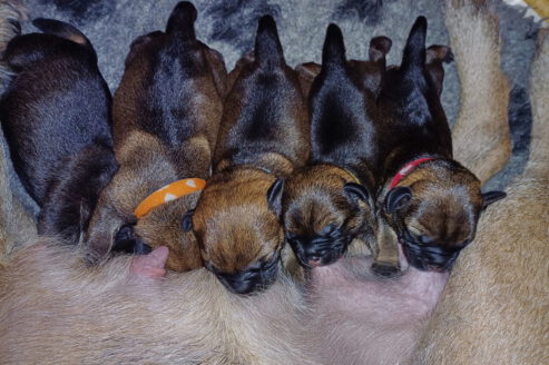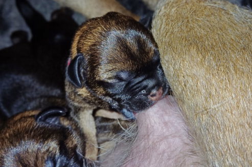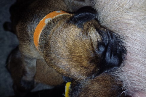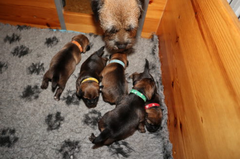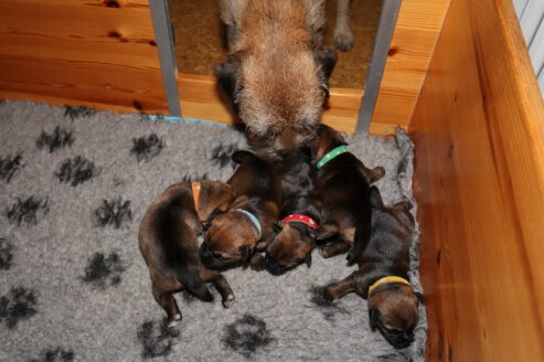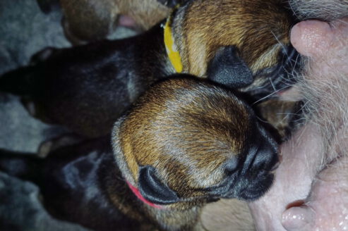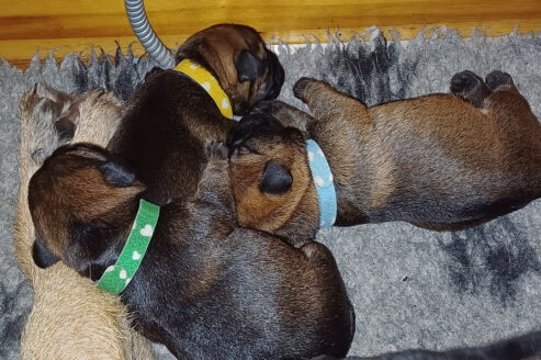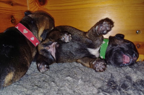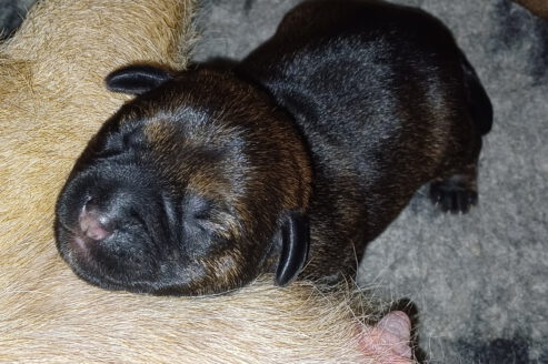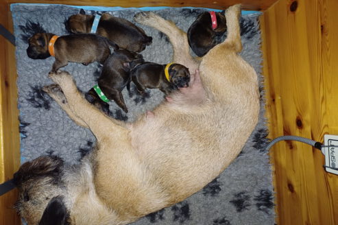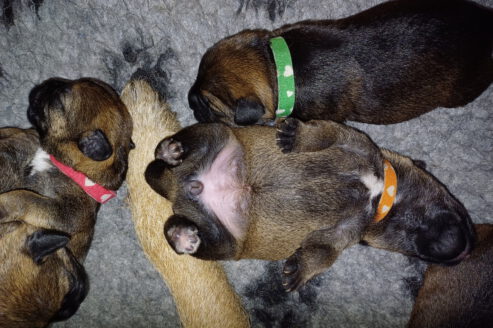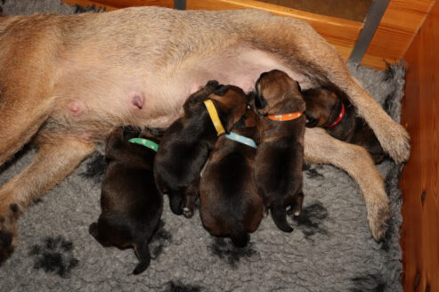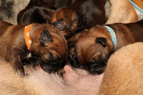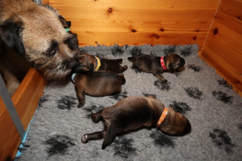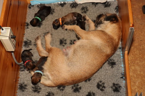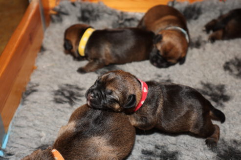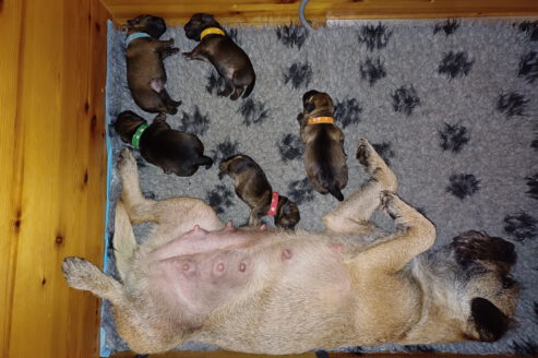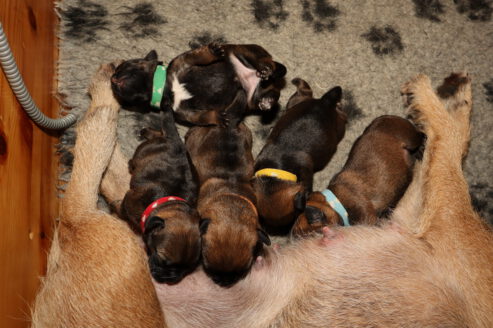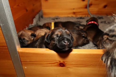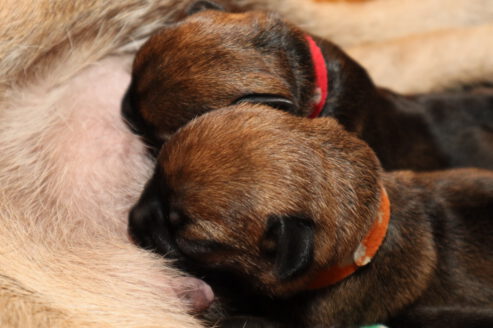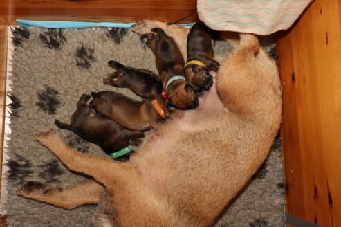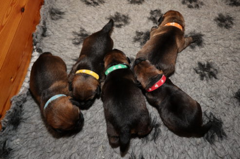 Het S-nest is alweer een week oud. Het gaat heel goed, zowel met de puppy’s als met Rosie. Na de vlot verlopen bevalling heeft Rosie heel snel de routine van het zogen en verzorgen van haar kroost opgepakt. Ze doet het uitstekend en is echt een hele goede moeder. En dan te bedenken dat dat haar eerste nest is. Ze houdt de puppy’s heel goed schoon en ligt klaar voor het zogen als de puppy’s weer honger hebben. Melk heeft Rosie genoeg, soms geeft ze zoveel dat het bij de pups de neus weer uit komt. Ook het poetsen na het zogen doet Rosie heel goed. De werpkist, waar de pups de eerste twee weken in liggen, houdt ze ook perfect schoon. Er is nauwelijks iets schoon te maken voor ons.