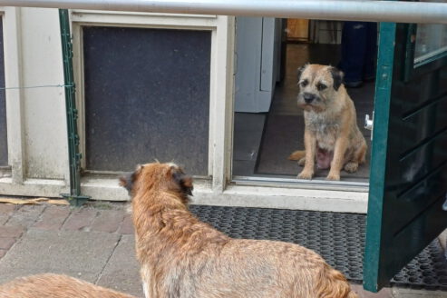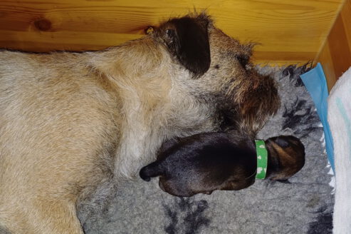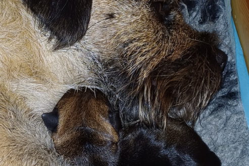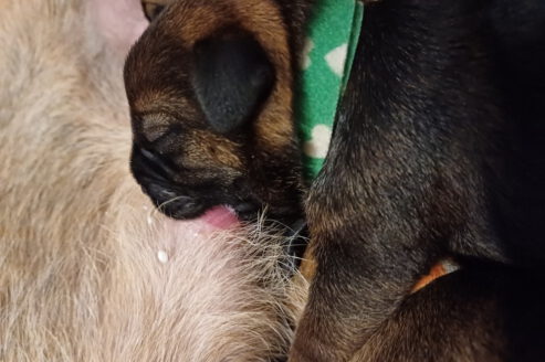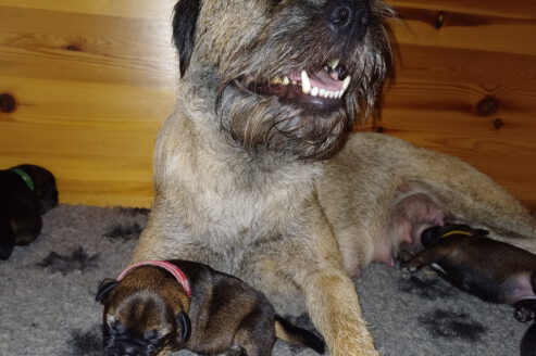 Rosie is heel zorgzaam voor haar pups. Als er maar eentje een piepje geeft staat Rosie er al bij om te kijken wat er aan de hand is. Ze houdt ze goed in de gaten. De eerste dagen wilde ze alleen heel even bij de pups weg om zelf te poepen en te plassen en dan snel weer terug. Nu wordt ze daar wat makkelijker in. Als ze allemaal lekker liggen te slapen na een zoogbeurt neemt Rosie steeds beter haar eigen rust of komt ze even beneden relaxen bij haar moeder en opa.