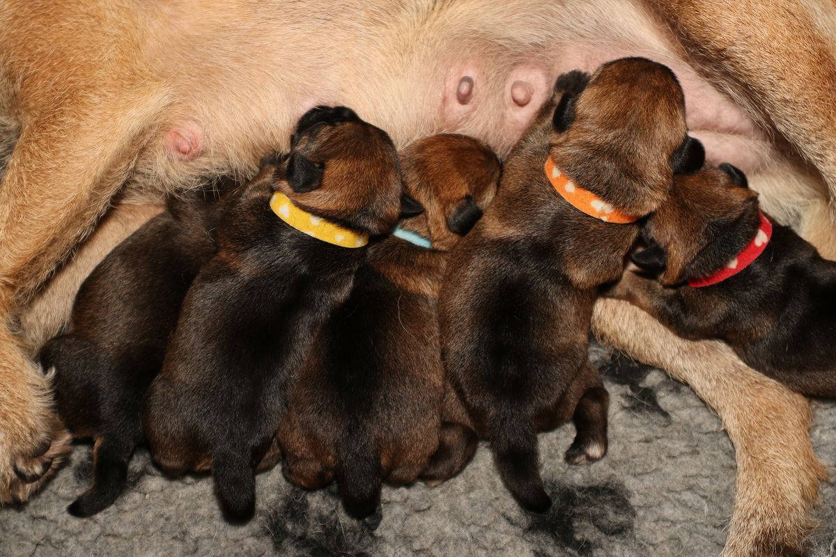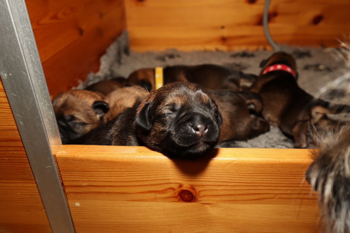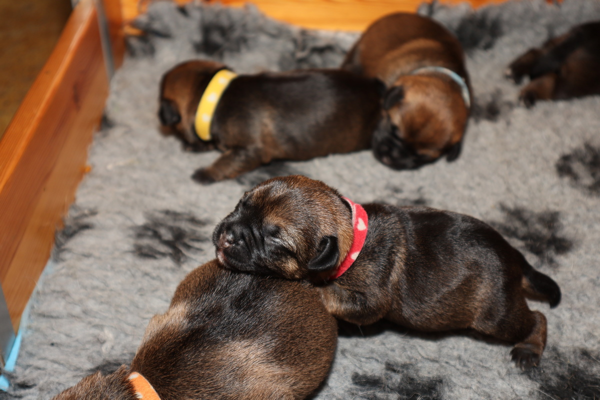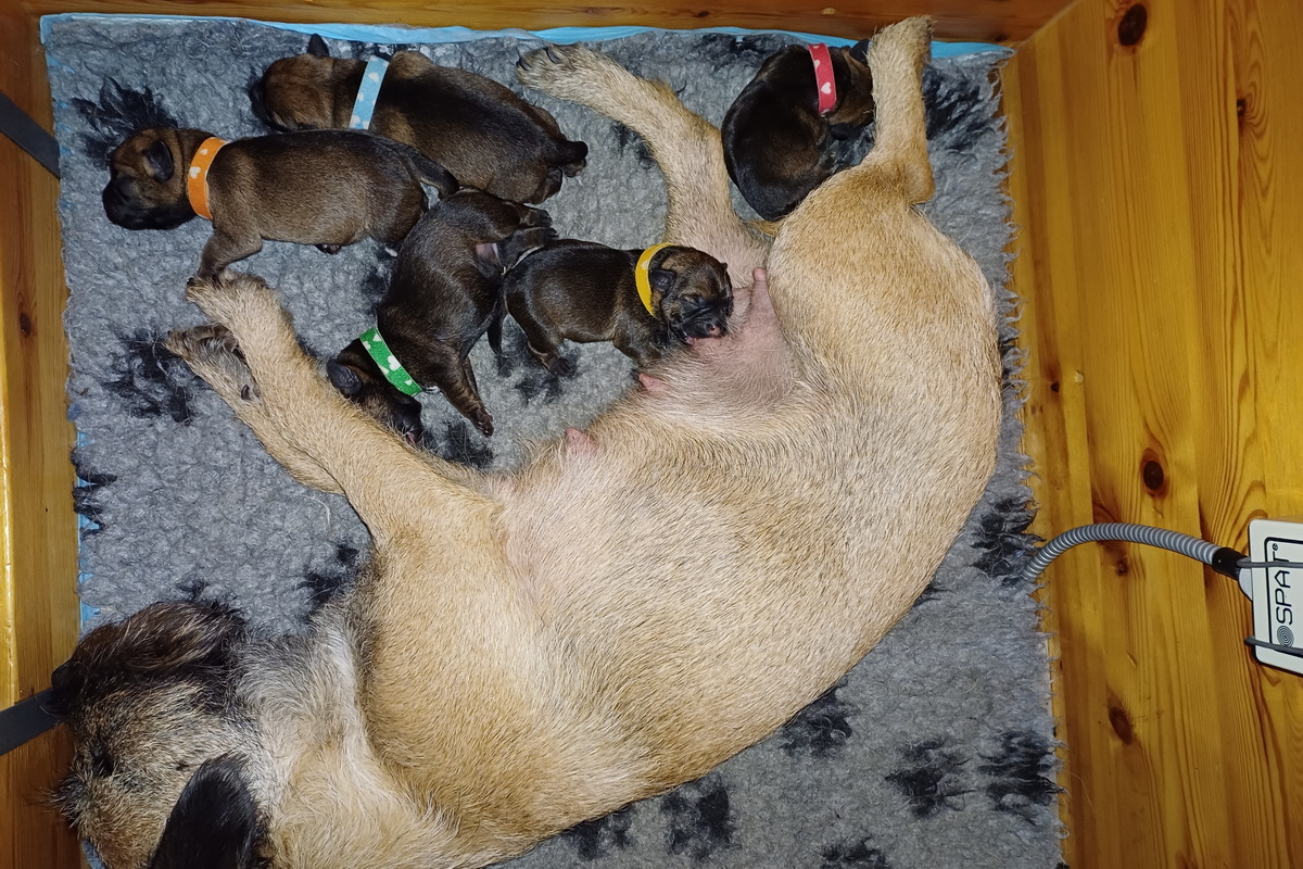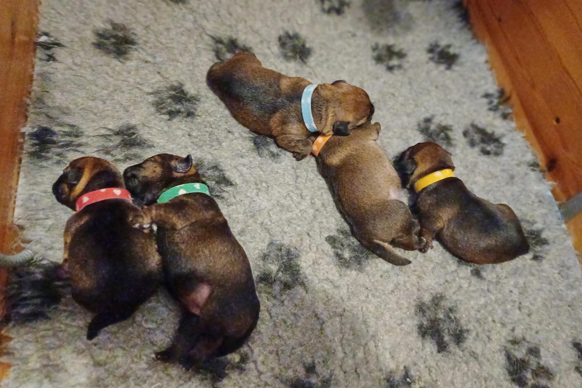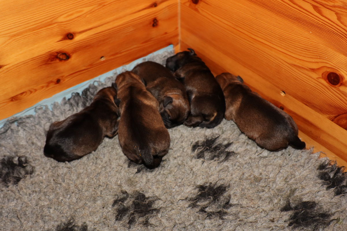 Het S-nest is alweer een week oud. Het gaat heel goed, zowel met de puppy’s als met Rosie. Na de vlot verlopen bevalling heeft Rosie heel snel de routine van het zogen en verzorgen van haar kroost opgepakt. Ze doet het uitstekend en is echt een hele goede moeder. En dan te bedenken dat dat haar eerste nest is. Ze houdt de puppy’s heel goed schoon en ligt klaar voor het zogen als de puppy’s weer honger hebben. Melk heeft Rosie genoeg, soms geeft ze zoveel dat het bij de pups de neus weer uit komt. Ook het poetsen na het zogen doet Rosie heel goed. De werpkist, waar de pups de eerste twee weken in liggen, houdt ze ook perfect schoon. Er is nauwelijks iets schoon te maken voor ons.