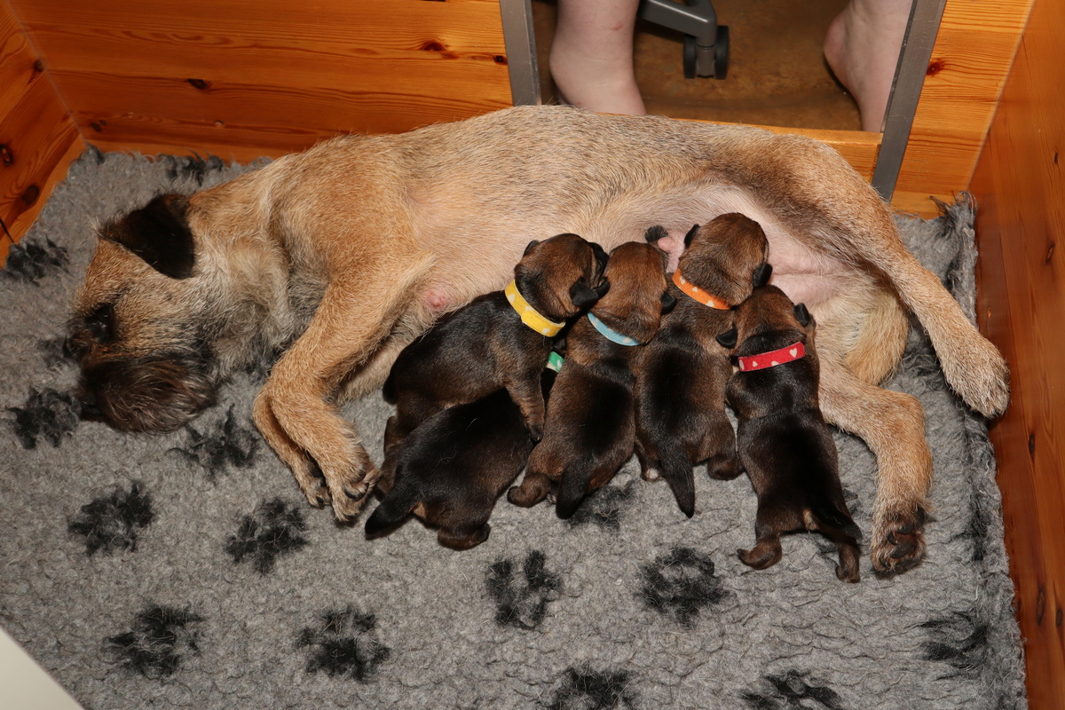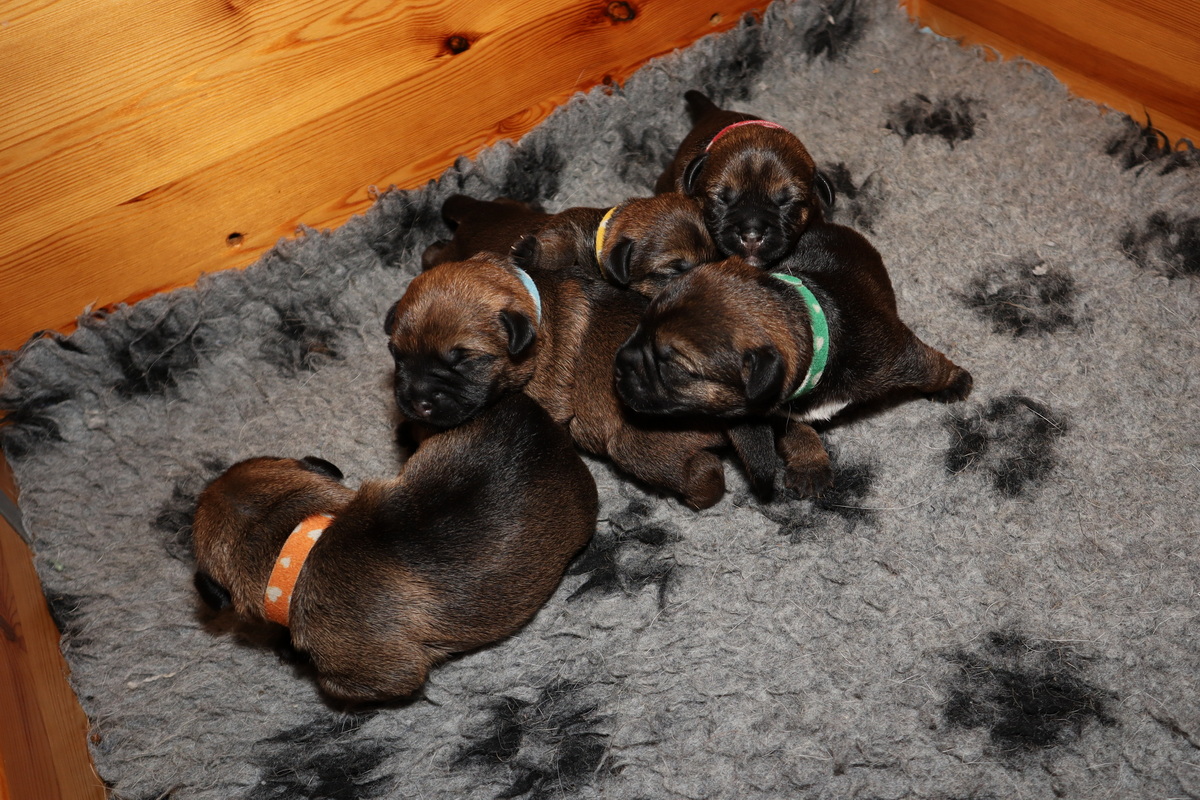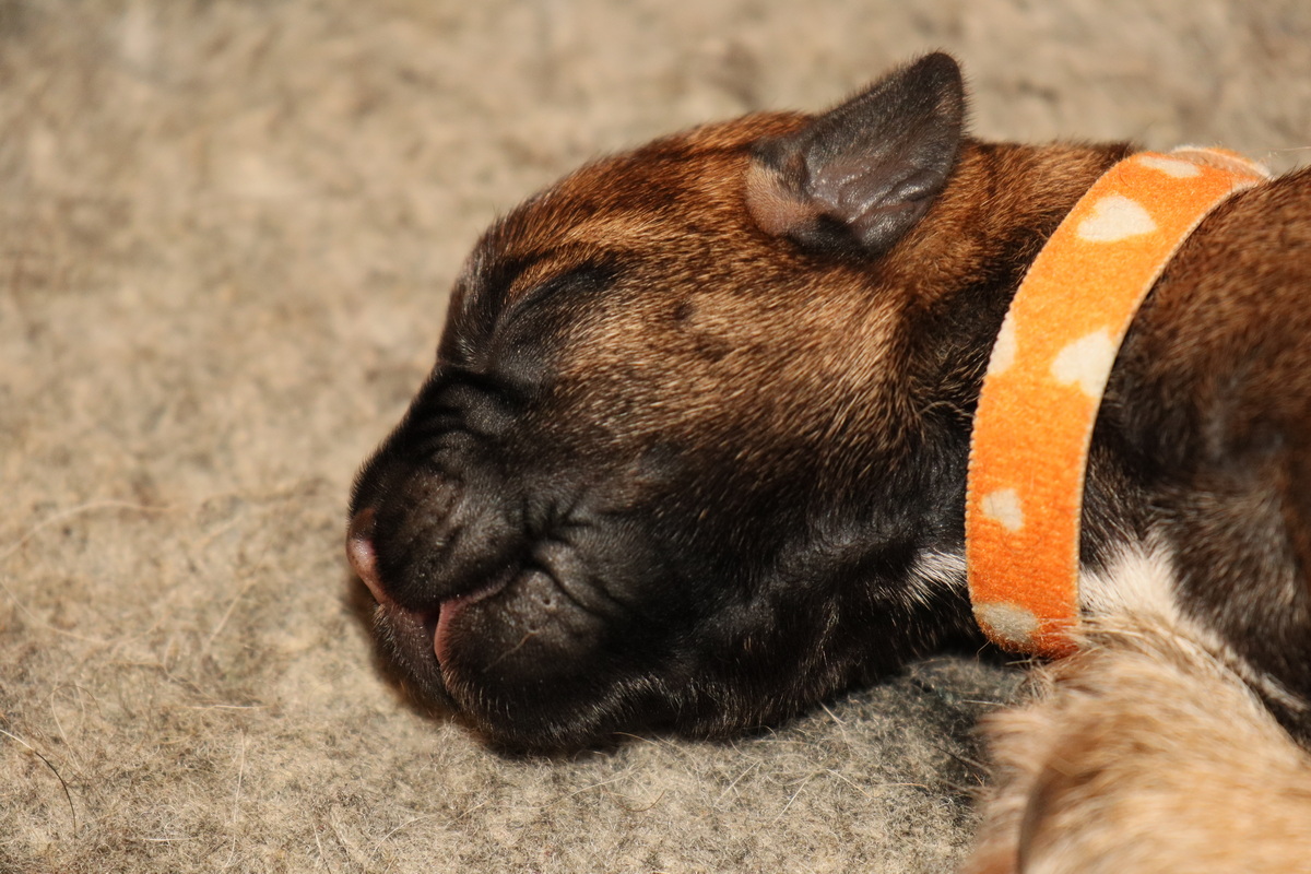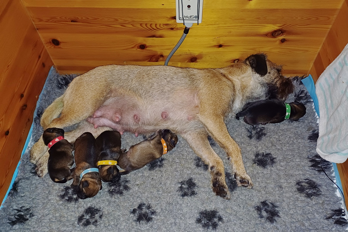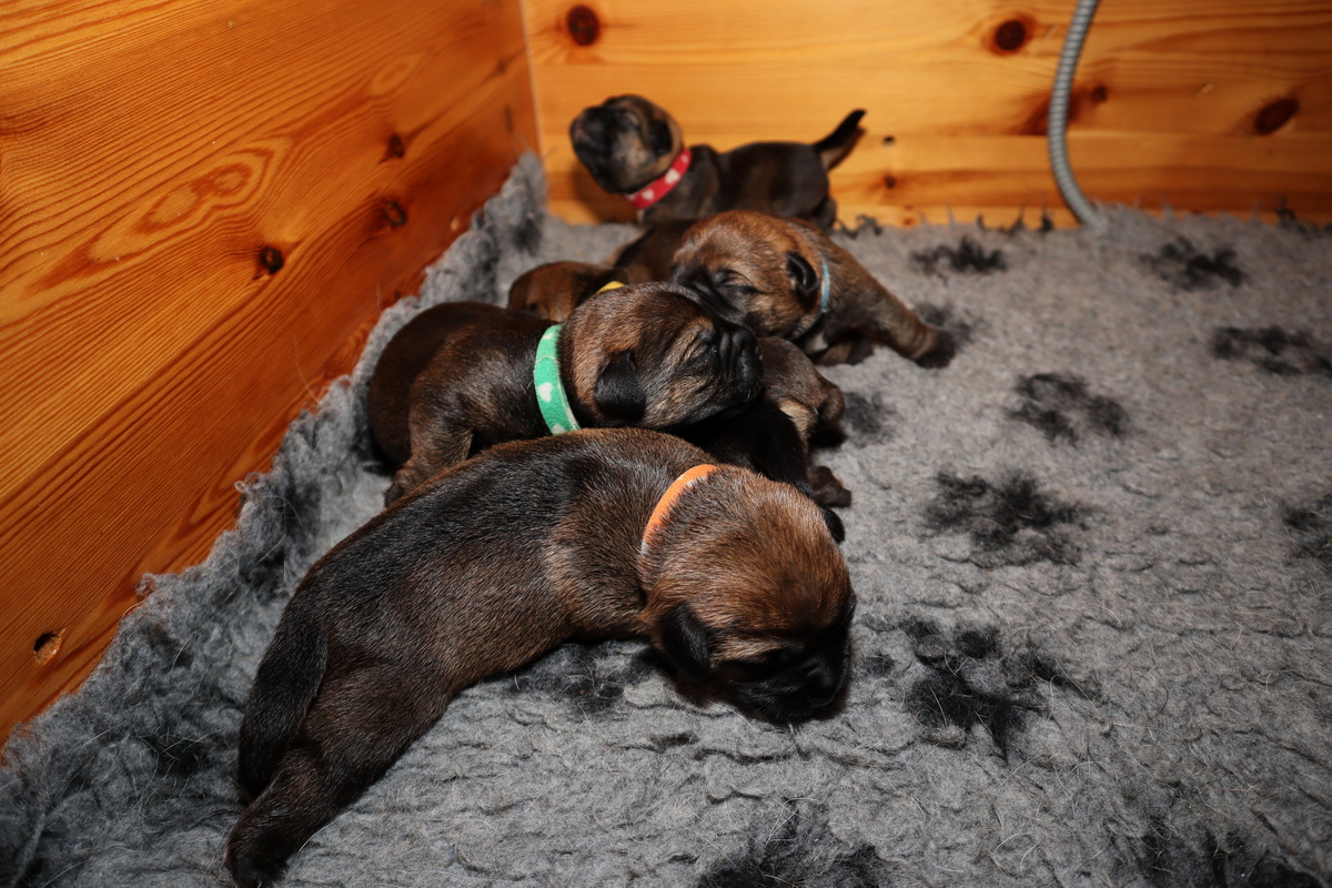 Het S-nest is alweer een week oud. Het gaat heel goed, zowel met de puppy’s als met Rosie. Na de vlot verlopen bevalling heeft Rosie heel snel de routine van het zogen en verzorgen van haar kroost opgepakt. Ze doet het uitstekend en is echt een hele goede moeder. En dan te bedenken dat dat haar eerste nest is. Ze houdt de puppy’s heel goed schoon en ligt klaar voor het zogen als de puppy’s weer honger hebben. Melk heeft Rosie genoeg, soms geeft ze zoveel dat het bij de pups de neus weer uit komt. Ook het poetsen na het zogen doet Rosie heel goed. De werpkist, waar de pups de eerste twee weken in liggen, houdt ze ook perfect schoon. Er is nauwelijks iets schoon te maken voor ons.