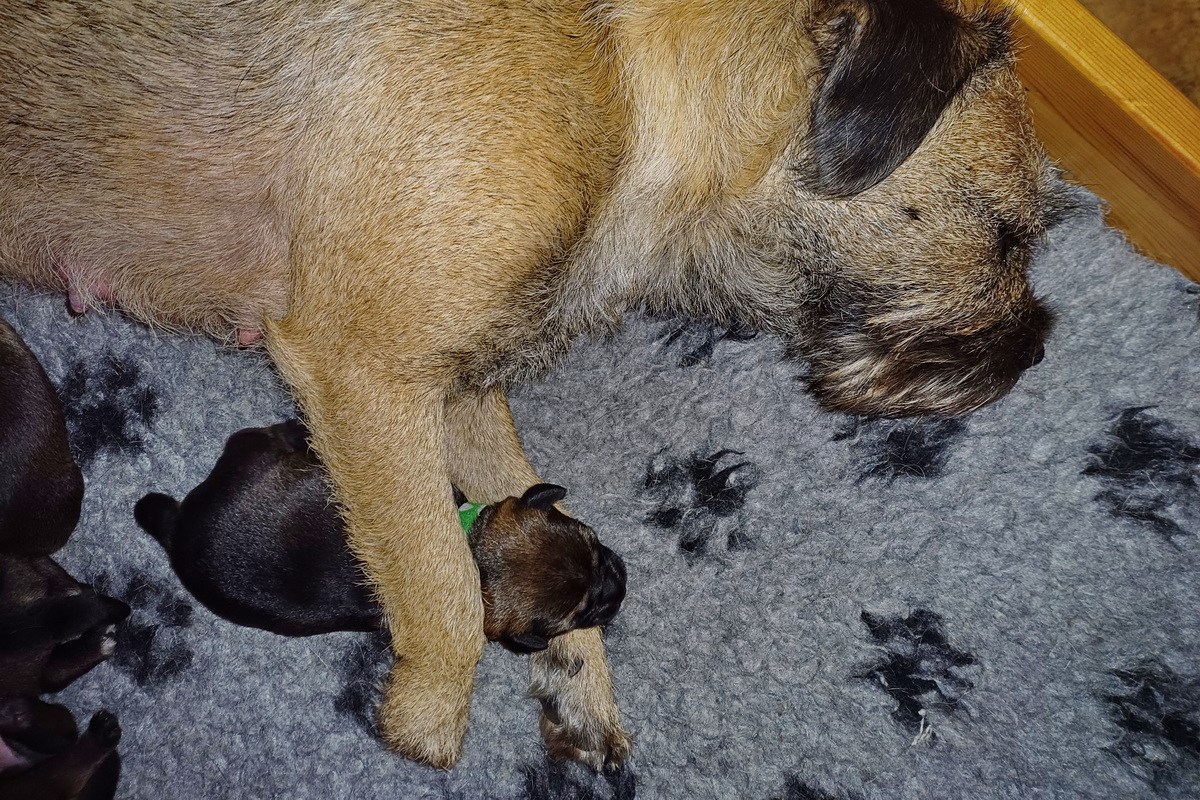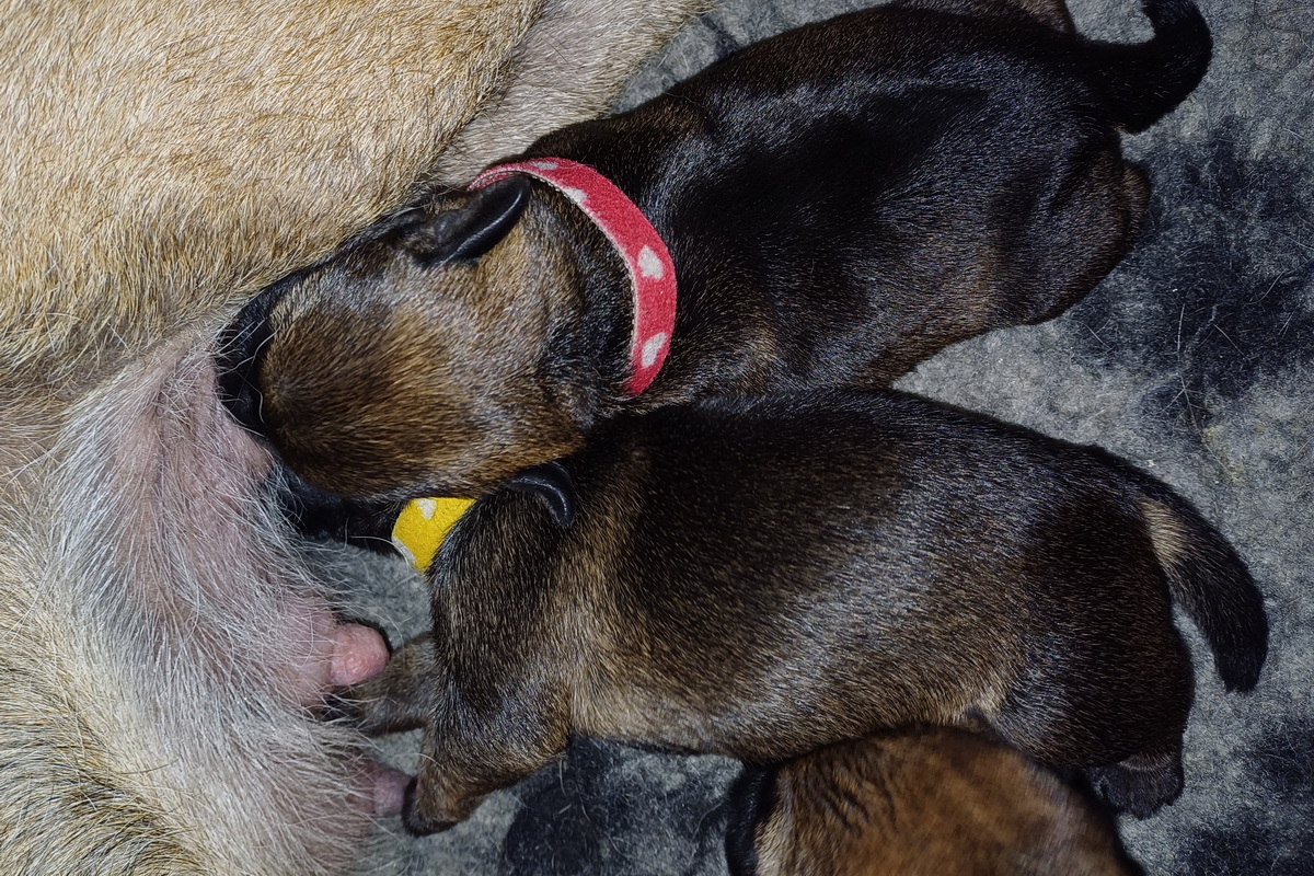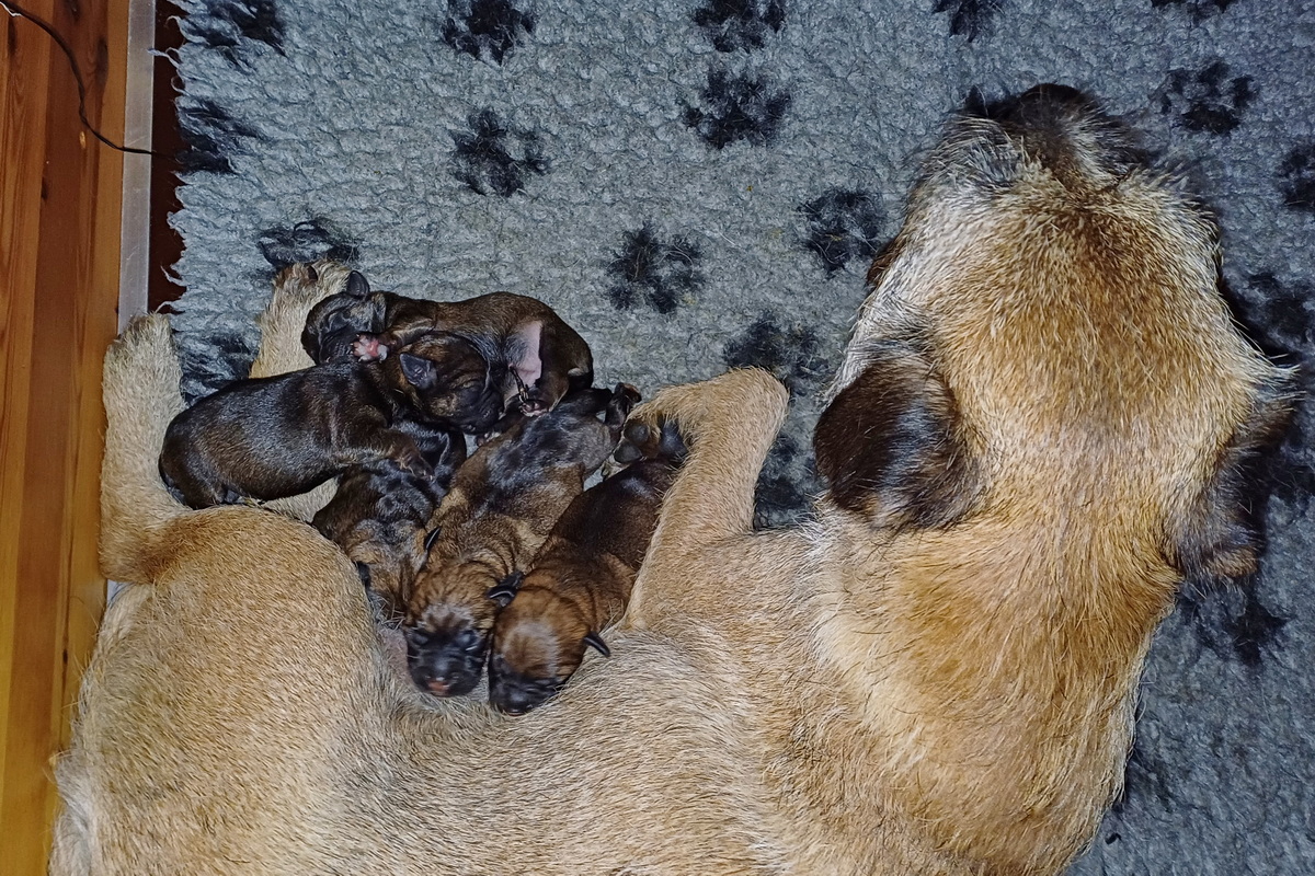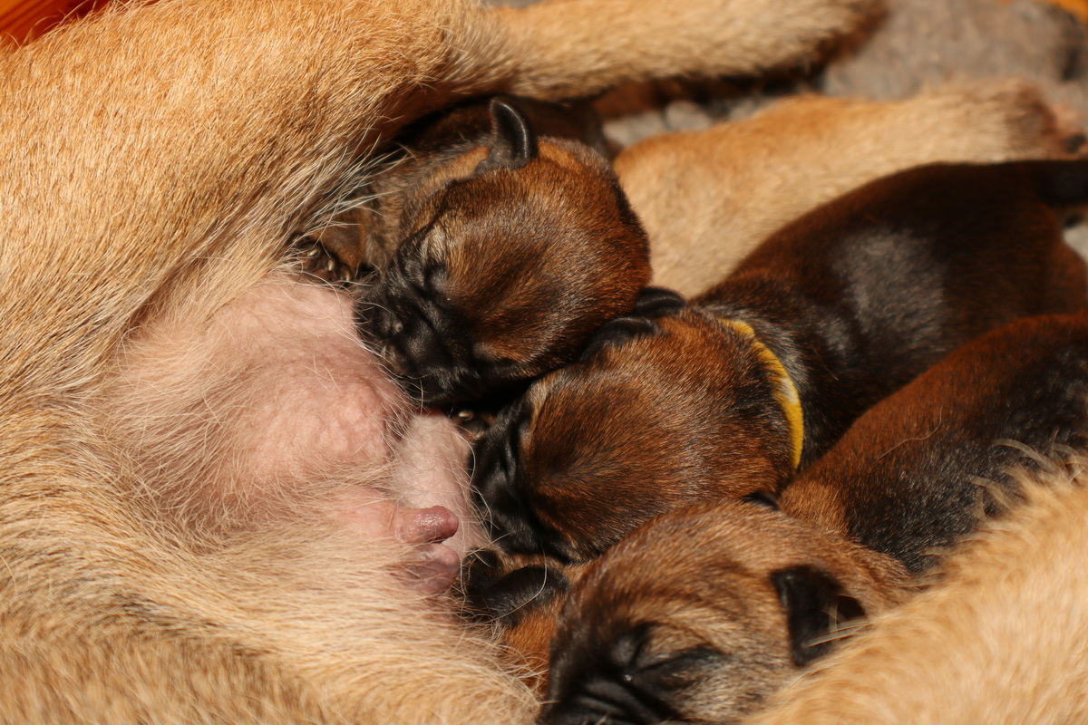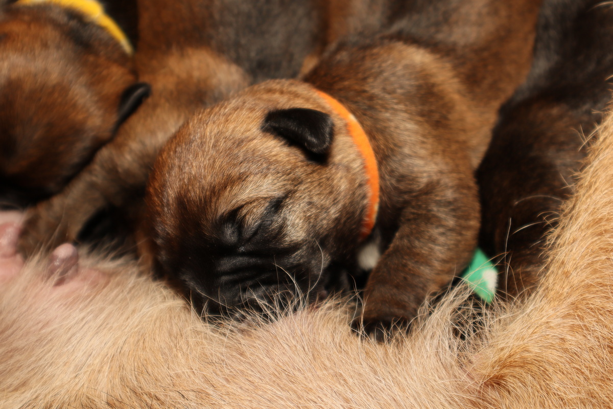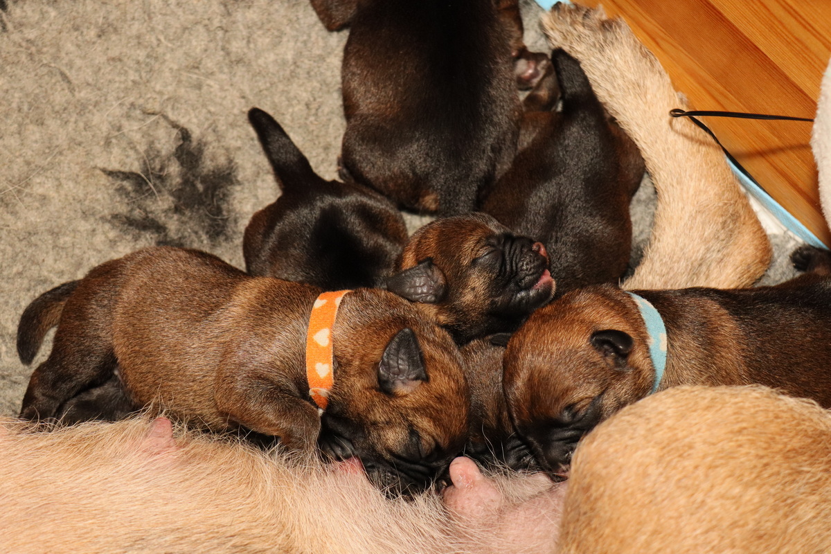 Het S-nest is alweer een week oud. Het gaat heel goed, zowel met de puppy’s als met Rosie. Na de vlot verlopen bevalling heeft Rosie heel snel de routine van het zogen en verzorgen van haar kroost opgepakt. Ze doet het uitstekend en is echt een hele goede moeder. En dan te bedenken dat dat haar eerste nest is. Ze houdt de puppy’s heel goed schoon en ligt klaar voor het zogen als de puppy’s weer honger hebben. Melk heeft Rosie genoeg, soms geeft ze zoveel dat het bij de pups de neus weer uit komt. Ook het poetsen na het zogen doet Rosie heel goed. De werpkist, waar de pups de eerste twee weken in liggen, houdt ze ook perfect schoon. Er is nauwelijks iets schoon te maken voor ons.