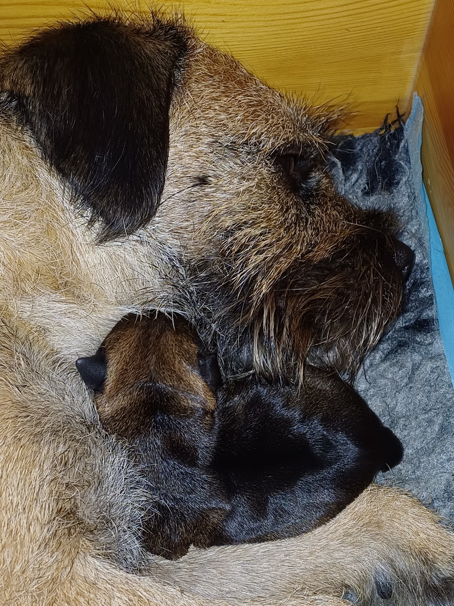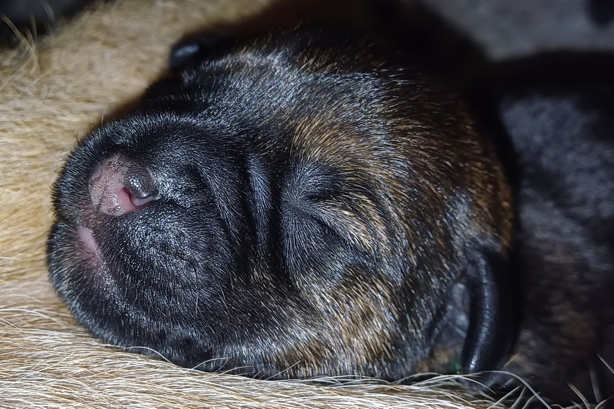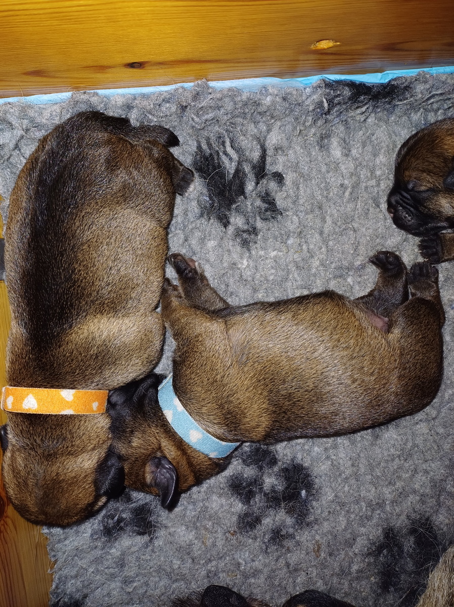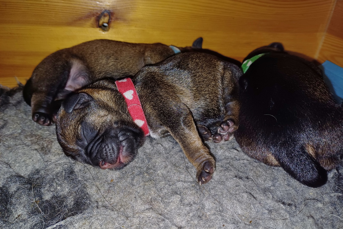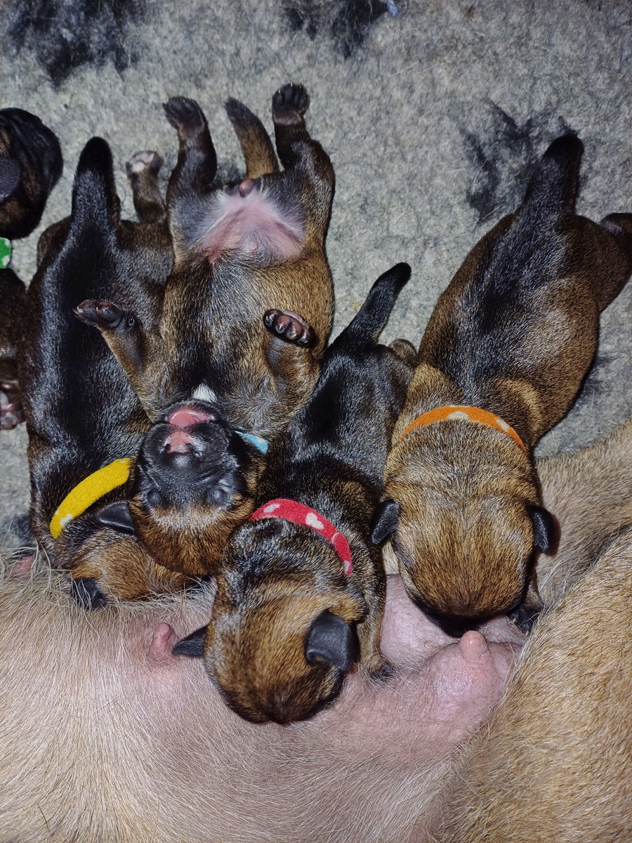 Het S-nest is alweer een week oud. Het gaat heel goed, zowel met de puppy’s als met Rosie. Na de vlot verlopen bevalling heeft Rosie heel snel de routine van het zogen en verzorgen van haar kroost opgepakt. Ze doet het uitstekend en is echt een hele goede moeder. En dan te bedenken dat dat haar eerste nest is. Ze houdt de puppy’s heel goed schoon en ligt klaar voor het zogen als de puppy’s weer honger hebben. Melk heeft Rosie genoeg, soms geeft ze zoveel dat het bij de pups de neus weer uit komt. Ook het poetsen na het zogen doet Rosie heel goed. De werpkist, waar de pups de eerste twee weken in liggen, houdt ze ook perfect schoon. Er is nauwelijks iets schoon te maken voor ons.