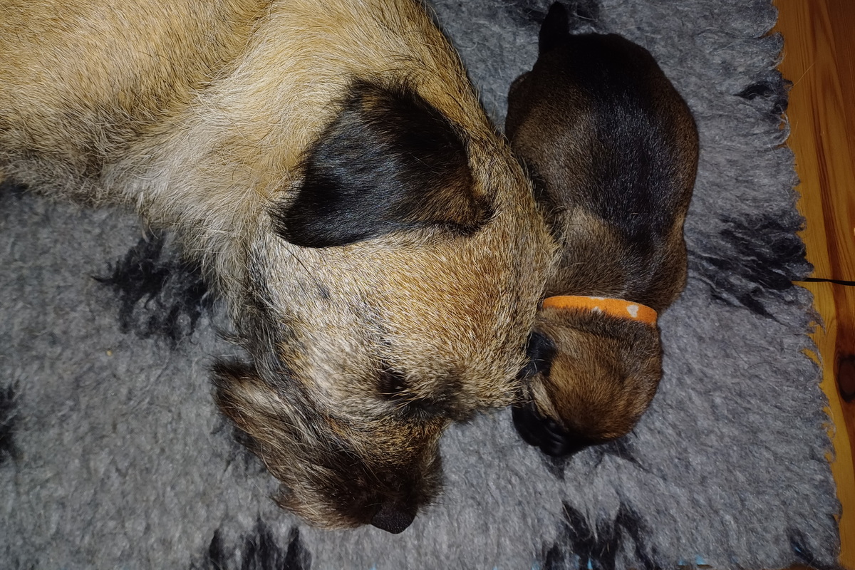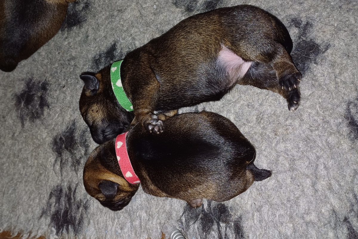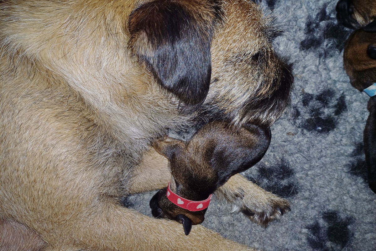 Rosie is heel zorgzaam voor haar pups. Als er maar eentje een piepje geeft staat Rosie er al bij om te kijken wat er aan de hand is. Ze houdt ze goed in de gaten. De eerste dagen wilde ze alleen heel even bij de pups weg om zelf te poepen en te plassen en dan snel weer terug. Nu wordt ze daar wat makkelijker in. Als ze allemaal lekker liggen te slapen na een zoogbeurt neemt Rosie steeds beter haar eigen rust of komt ze even beneden relaxen bij haar moeder en opa.