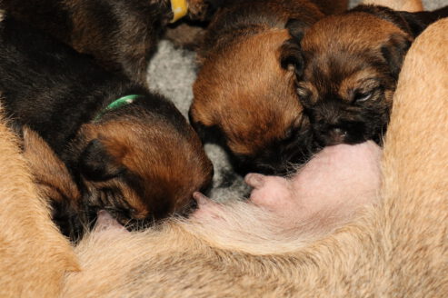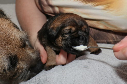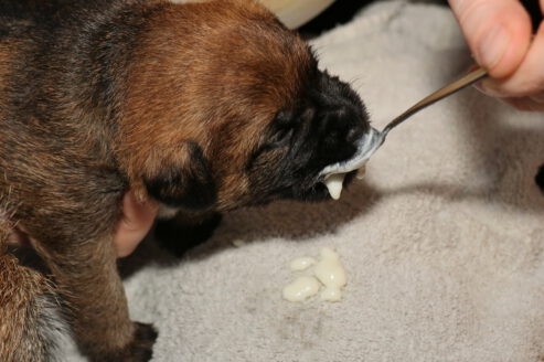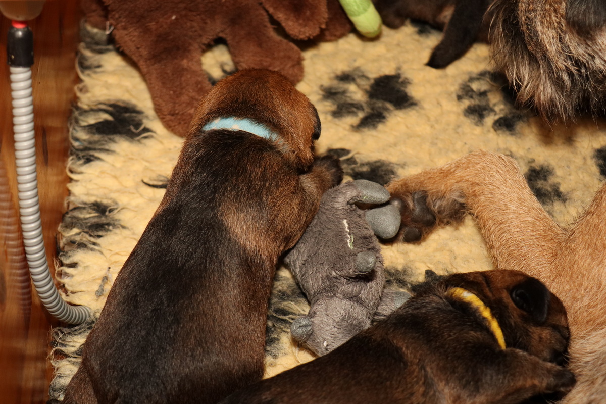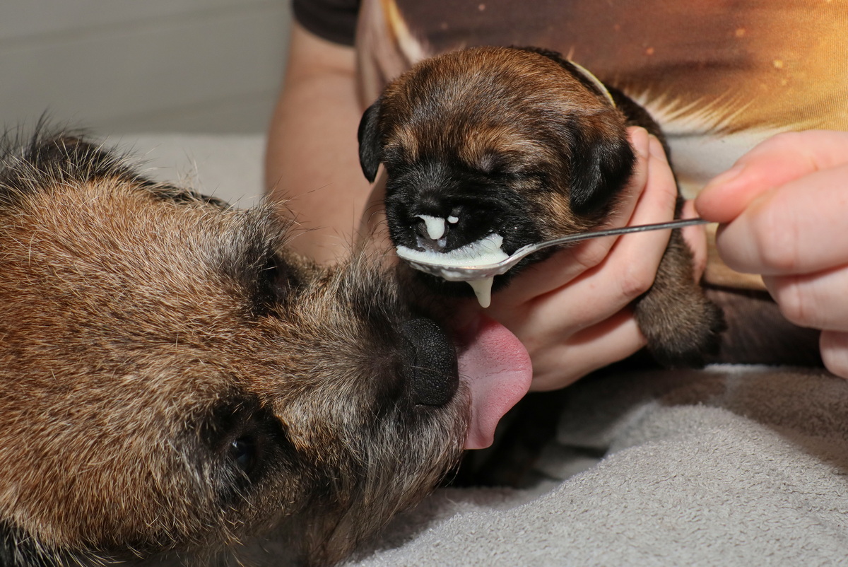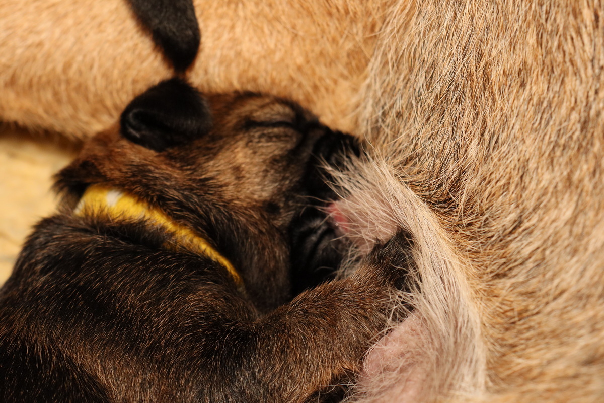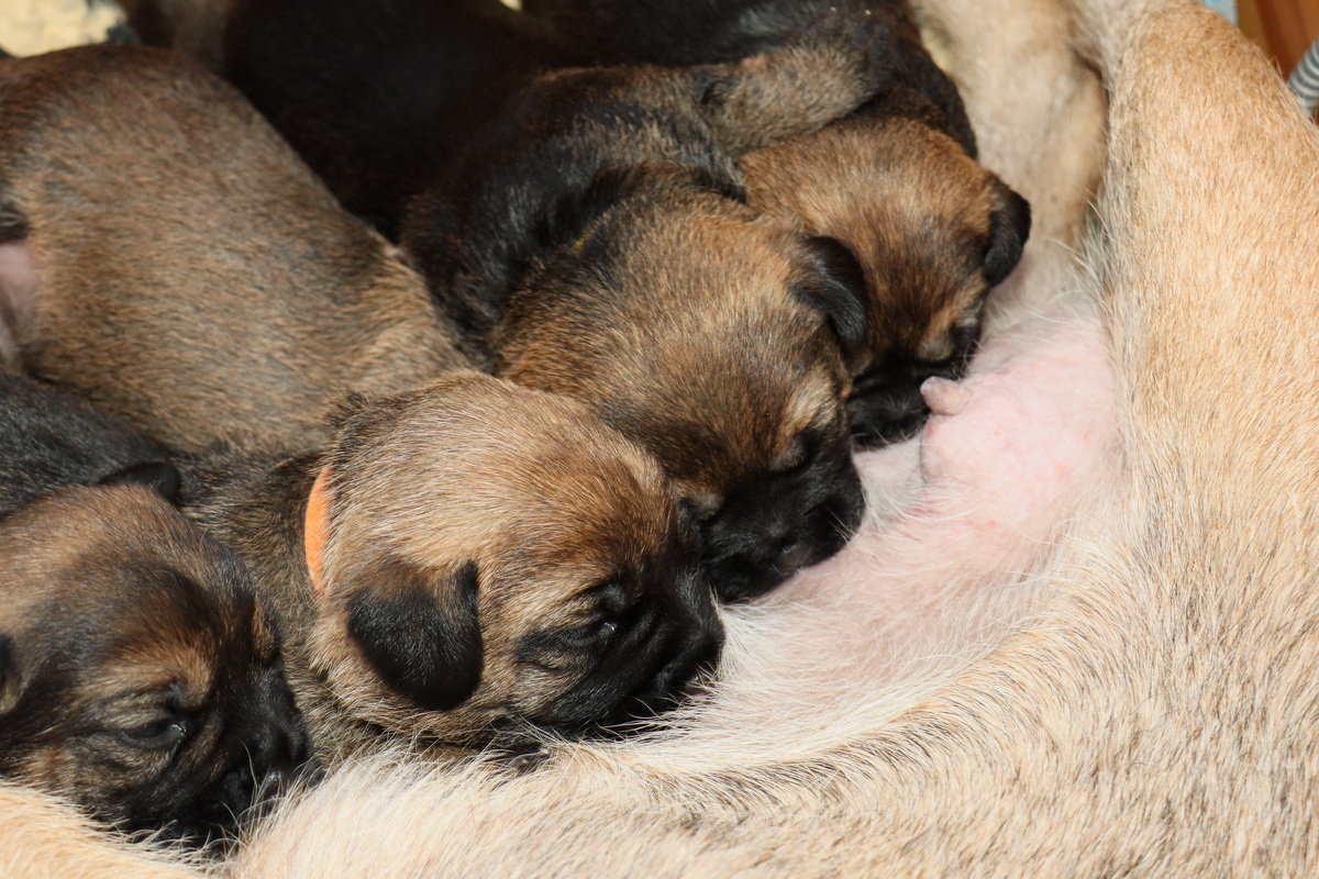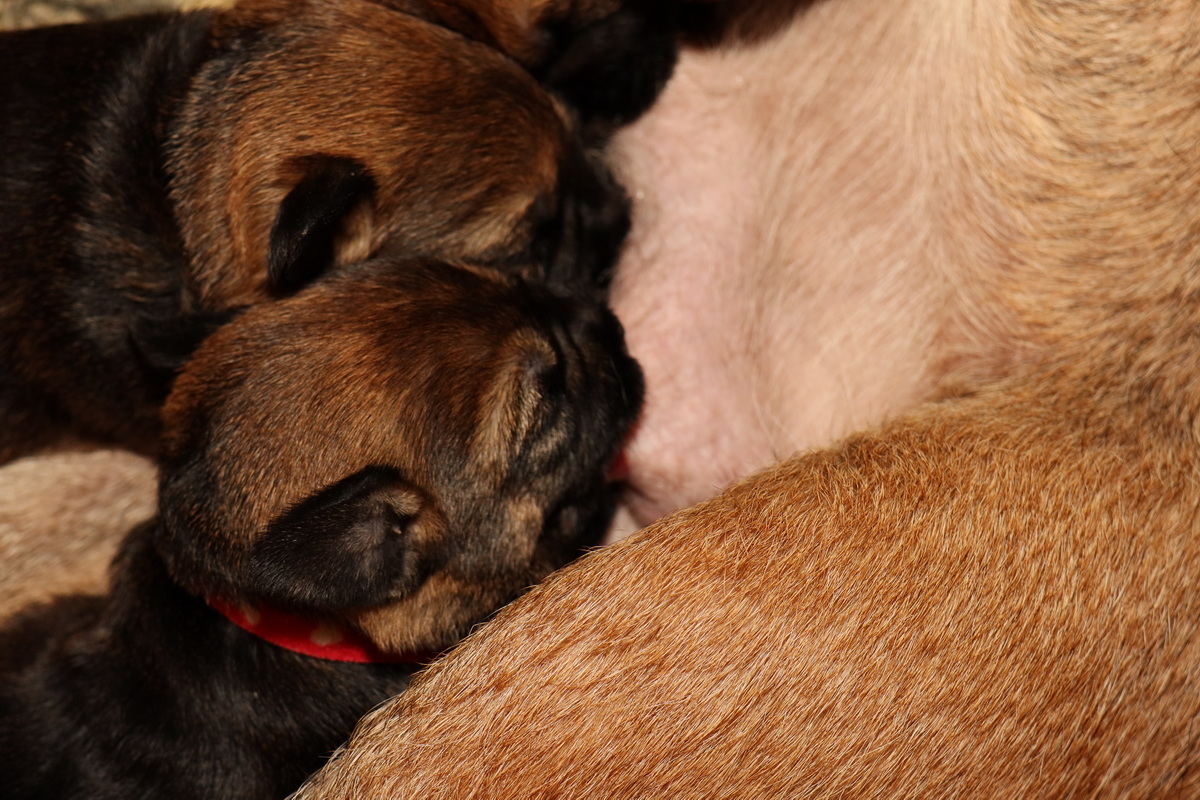 Als ze wakker worden krijgen ze eerst een poetsbeurt van Rosie. Dan mogen ze lekker bij Rosie zogen. Dat is nog best wat werk voor de puppy’s. Ze moeten wel 5 tot 10 minuten de melkklieren van Rosie stimuleren om daarna een minuutje melk te krijgen. Dan controleren ze nog of alle tepels wel echt leeggezogen zijn.
