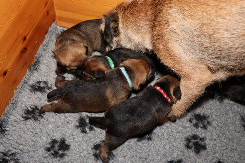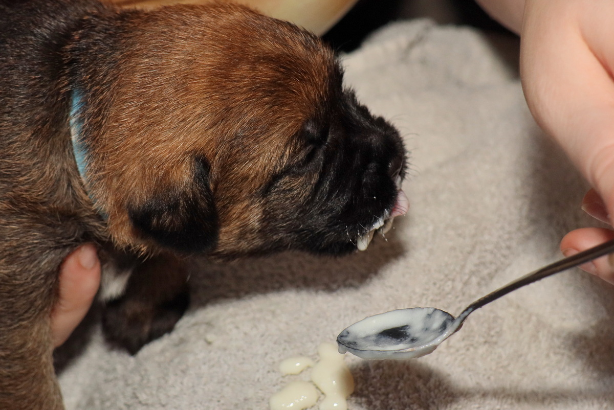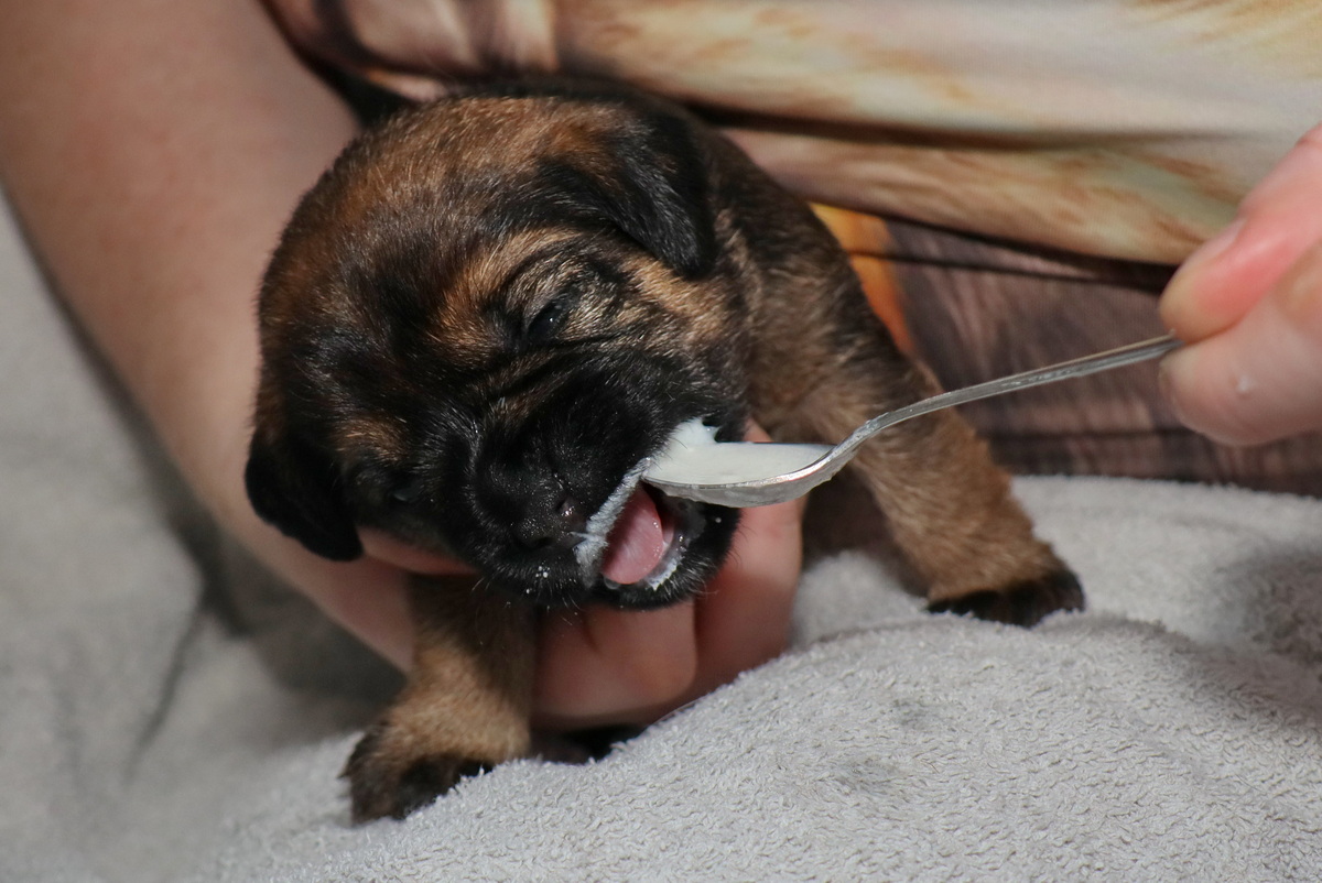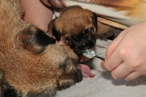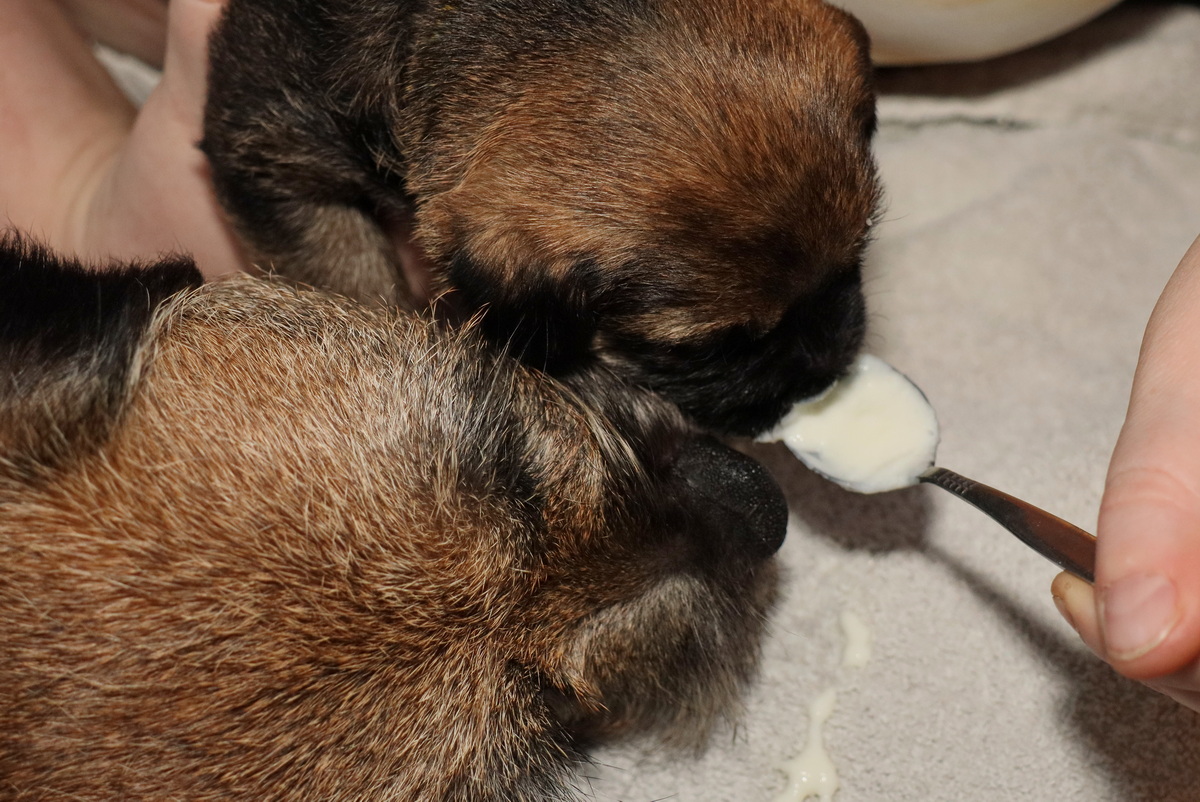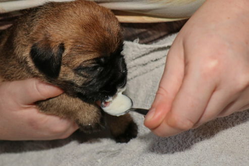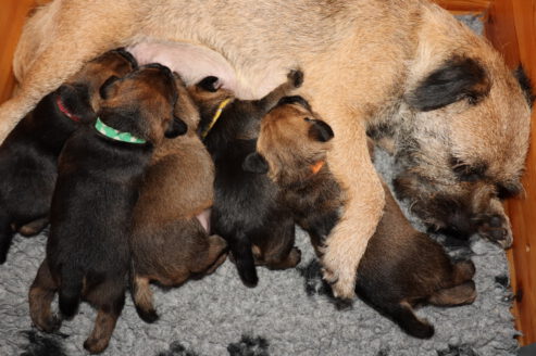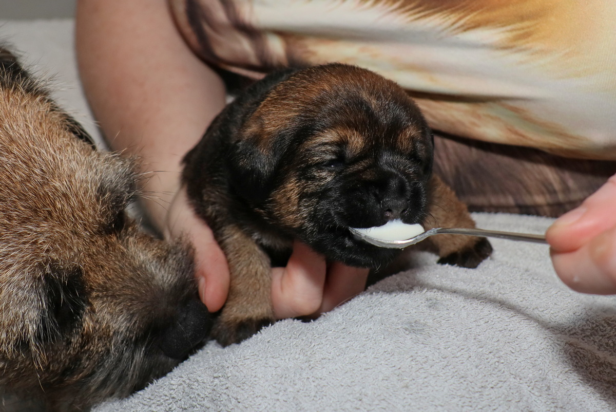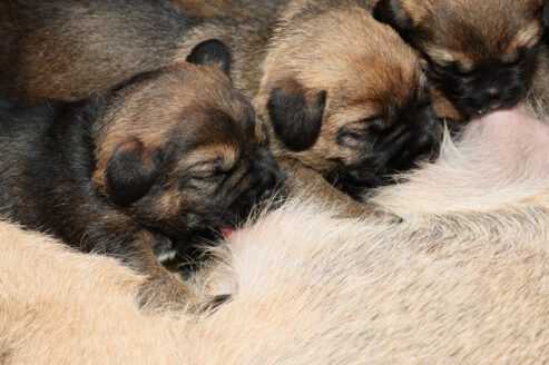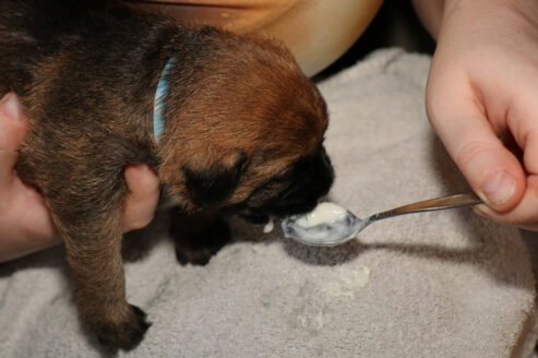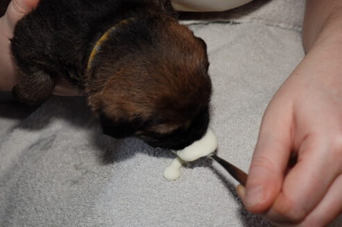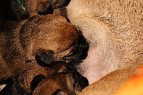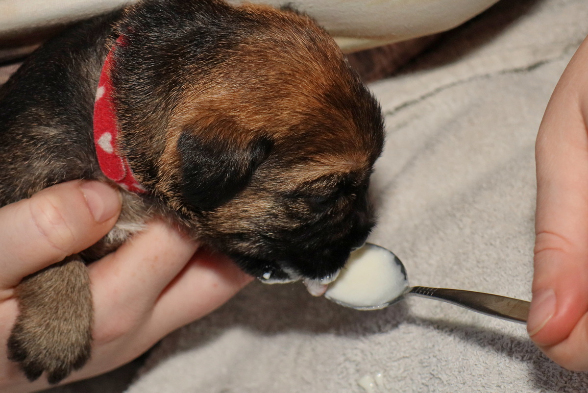 Als ze wakker worden krijgen ze eerst een poetsbeurt van Rosie. Dan mogen ze lekker bij Rosie zogen. Dat is nog best wat werk voor de puppy’s. Ze moeten wel 5 tot 10 minuten de melkklieren van Rosie stimuleren om daarna een minuutje melk te krijgen. Dan controleren ze nog of alle tepels wel echt leeggezogen zijn.