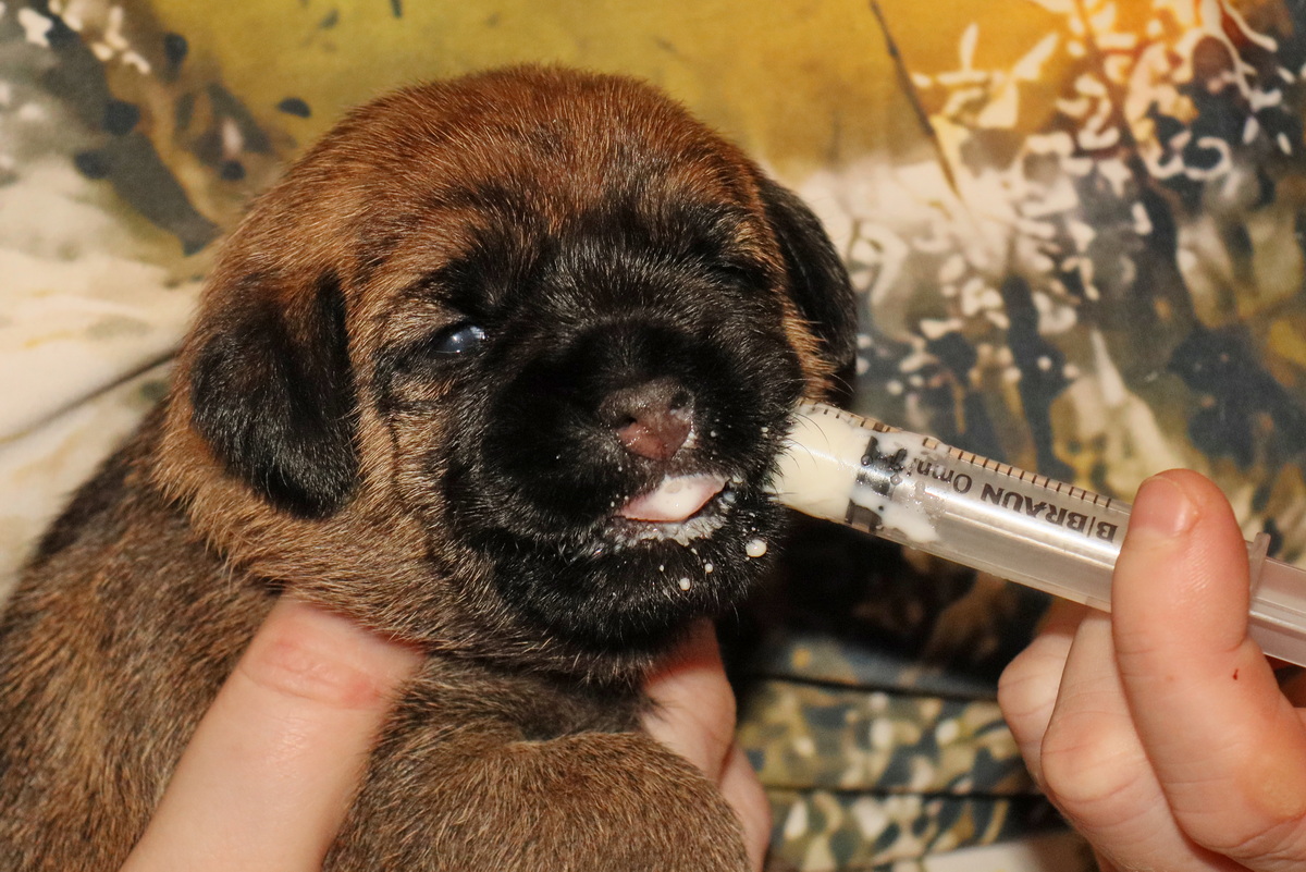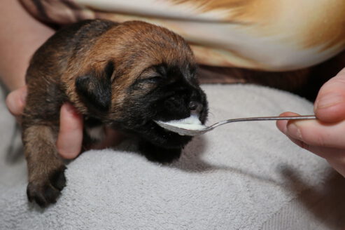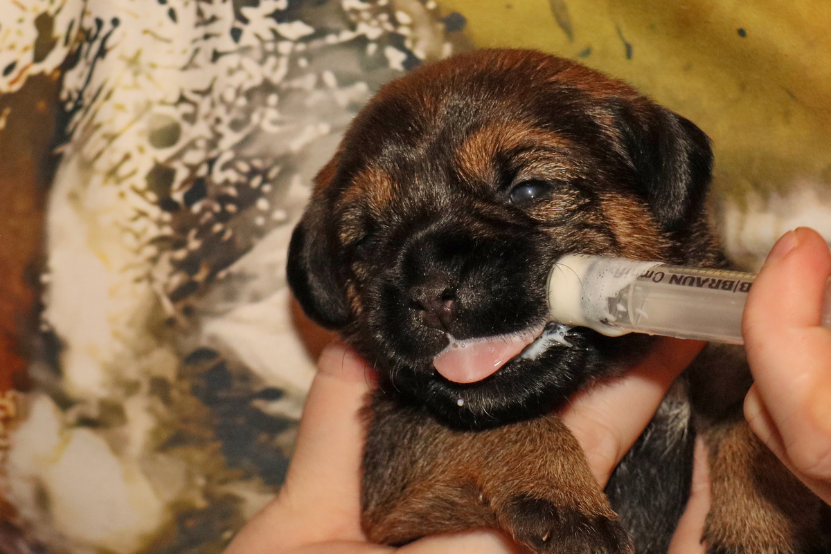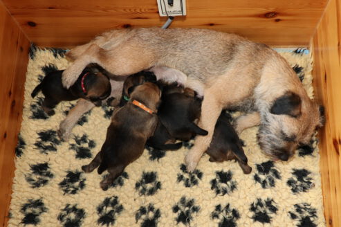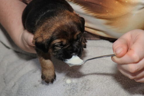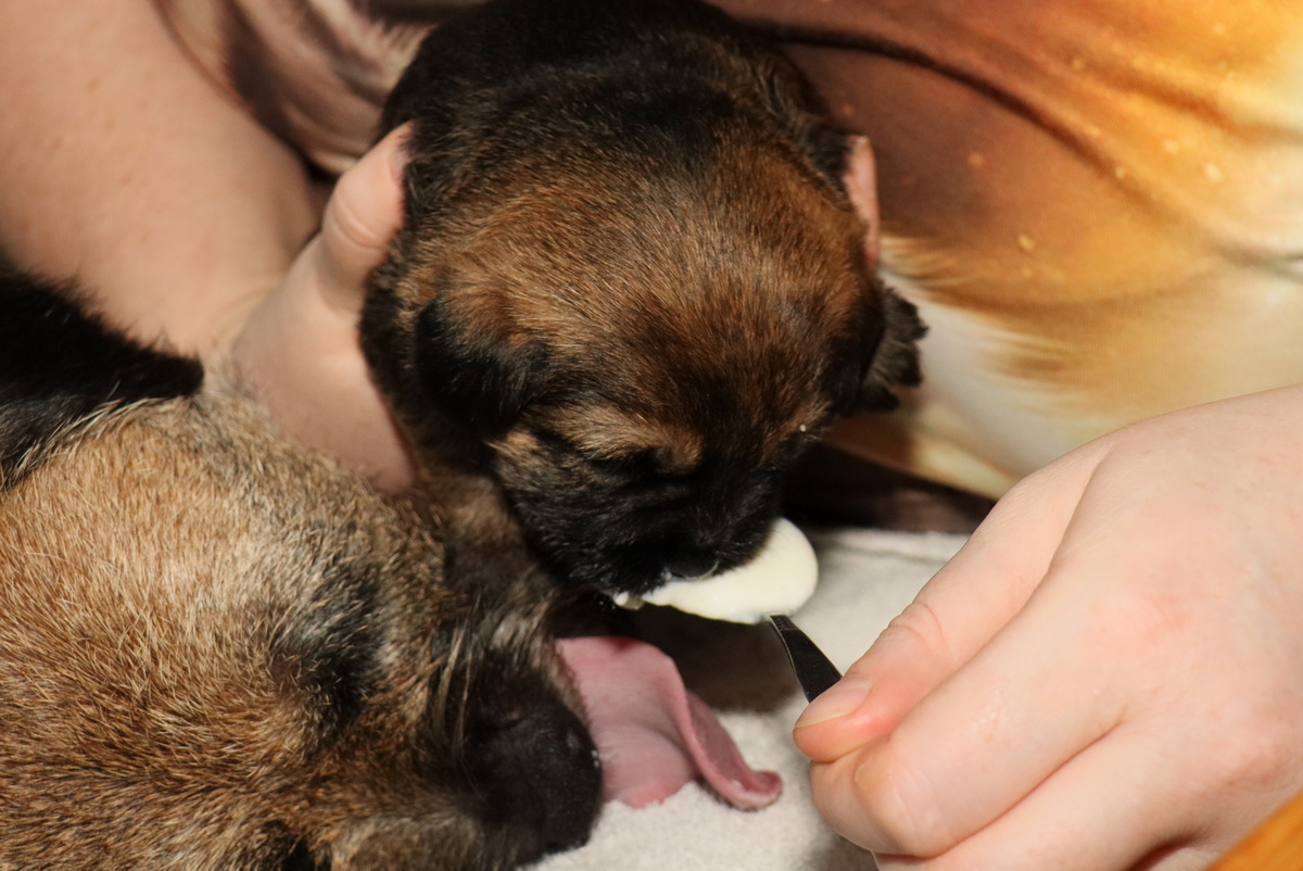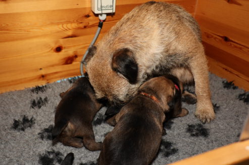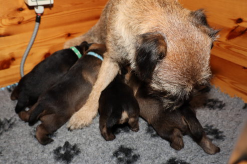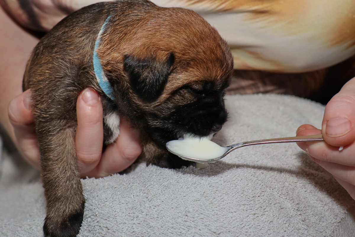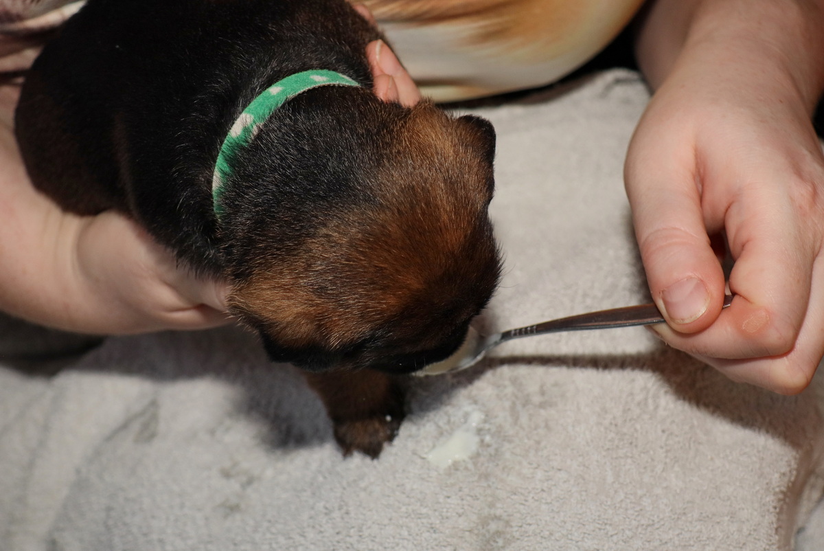 Als ze wakker worden krijgen ze eerst een poetsbeurt van Rosie. Dan mogen ze lekker bij Rosie zogen. Dat is nog best wat werk voor de puppy’s. Ze moeten wel 5 tot 10 minuten de melkklieren van Rosie stimuleren om daarna een minuutje melk te krijgen. Dan controleren ze nog of alle tepels wel echt leeggezogen zijn.