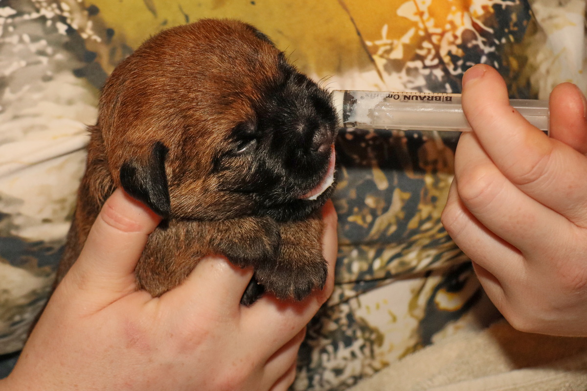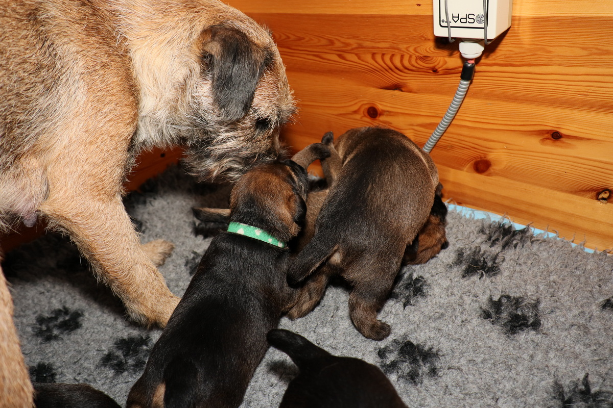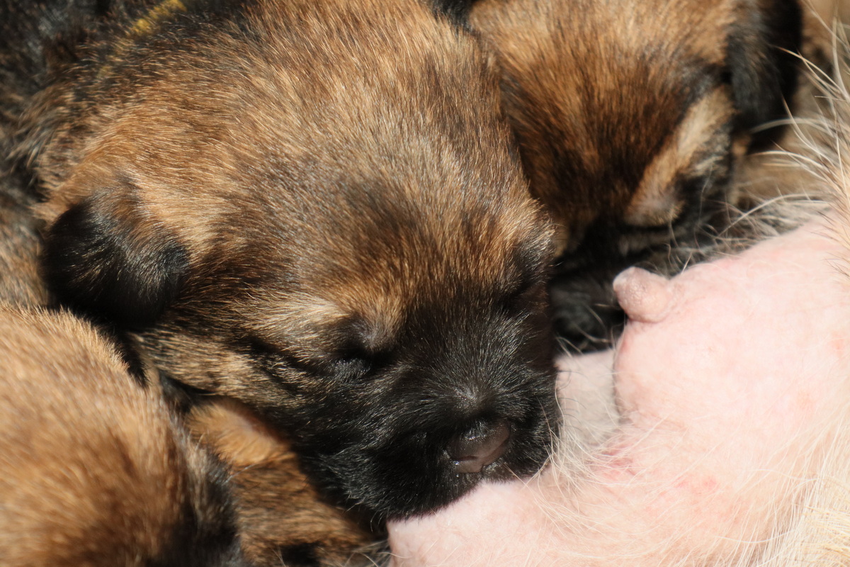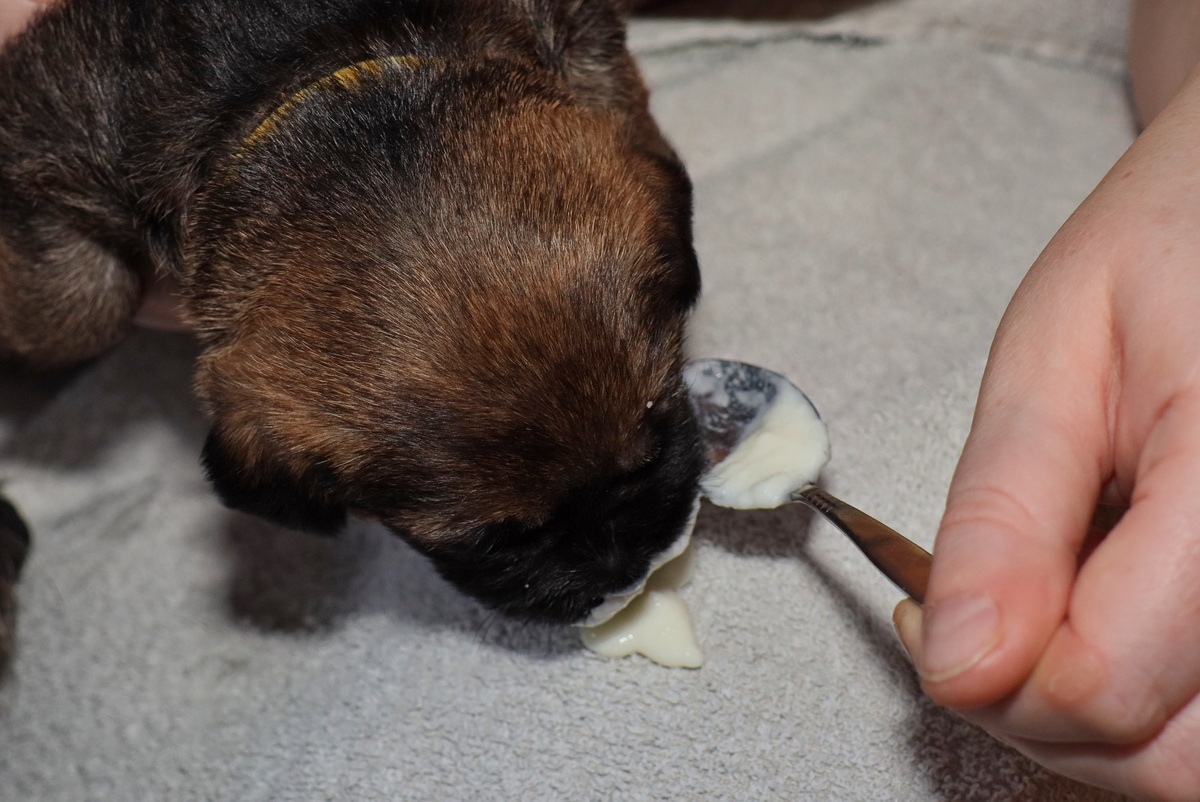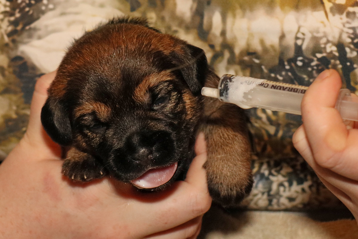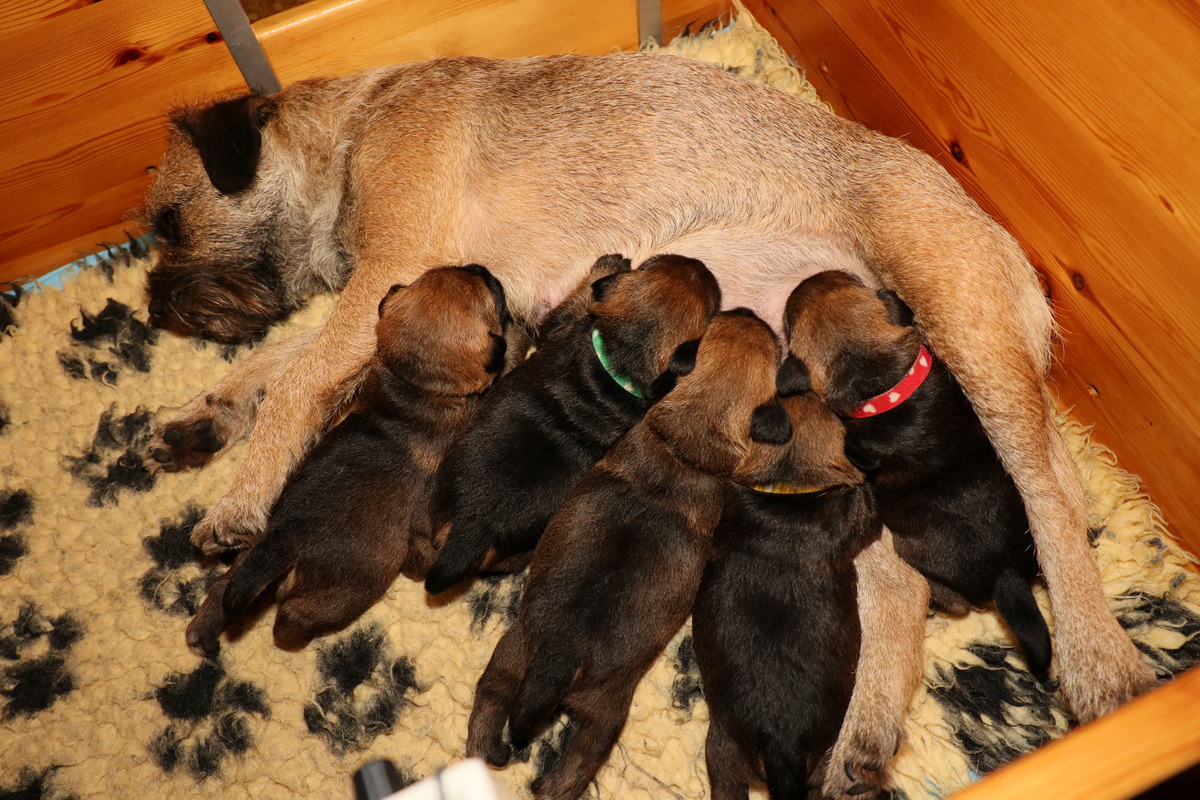 Als ze wakker worden krijgen ze eerst een poetsbeurt van Rosie. Dan mogen ze lekker bij Rosie zogen. Dat is nog best wat werk voor de puppy’s. Ze moeten wel 5 tot 10 minuten de melkklieren van Rosie stimuleren om daarna een minuutje melk te krijgen. Dan controleren ze nog of alle tepels wel echt leeggezogen zijn.