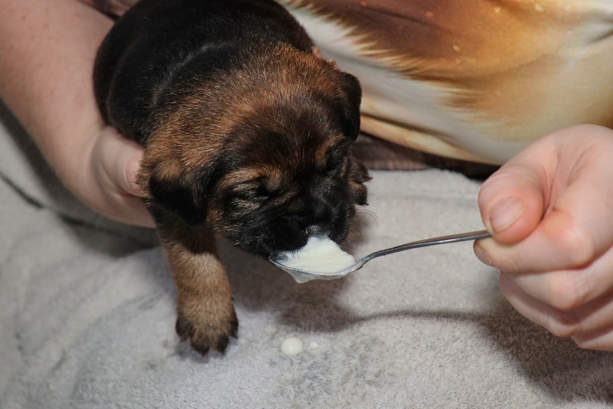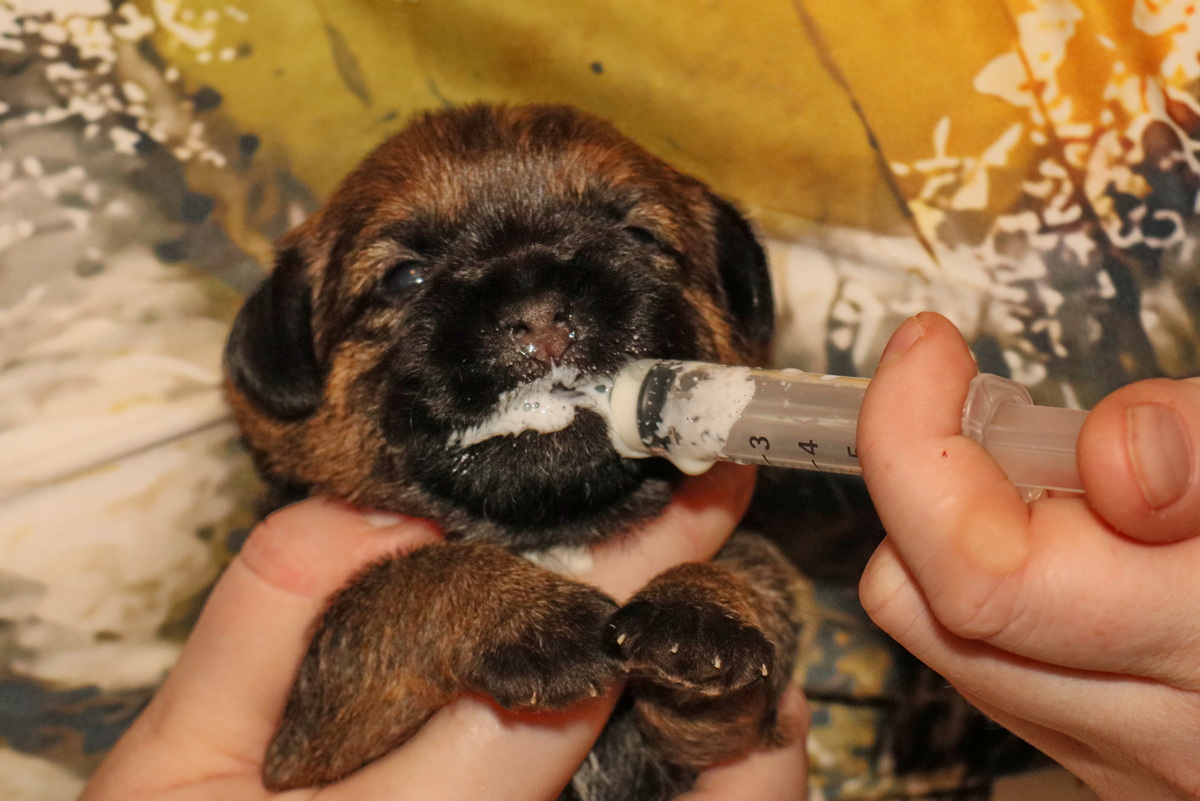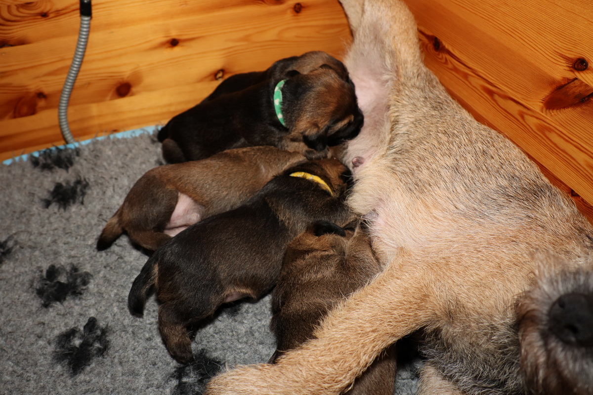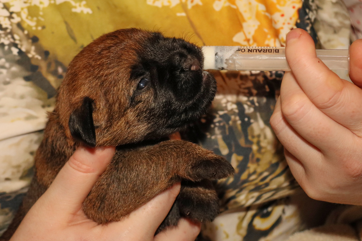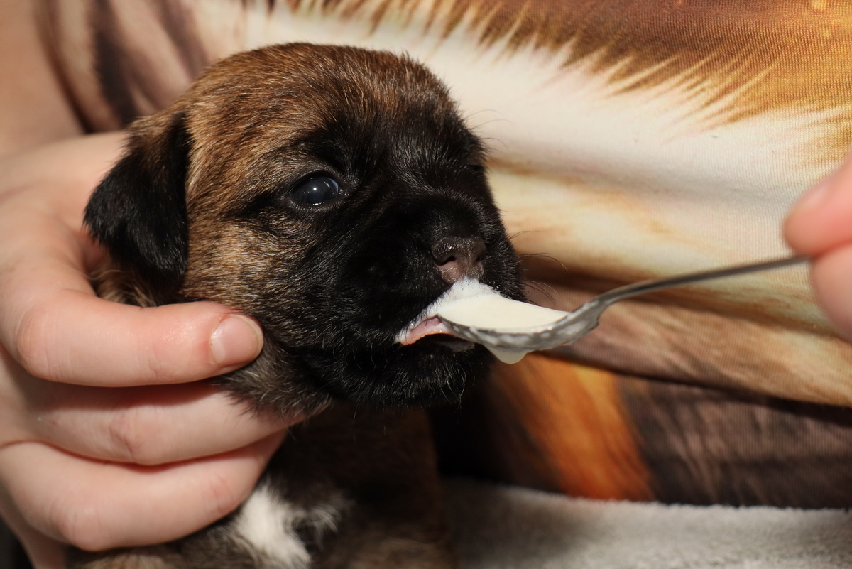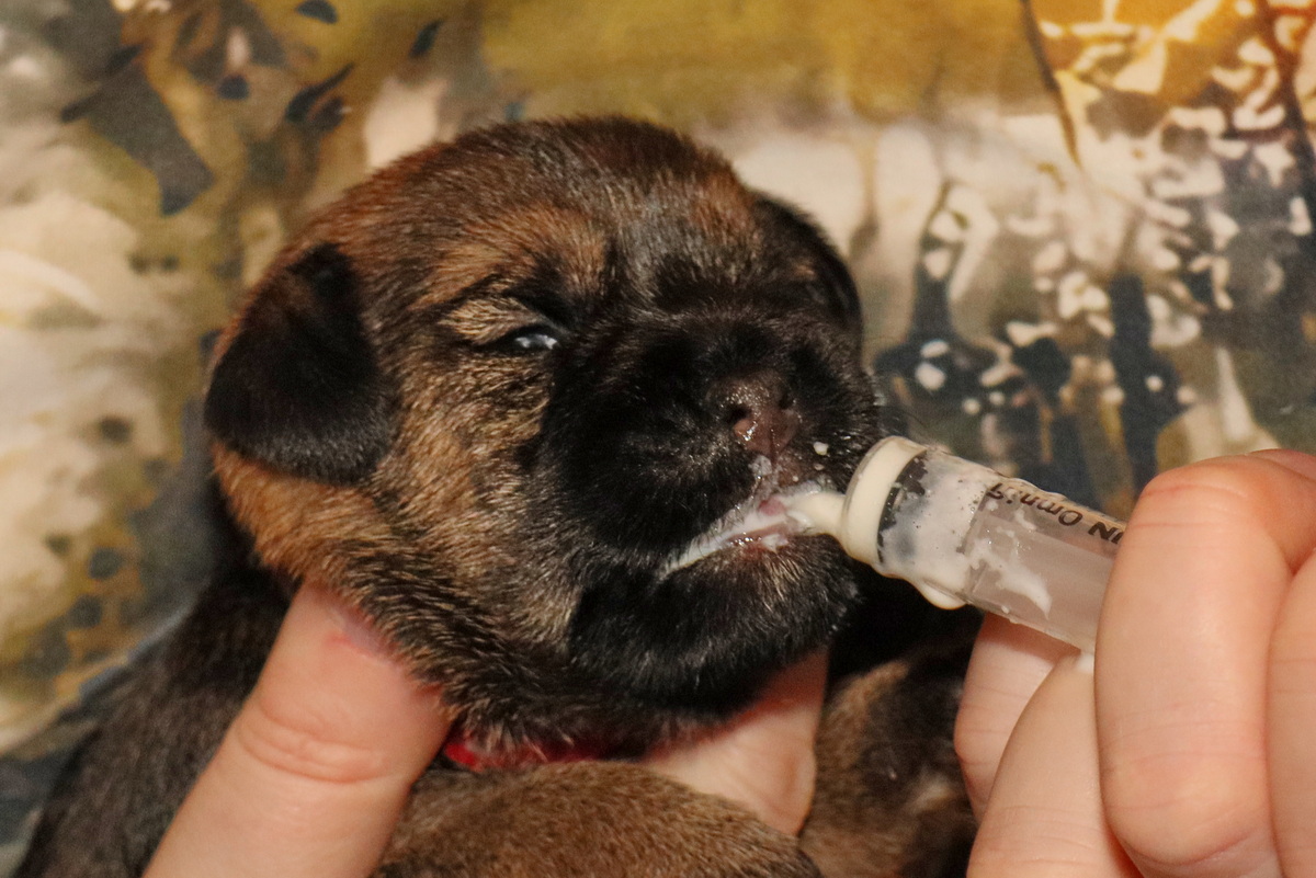 Als ze wakker worden krijgen ze eerst een poetsbeurt van Rosie. Dan mogen ze lekker bij Rosie zogen. Dat is nog best wat werk voor de puppy’s. Ze moeten wel 5 tot 10 minuten de melkklieren van Rosie stimuleren om daarna een minuutje melk te krijgen. Dan controleren ze nog of alle tepels wel echt leeggezogen zijn.