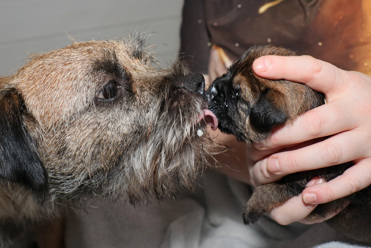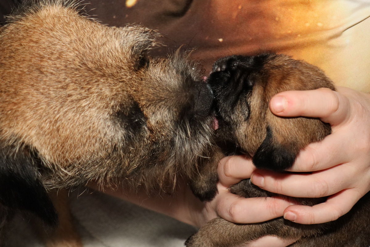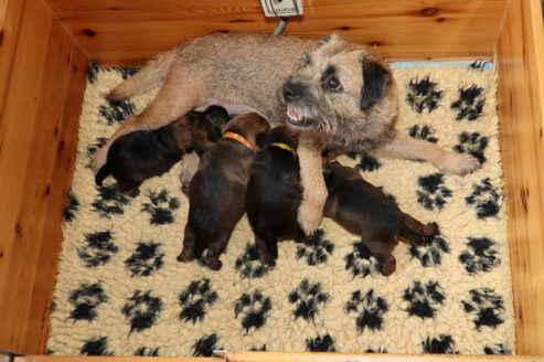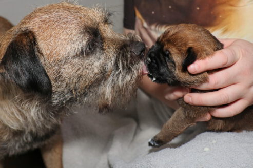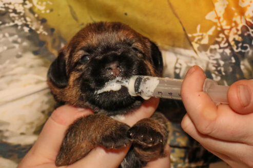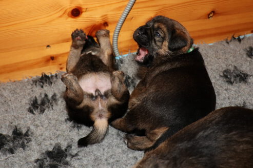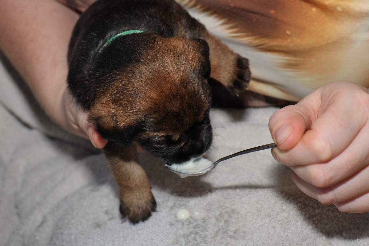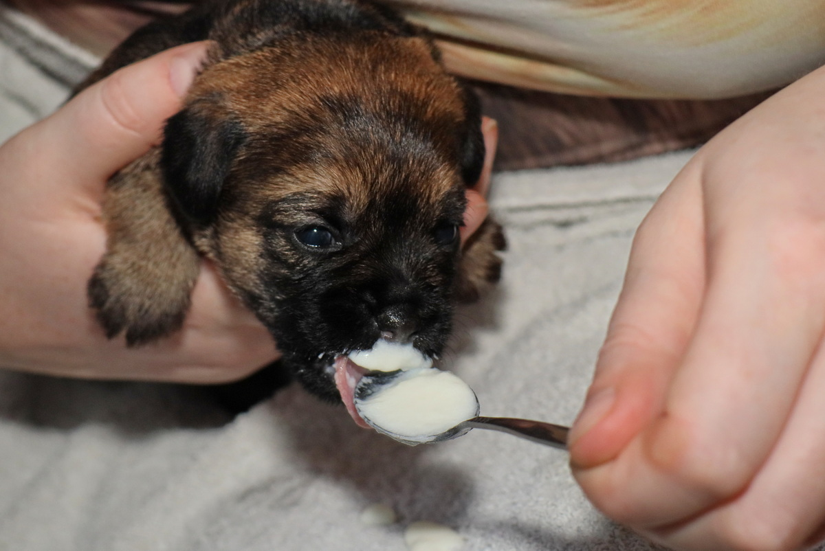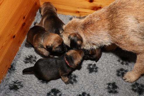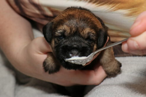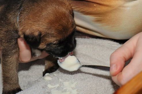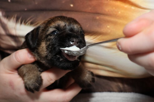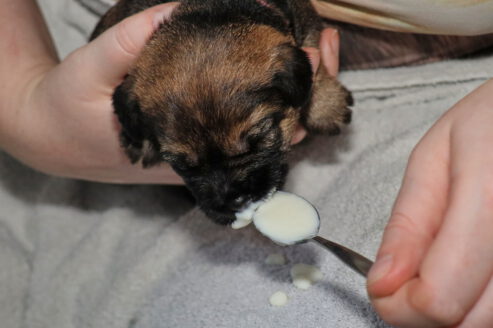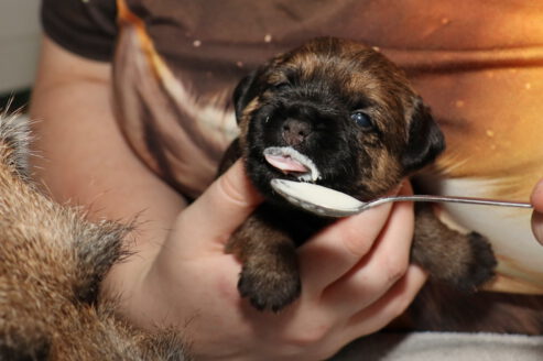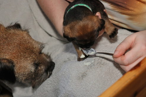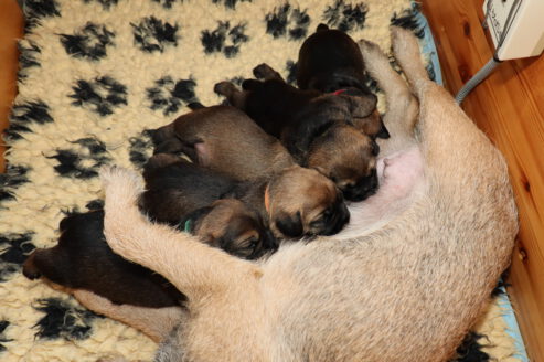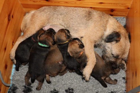 Als ze wakker worden krijgen ze eerst een poetsbeurt van Rosie. Dan mogen ze lekker bij Rosie zogen. Dat is nog best wat werk voor de puppy’s. Ze moeten wel 5 tot 10 minuten de melkklieren van Rosie stimuleren om daarna een minuutje melk te krijgen. Dan controleren ze nog of alle tepels wel echt leeggezogen zijn.