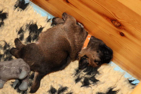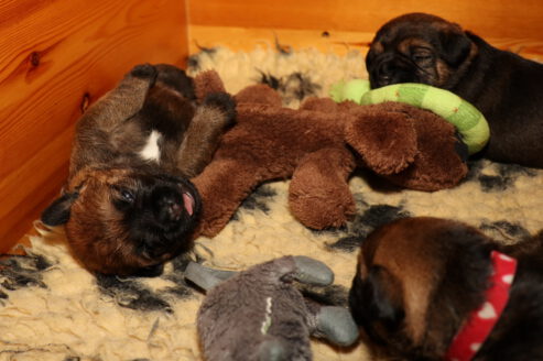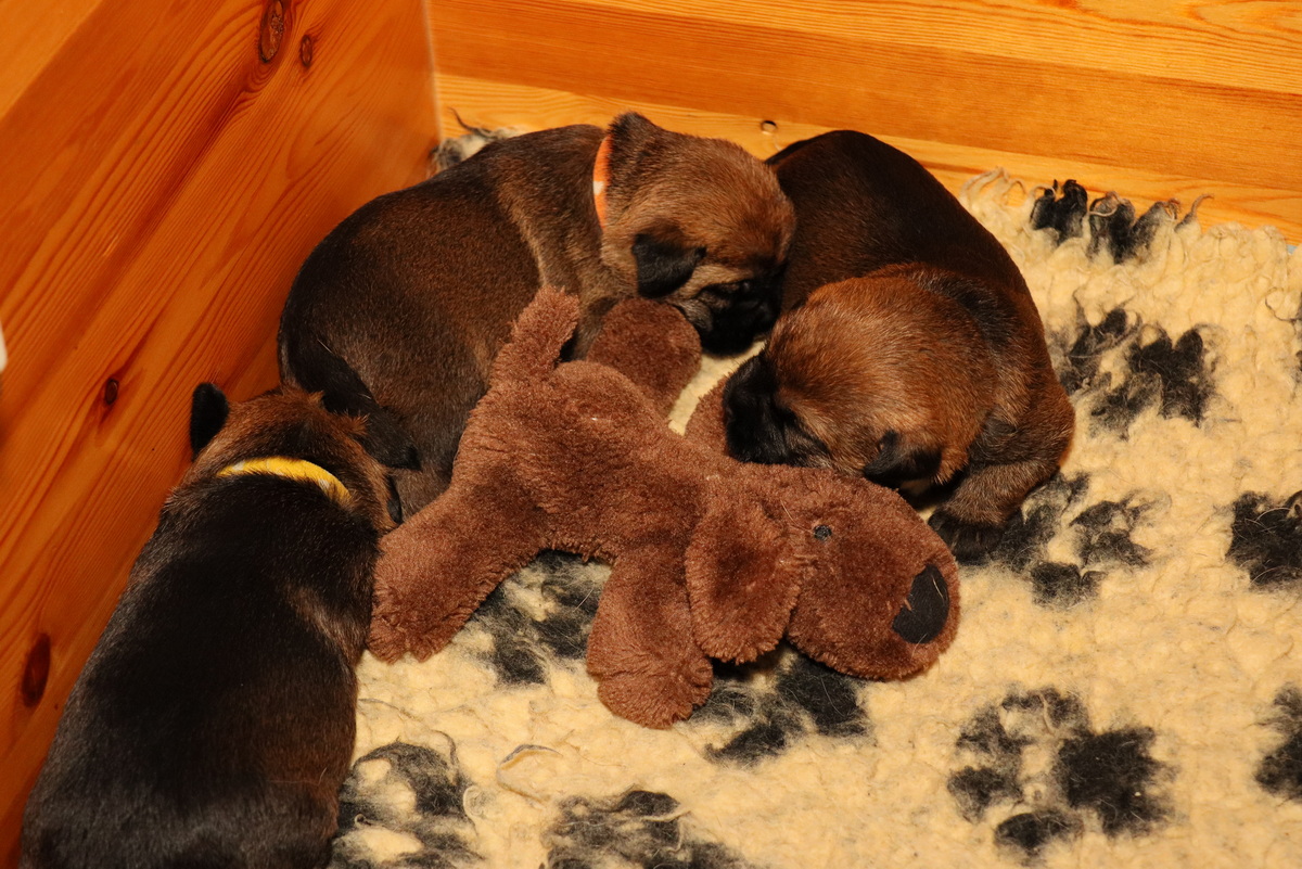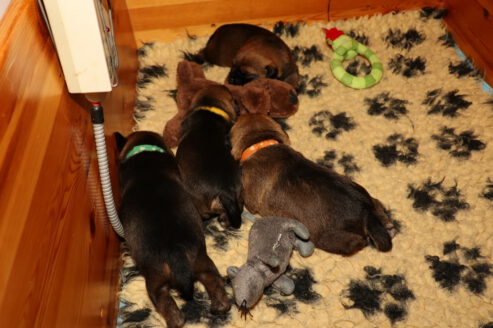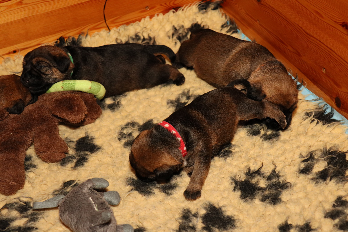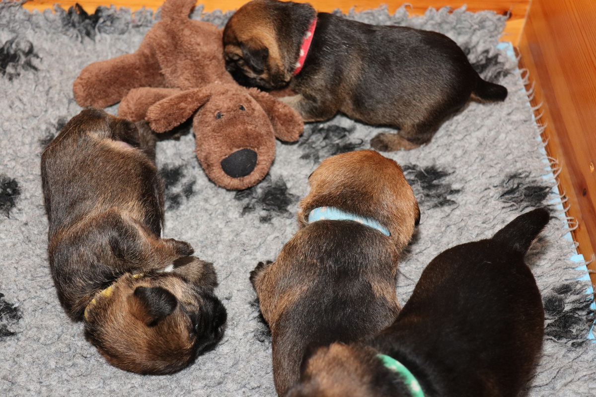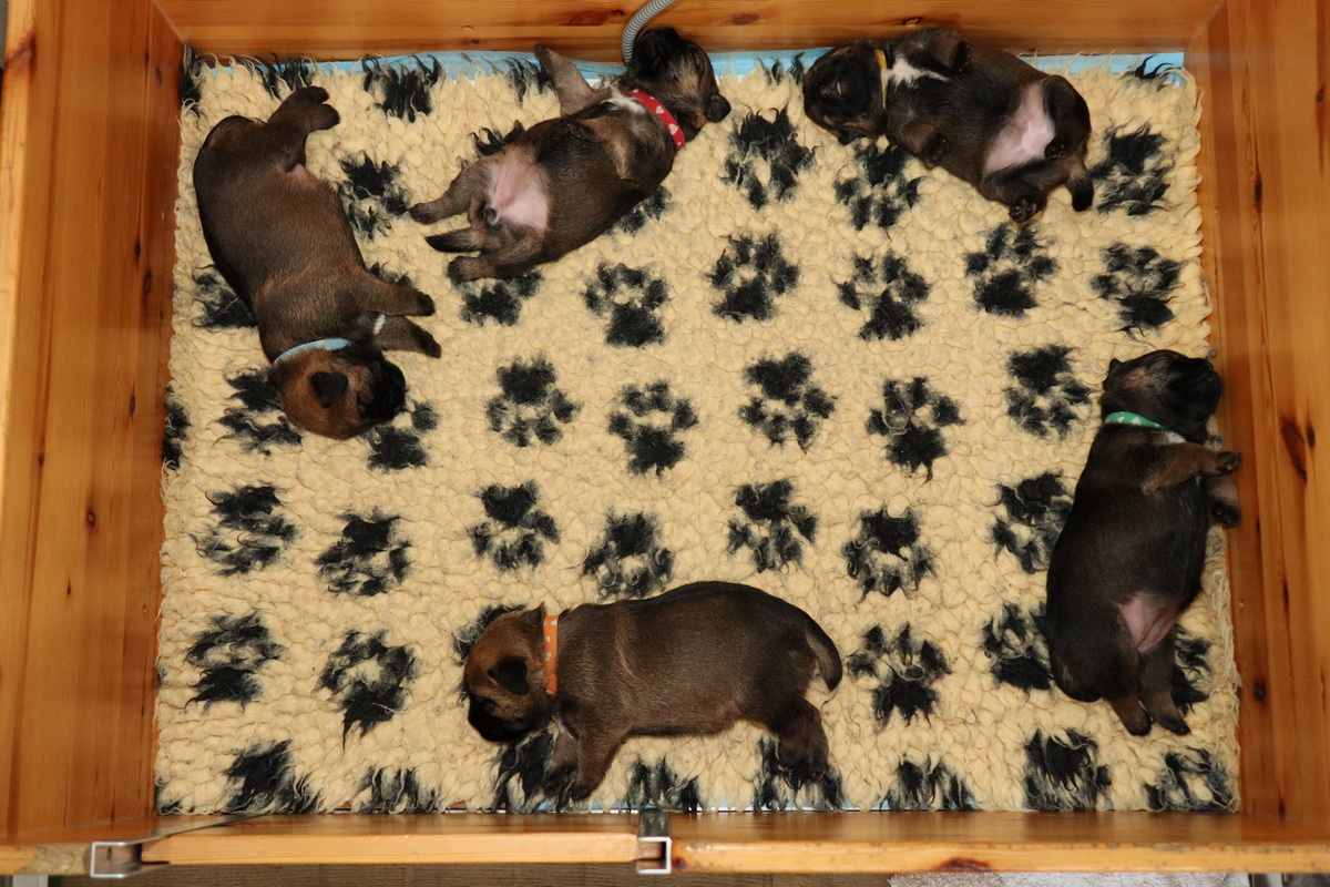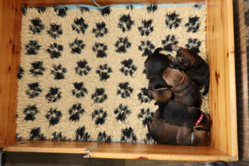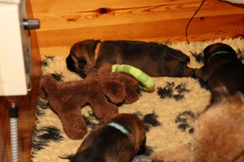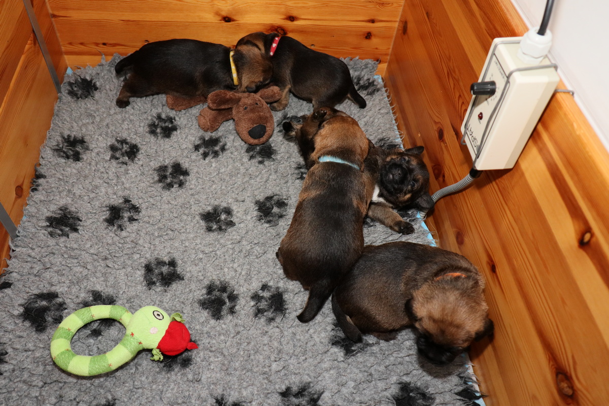 Na zo’n 10 minuten is de energie op en vallen ze heerlijk relaxed in slaap. Vijf tevreden puppy’s.