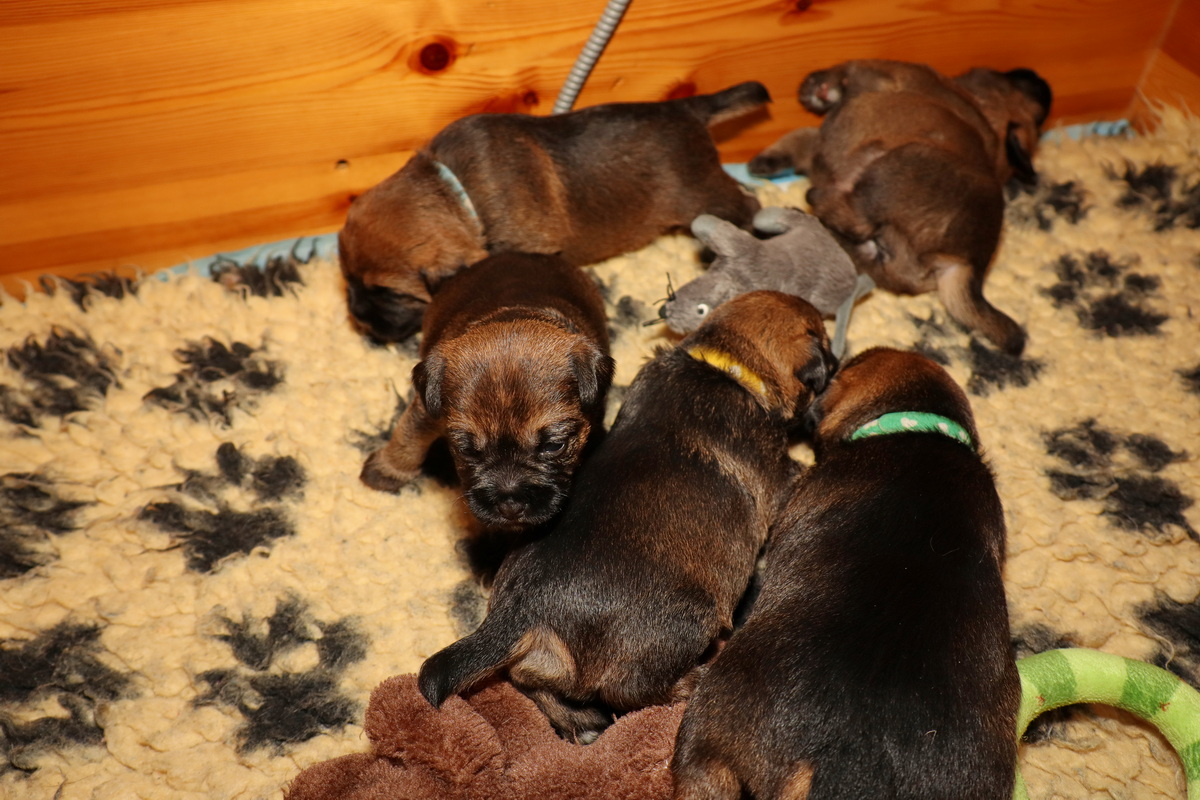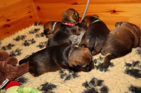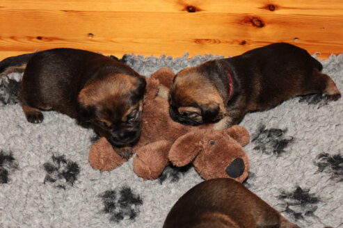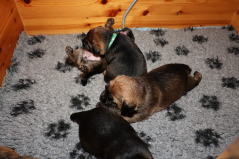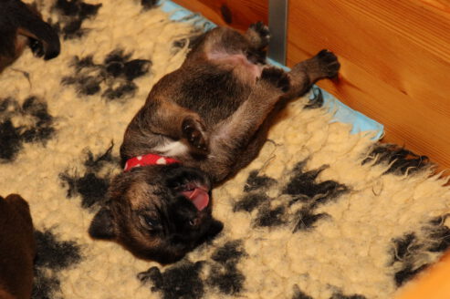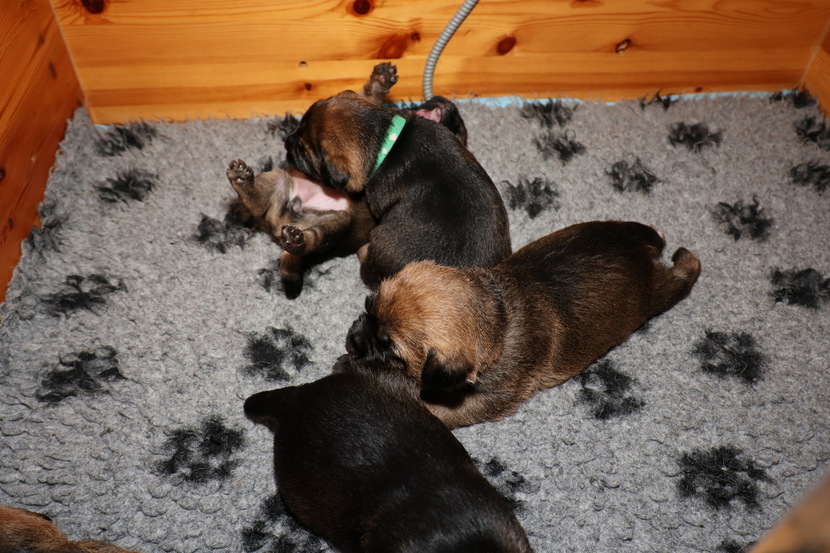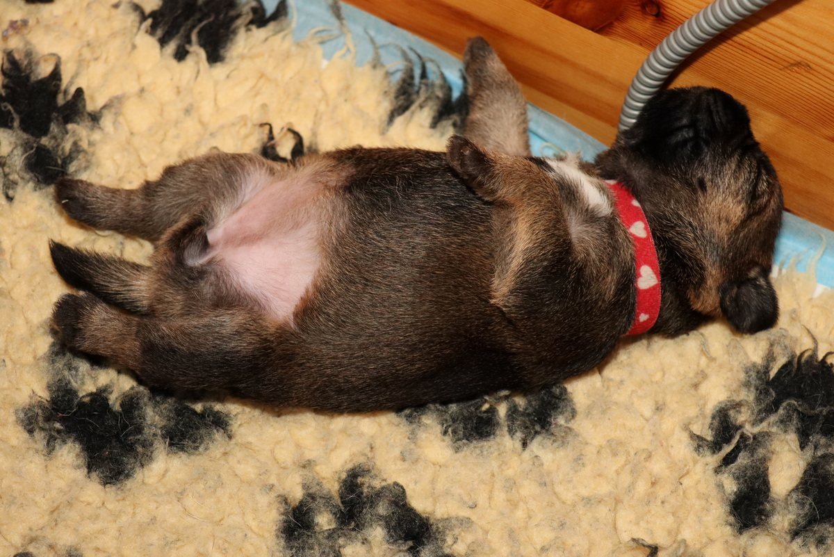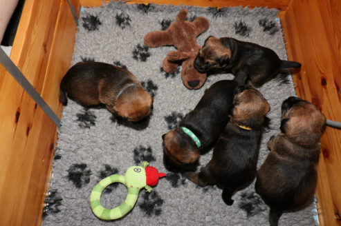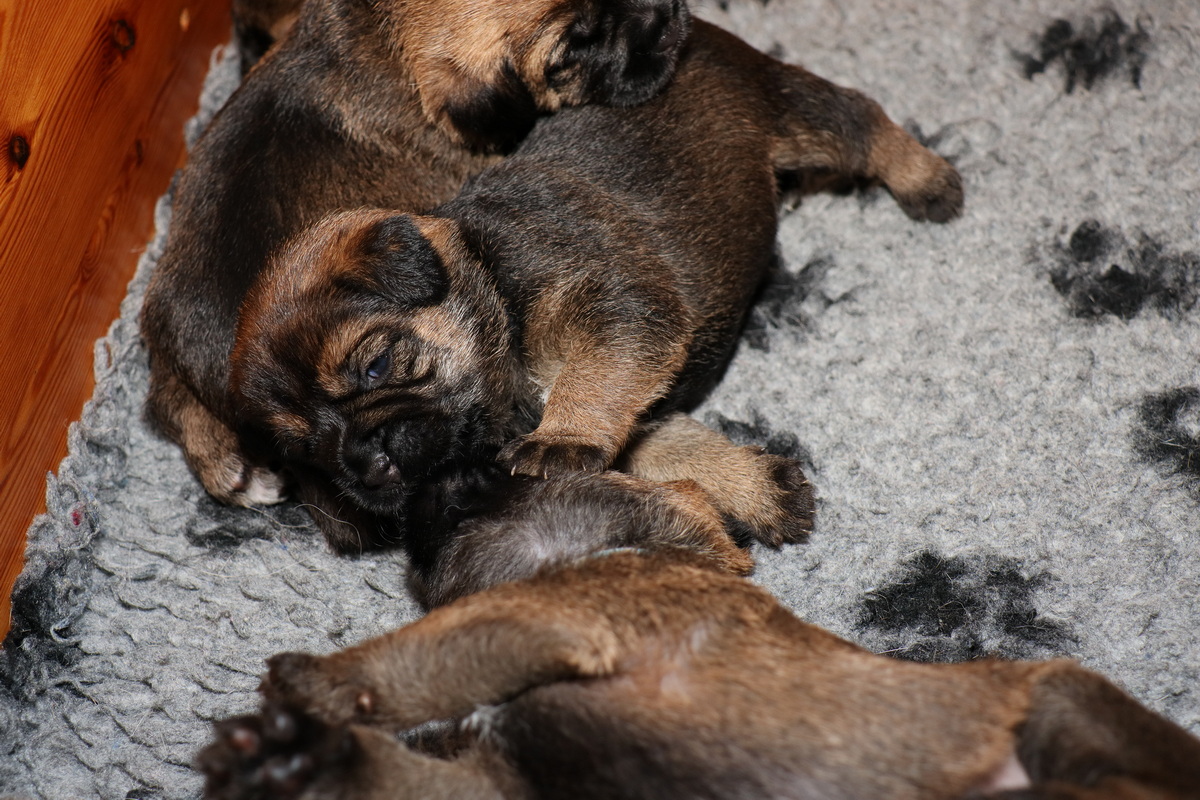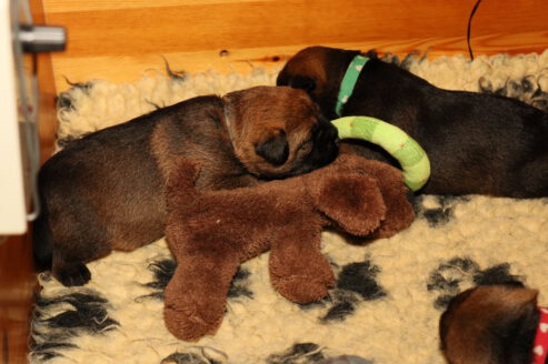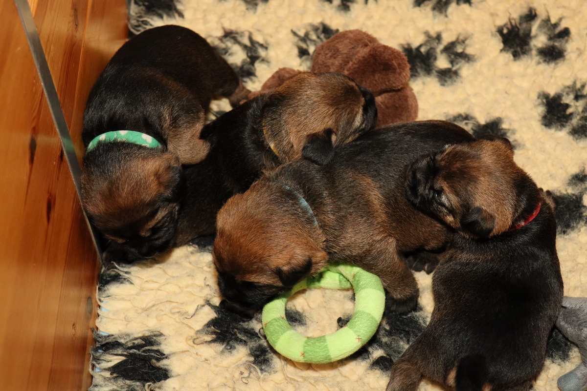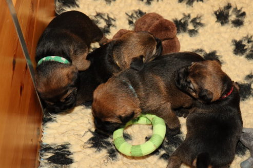 Na zo’n 10 minuten is de energie op en vallen ze heerlijk relaxed in slaap. Vijf tevreden puppy’s.