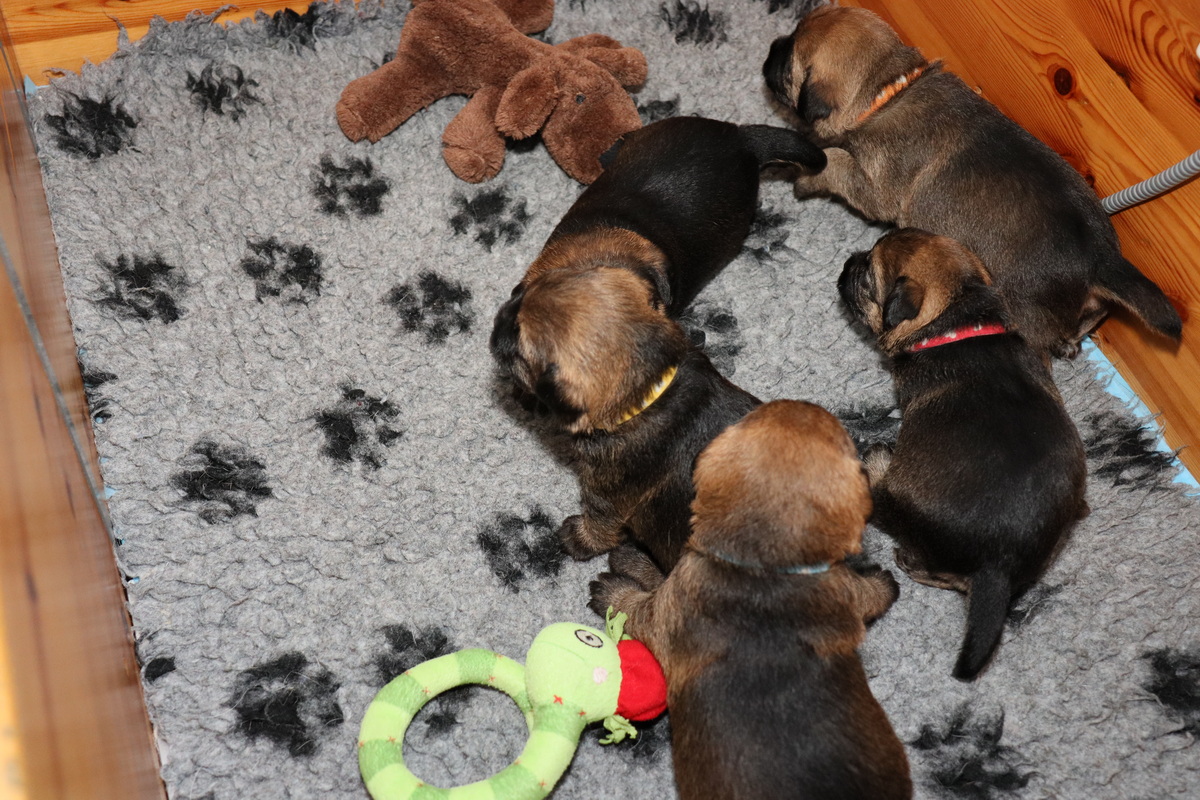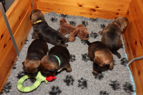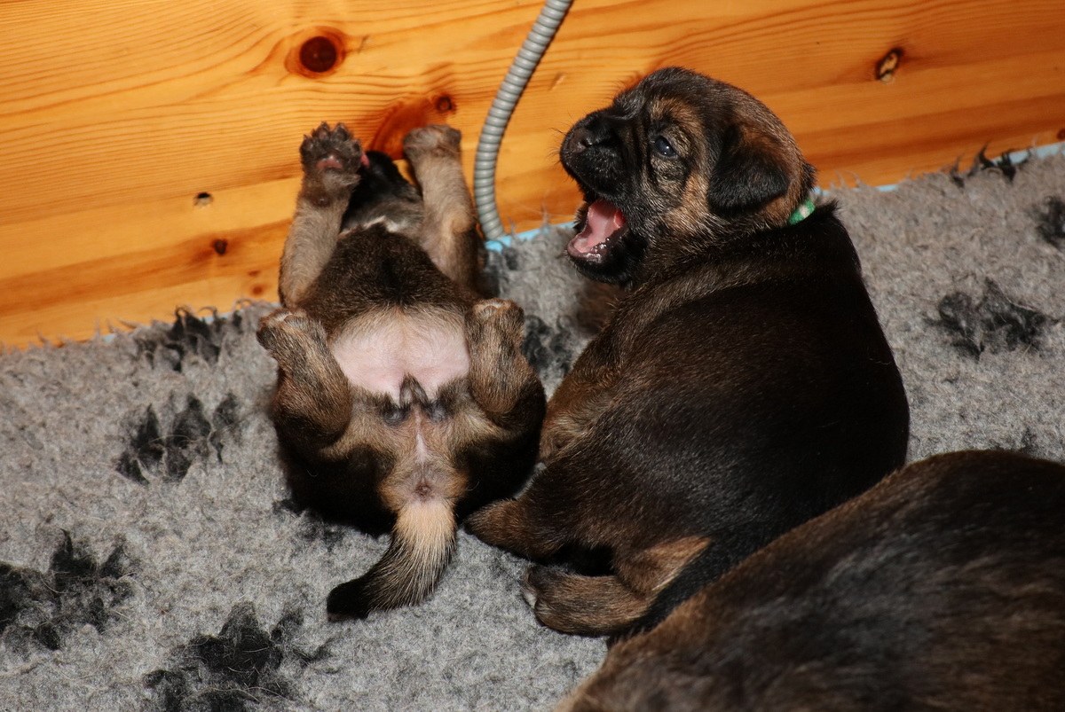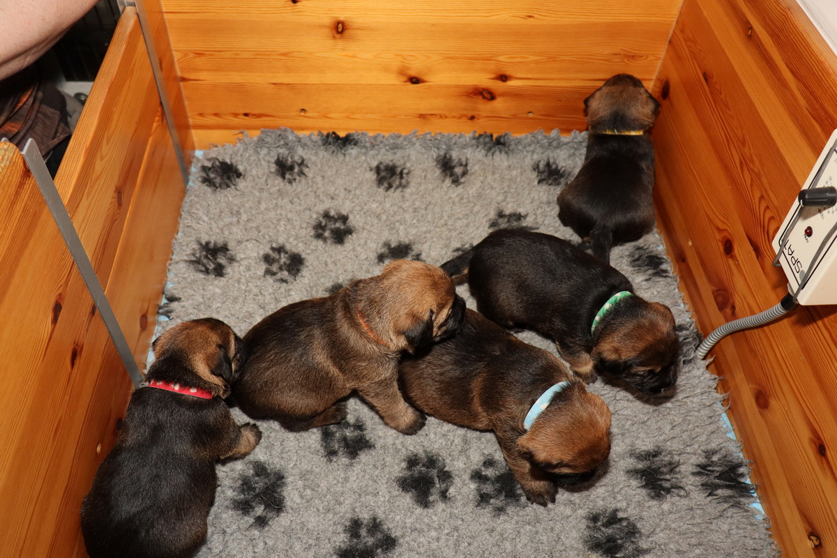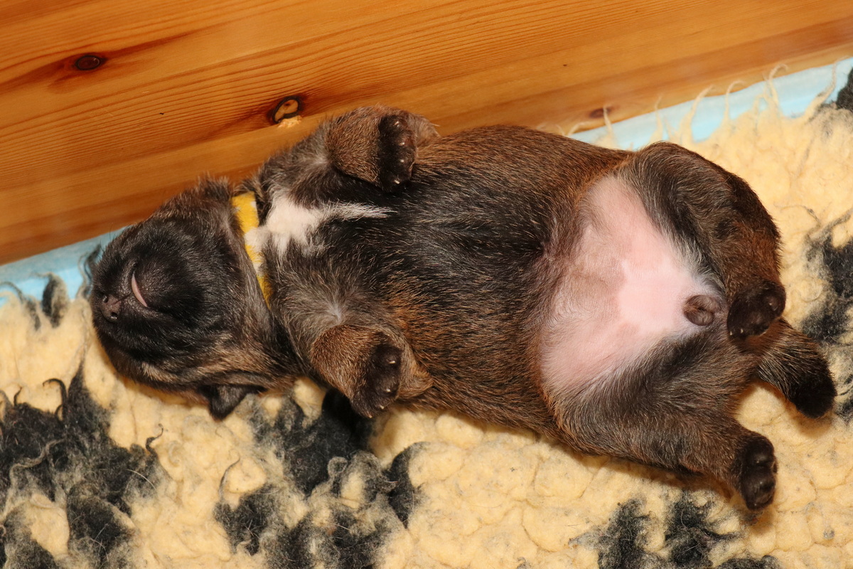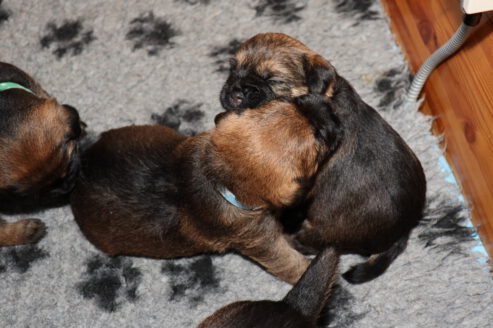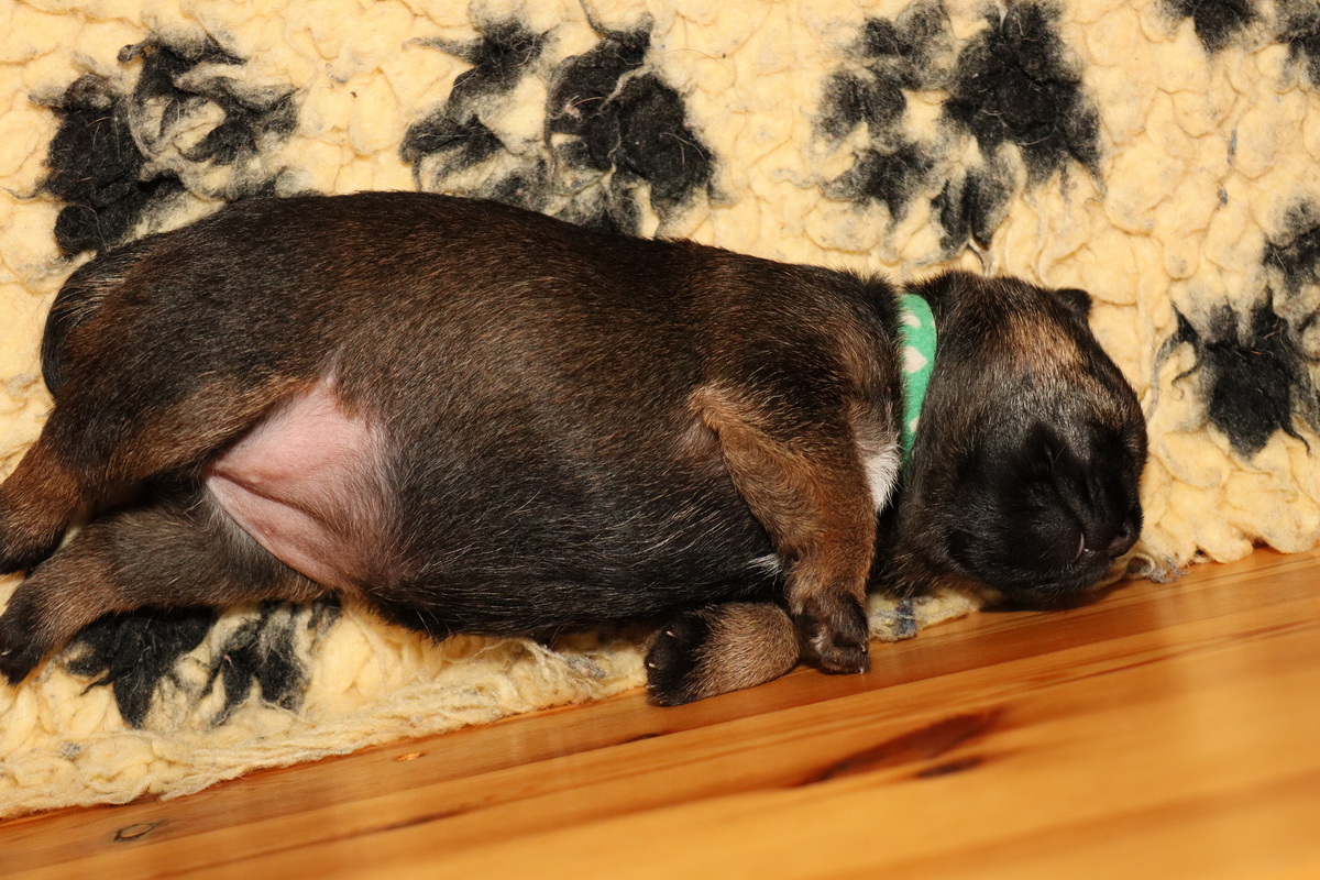 Na zo’n 10 minuten is de energie op en vallen ze heerlijk relaxed in slaap. Vijf tevreden puppy’s.