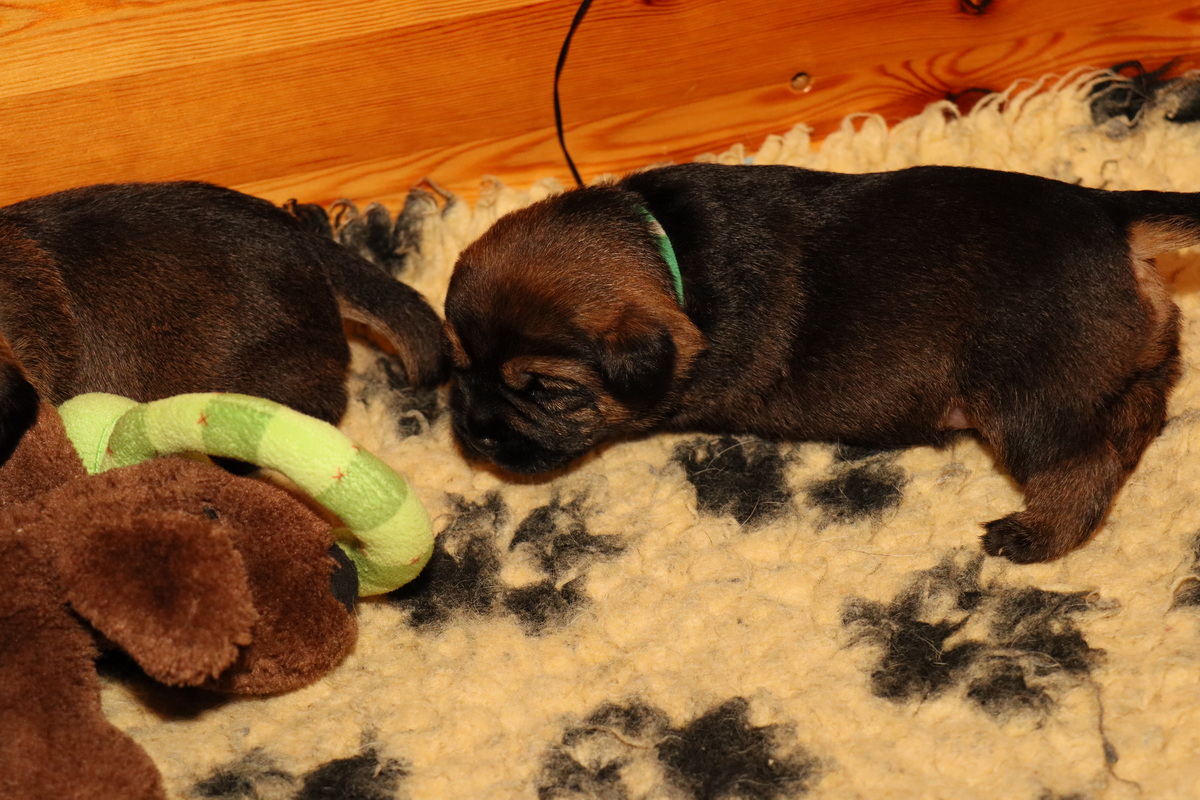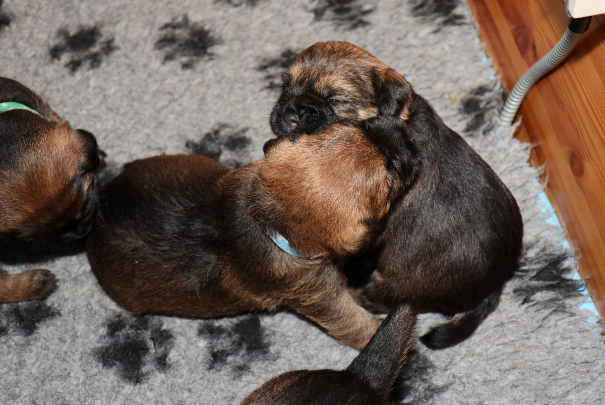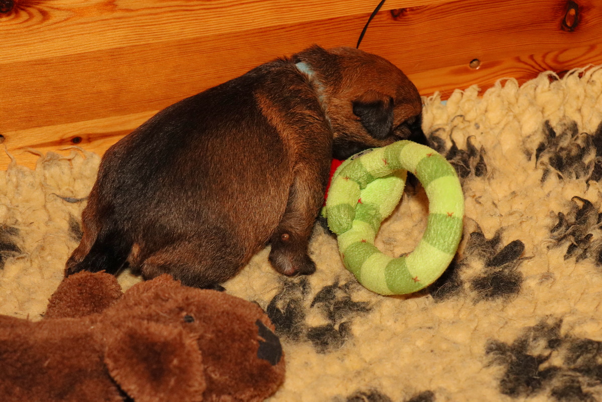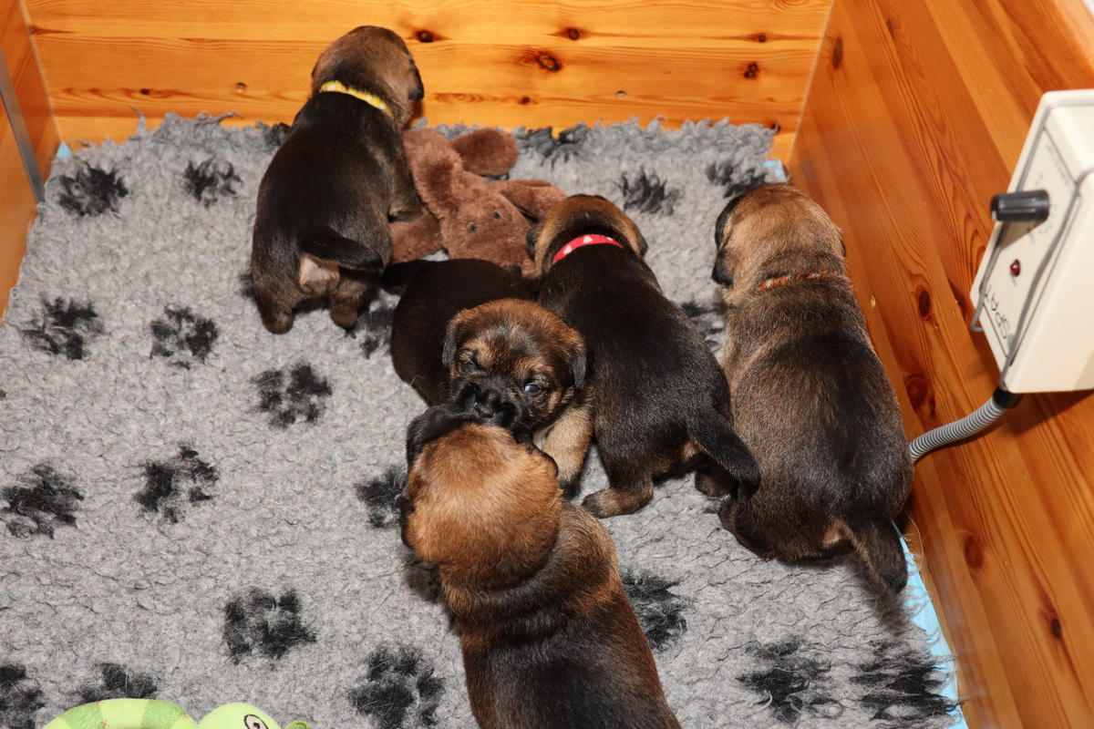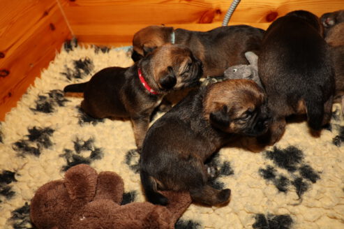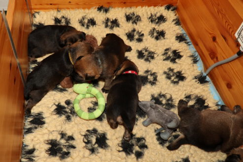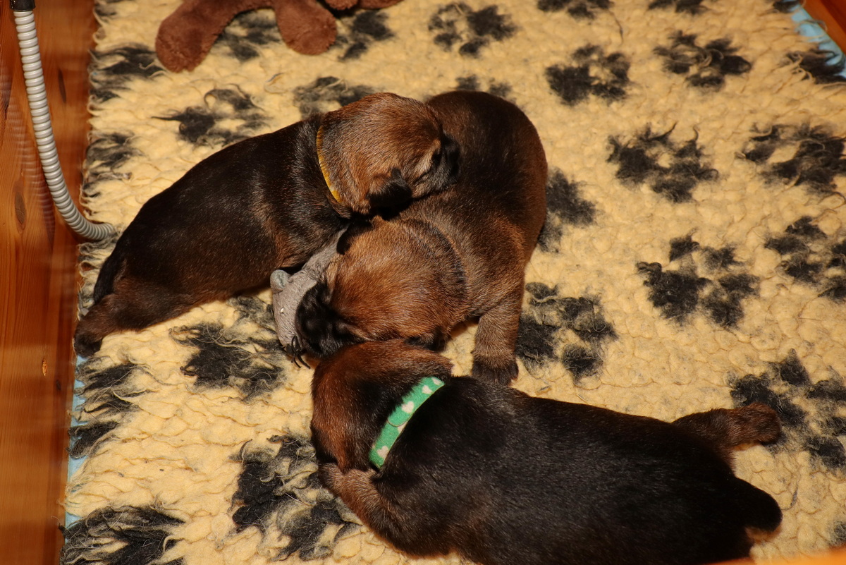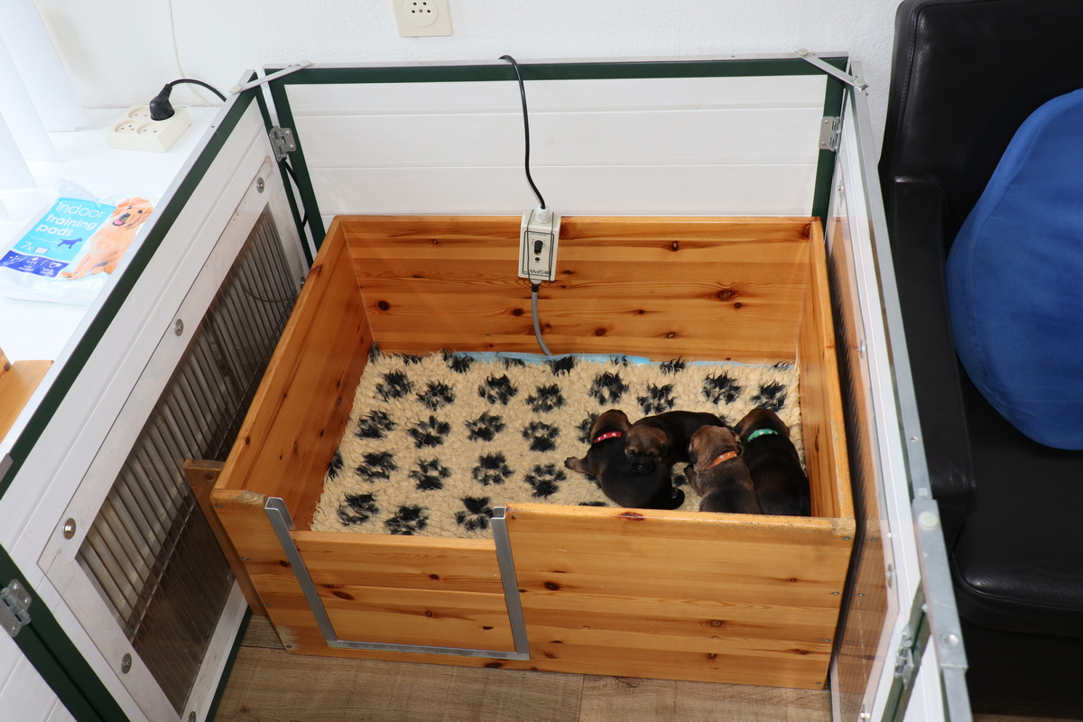Na zo’n 10 minuten is de energie op en vallen ze heerlijk relaxed in slaap. Vijf tevreden puppy’s.