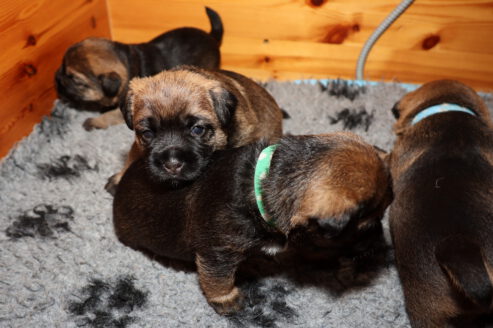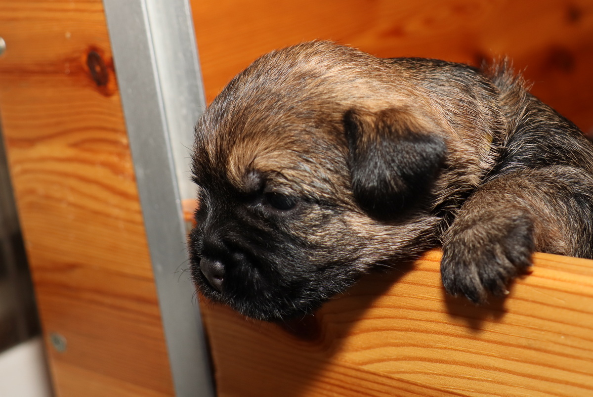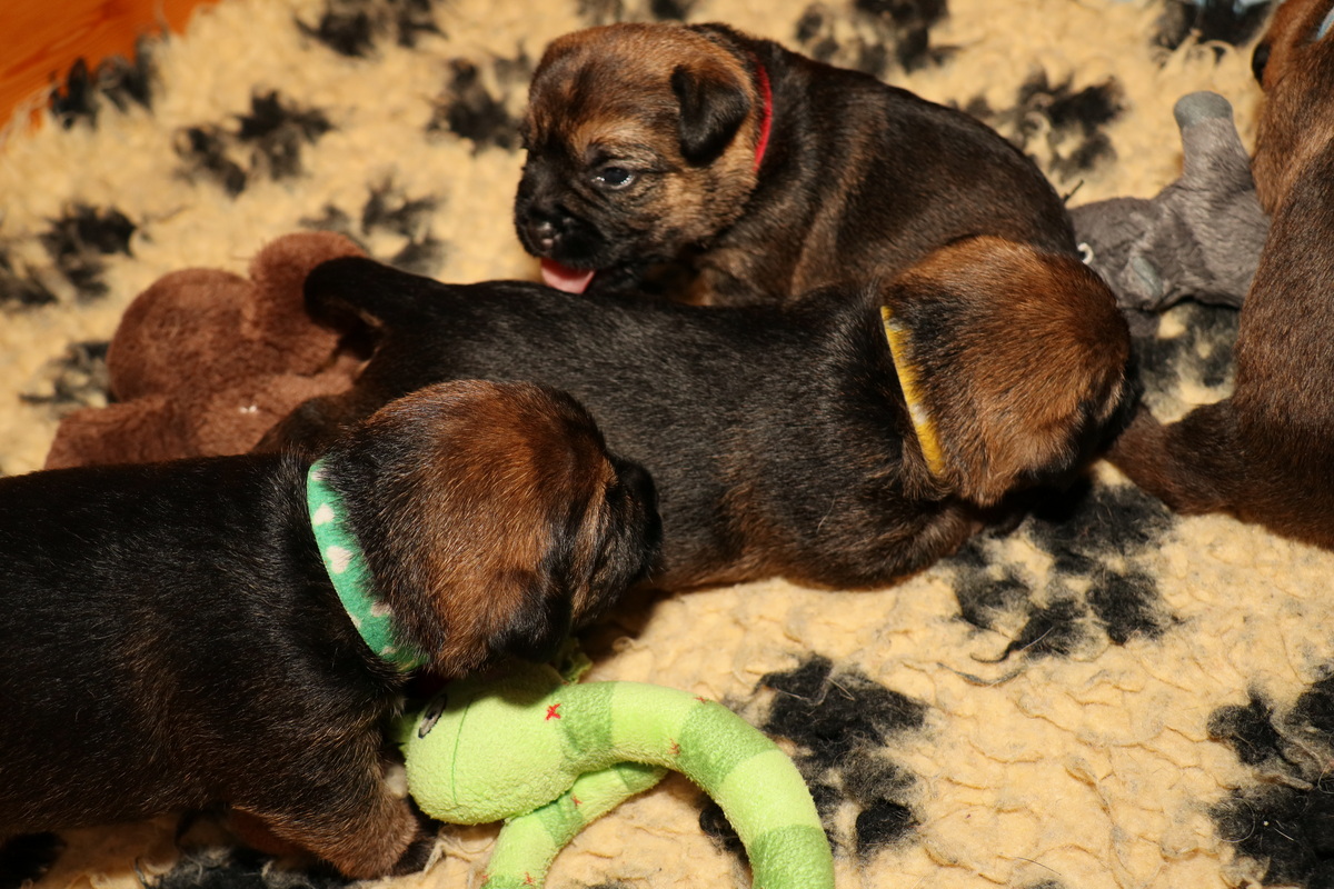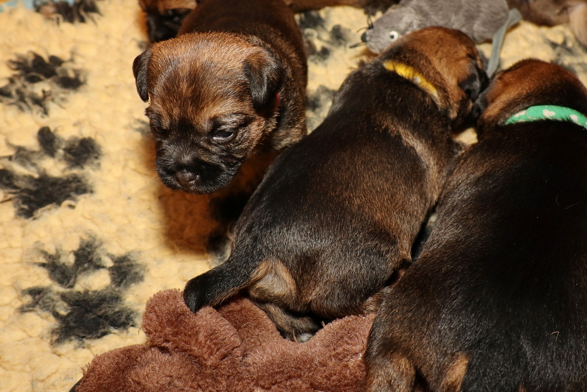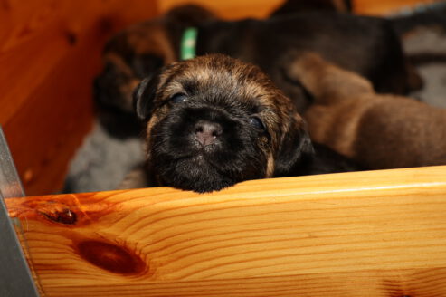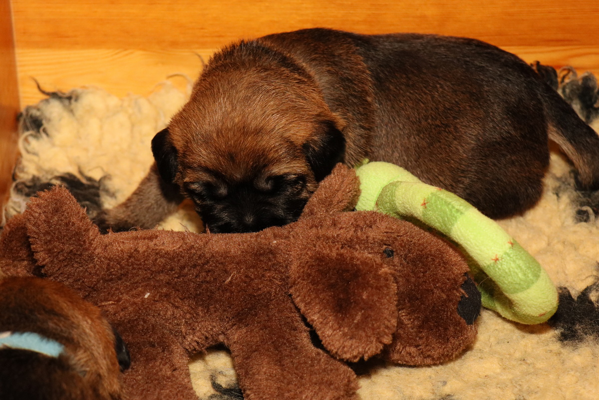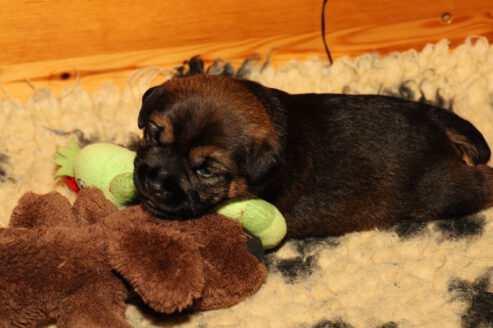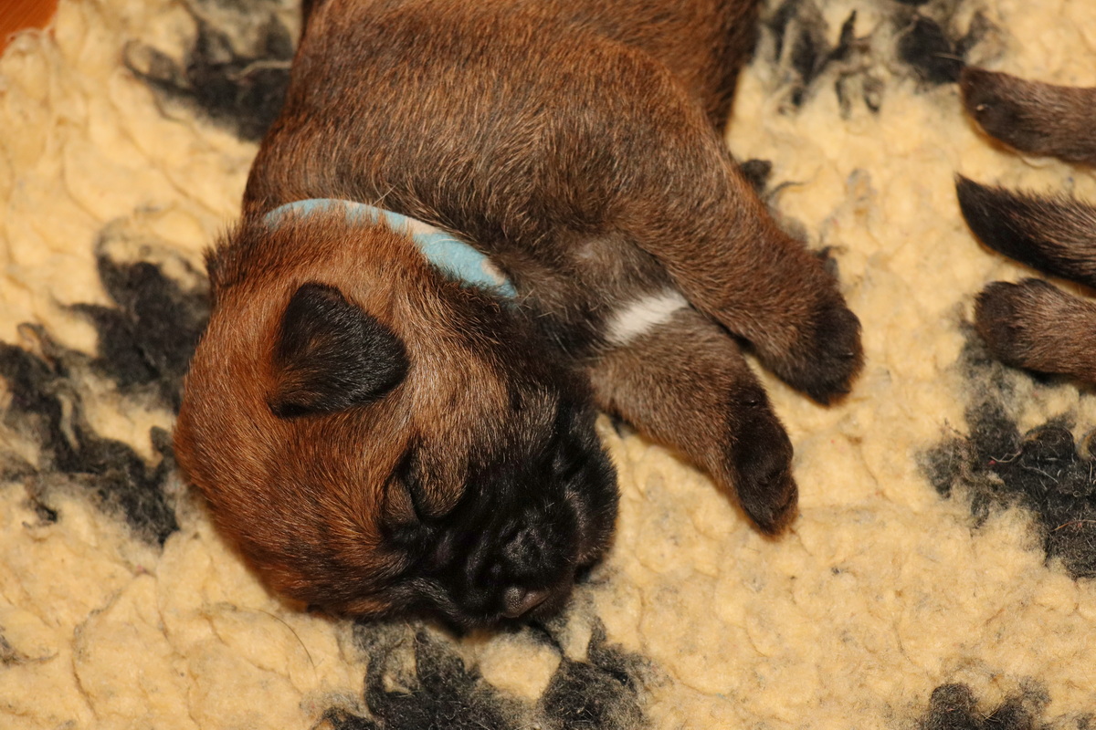 Na zo’n 10 minuten is de energie op en vallen ze heerlijk relaxed in slaap. Vijf tevreden puppy’s.