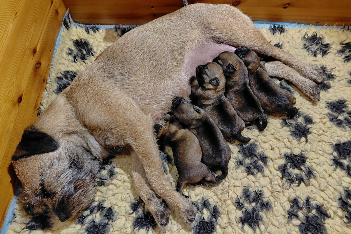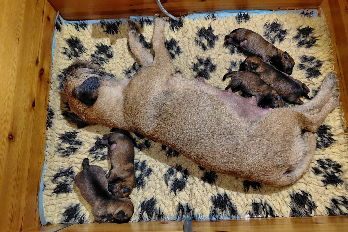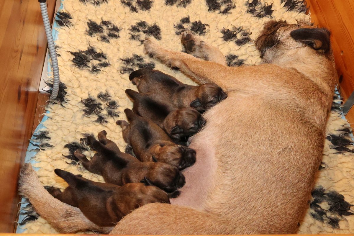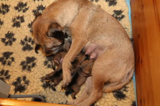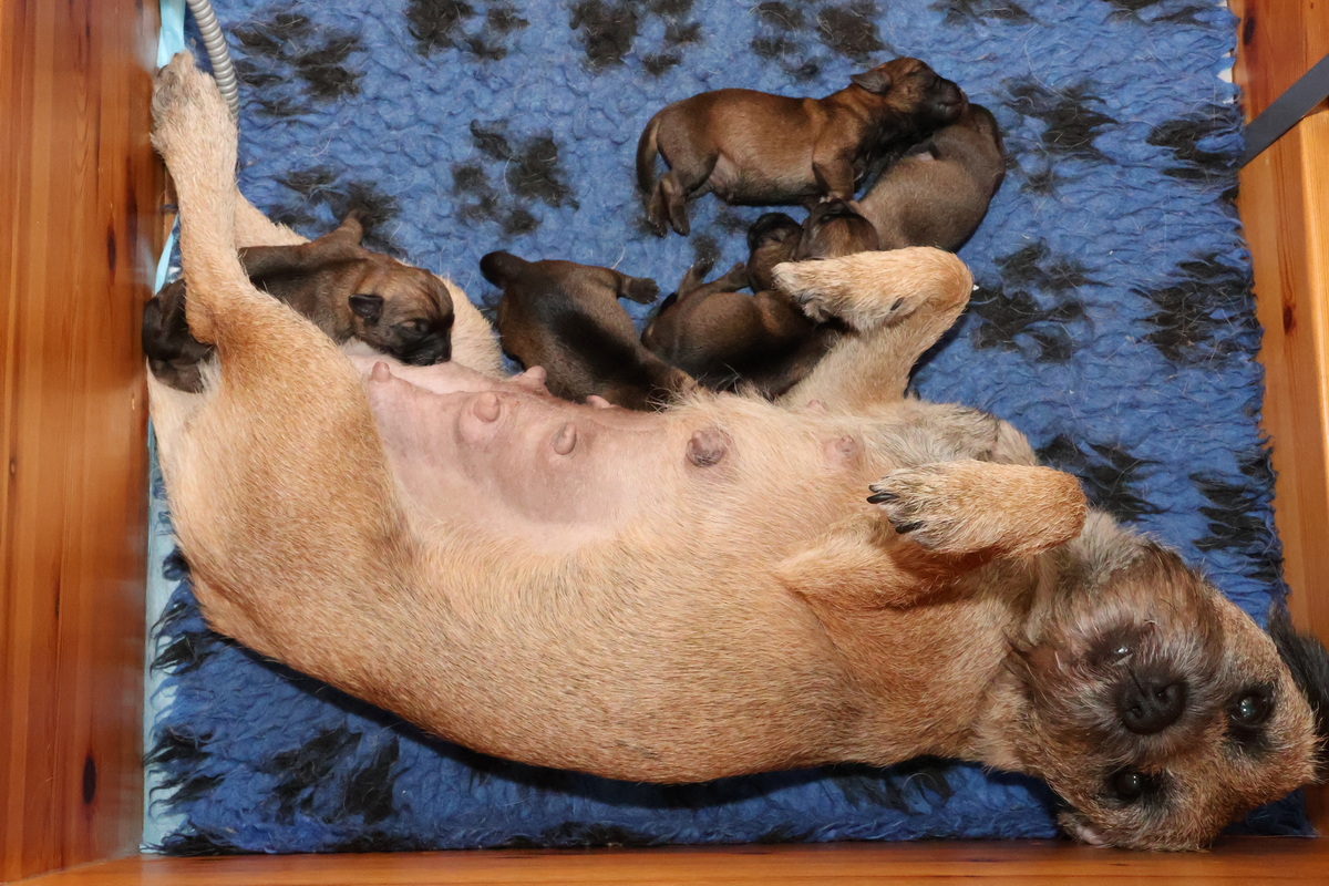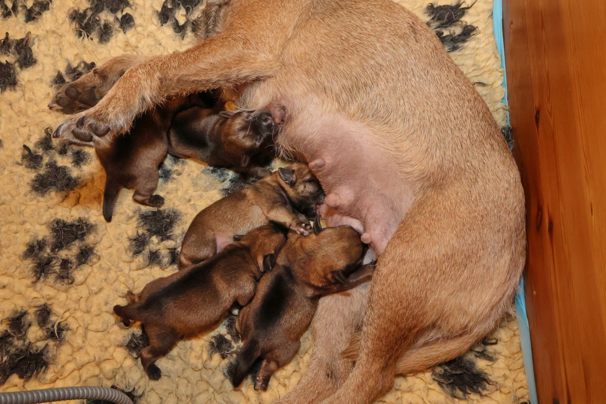 Rosie is, net als bij haar eerste nest, een hele goede moeder. Ze verzorgt haar pups prima en heeft meer dan voldoende melk. Alle tien haar tepels werken, dus de pups hebben het voor het uitkiezen. Rosie eet zelf heel goed, dat moet ook wel als je voldoende melk wilt produceren. Ze heeft gelukkig helemaal geen last van de keizersnee, de wond geneest heel mooi.