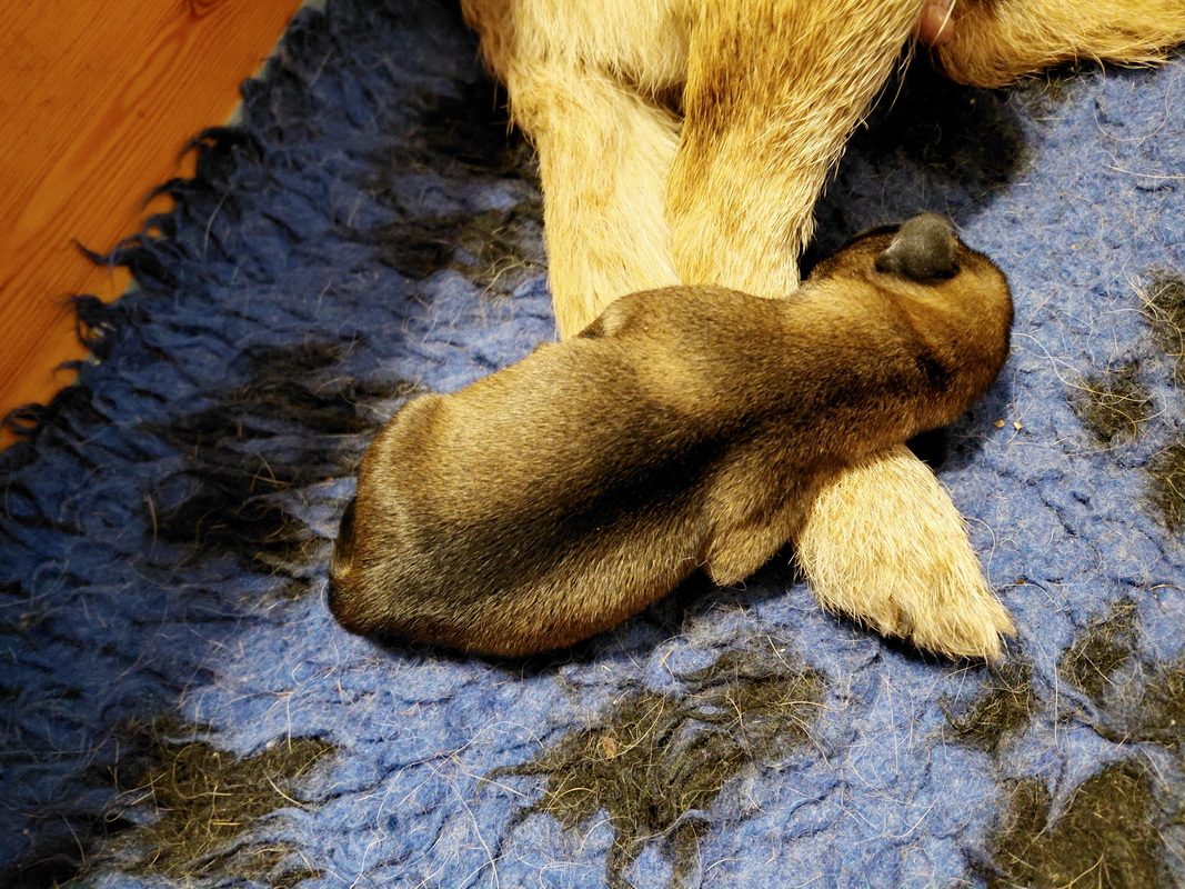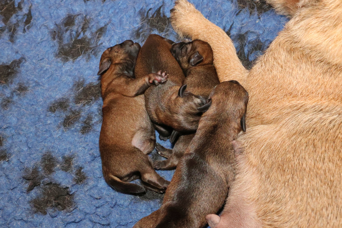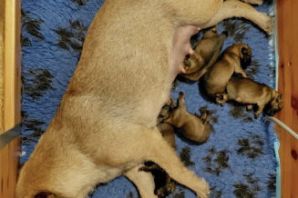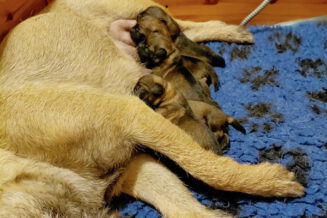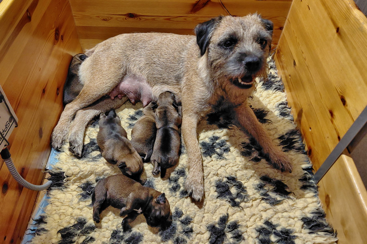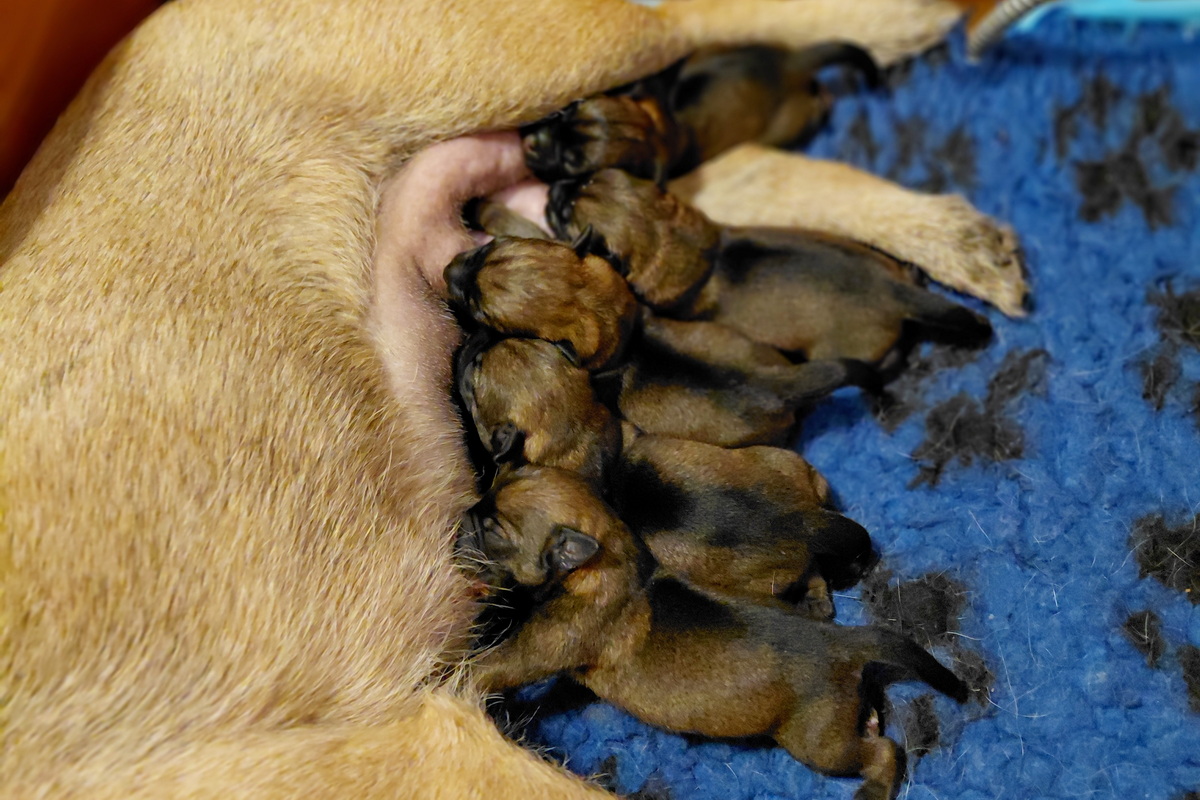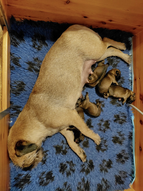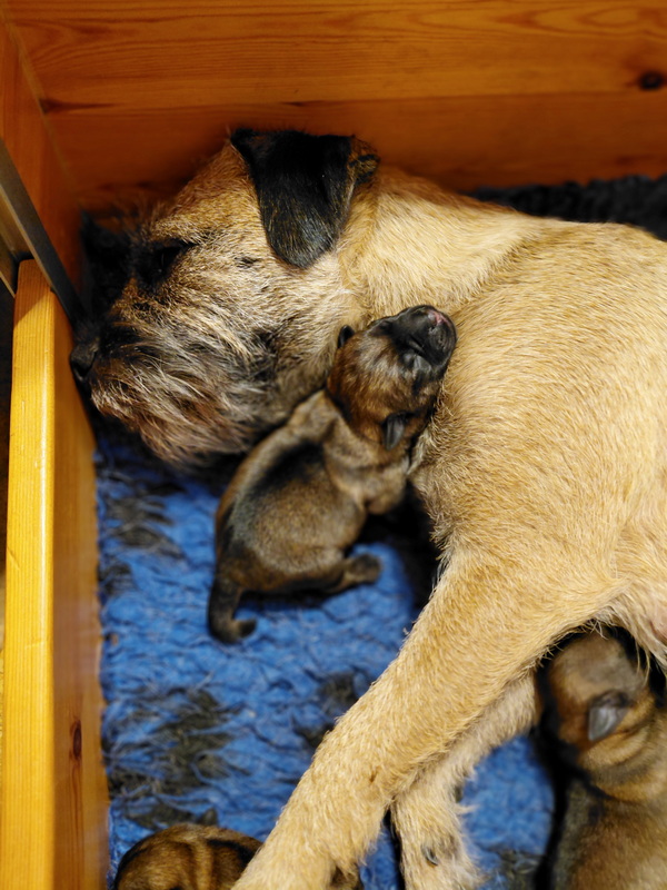 Rosie is, net als bij haar eerste nest, een hele goede moeder. Ze verzorgt haar pups prima en heeft meer dan voldoende melk. Alle tien haar tepels werken, dus de pups hebben het voor het uitkiezen. Rosie eet zelf heel goed, dat moet ook wel als je voldoende melk wilt produceren. Ze heeft gelukkig helemaal geen last van de keizersnee, de wond geneest heel mooi.