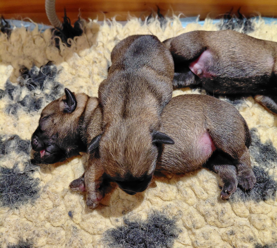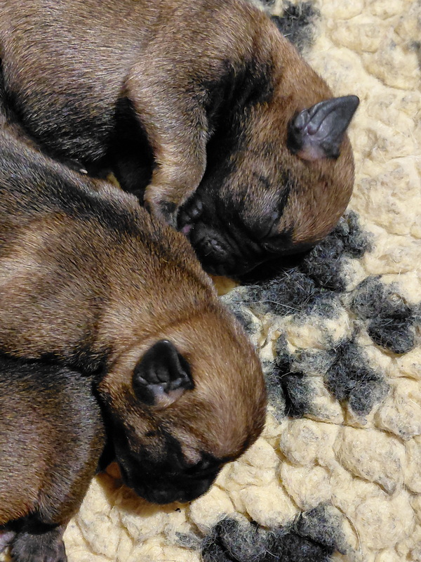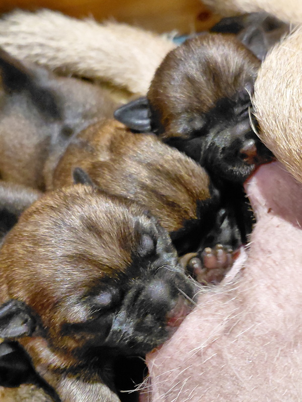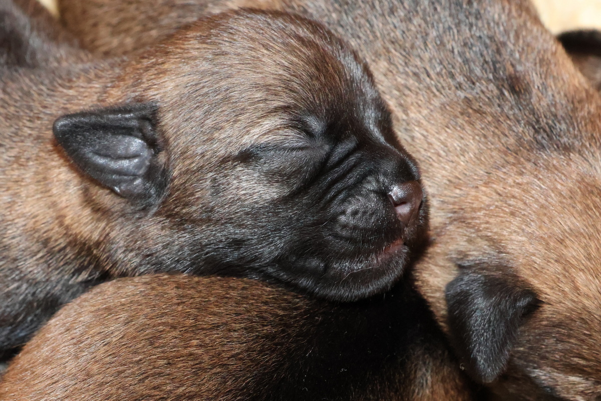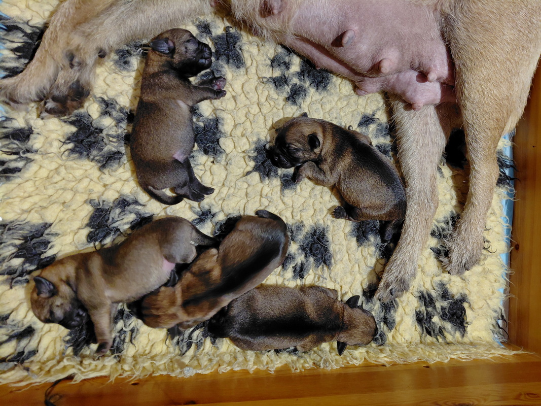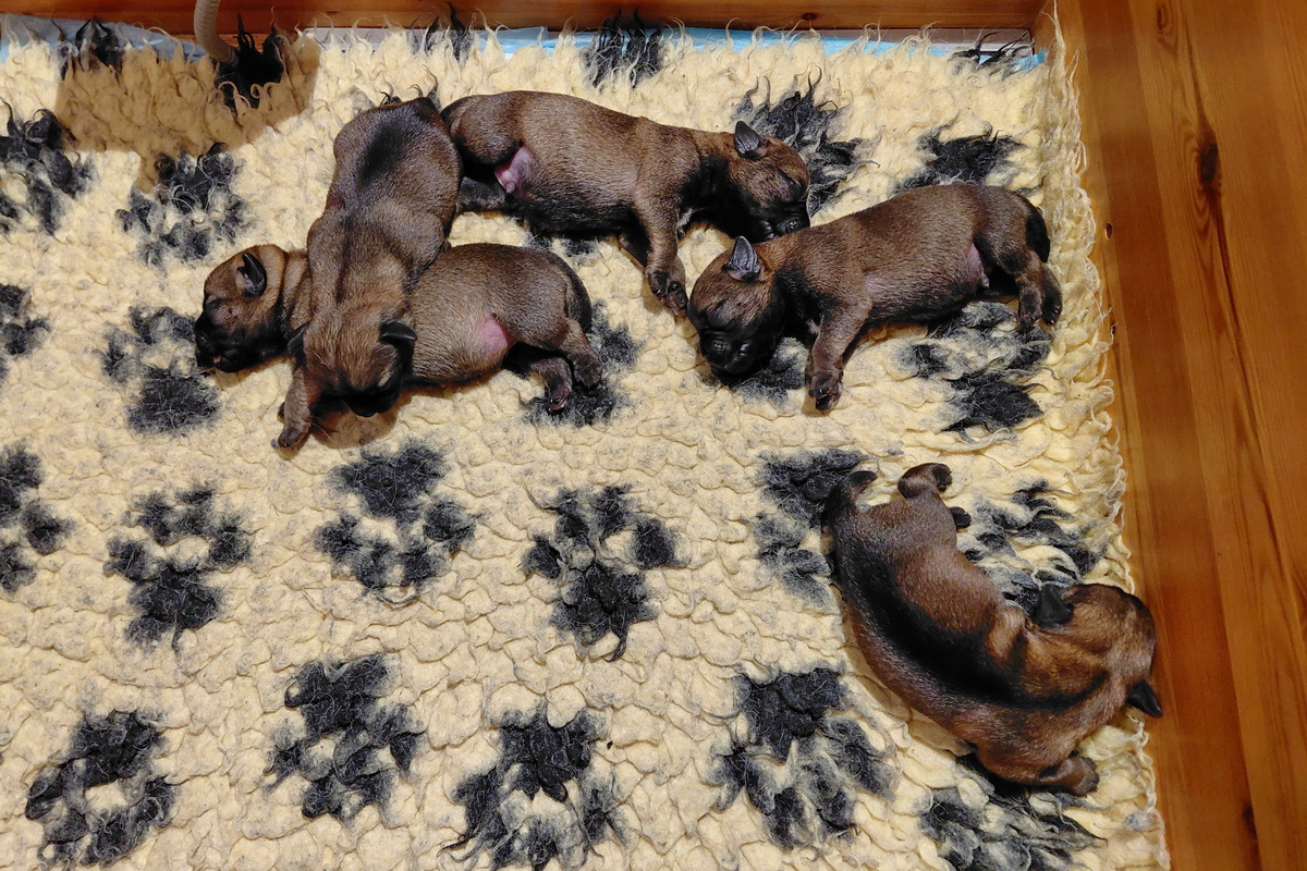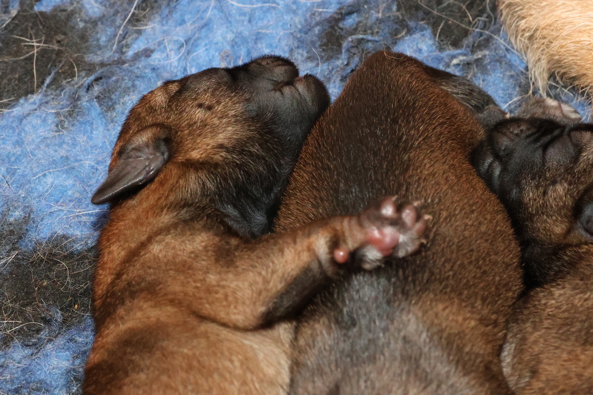 Er gebeurt eigenlijk niet zo heel veel, die eerste week. De pups zijn nog blind en doof en helemaal afhankelijk van hun moeder. Ze drinken bij Rosie, worden door haar verzorgd en slapen heel veel. Belangrijk is dat er regelmaat komt.