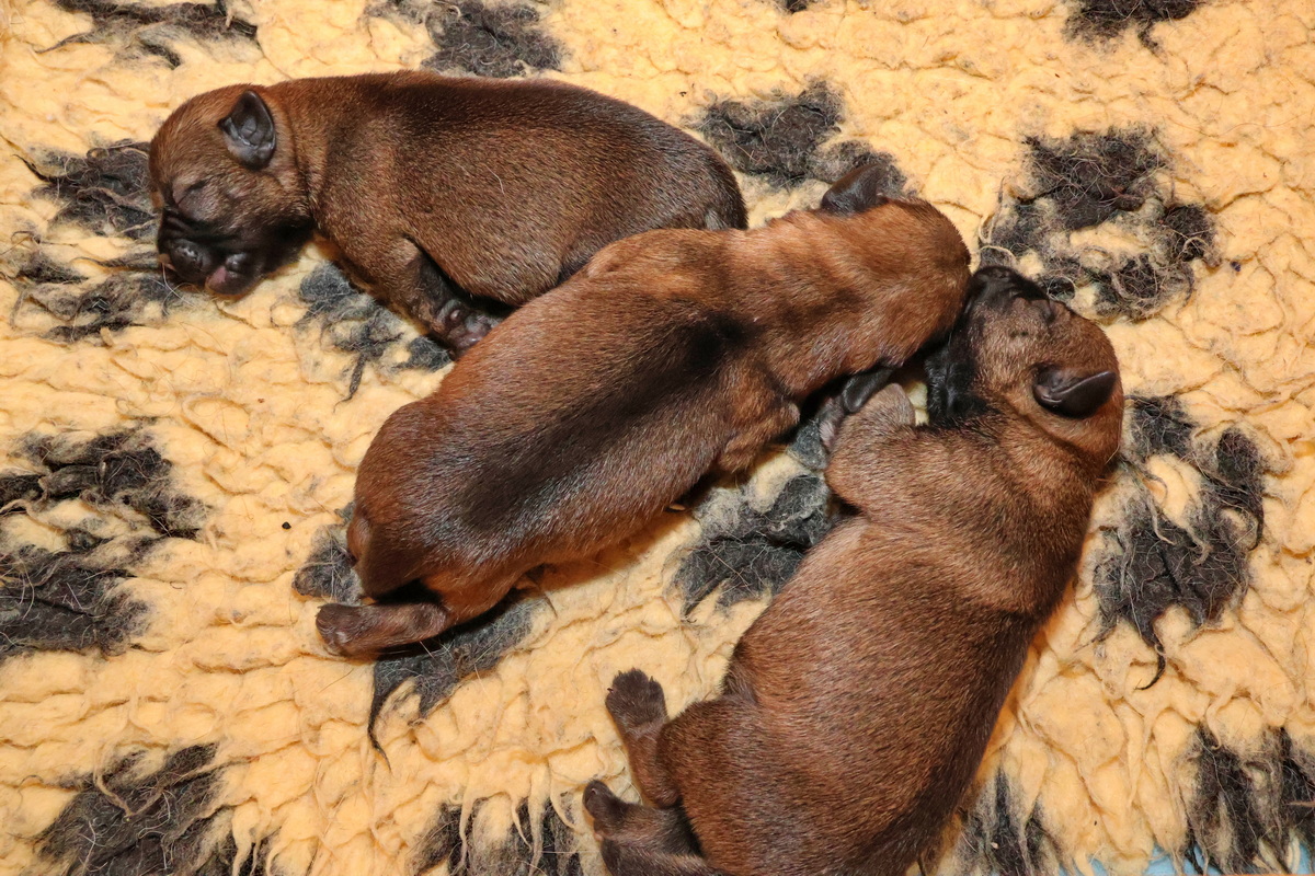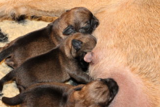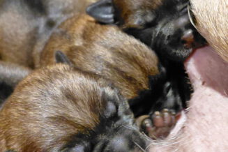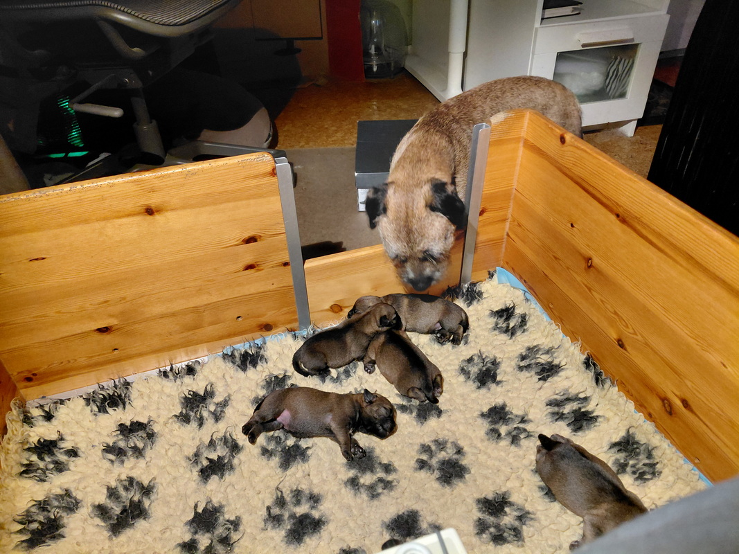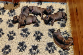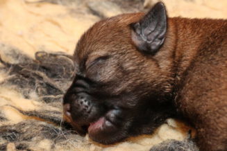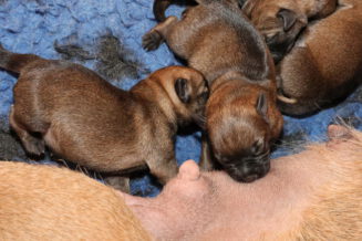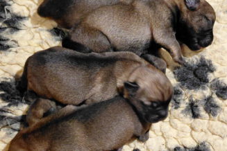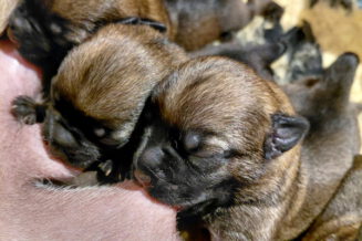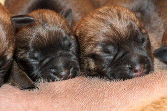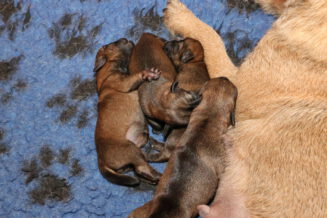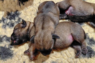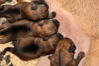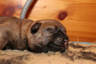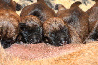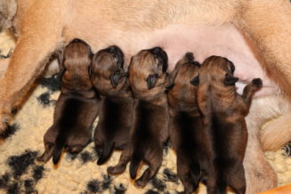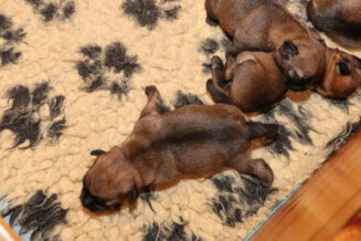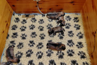 Alle puppy’s zijn ook heel tevreden, je hoort nauwelijks een piepje. Ze groeien allemaal heel goed, we verwachten binnen een paar dagen al een verdubbeling van hun gewicht. Het zijn sterke en actieve pups. Ze kruipen de hele werpkist door en soms staan ze al even op hun pootjes. We hadden eerst een laag plankje bij de uitgang van de werpkist, maar dat moest al gauw door een hoger plankje worden vervangen. Ze moeten nog even wachten met het verkennen van de omgeving.
