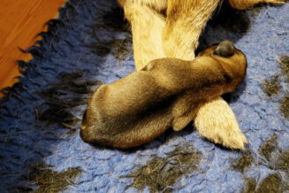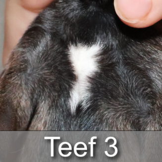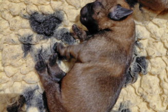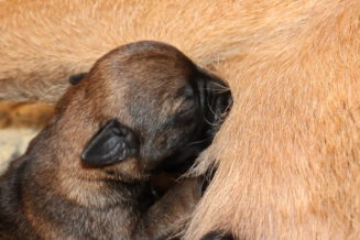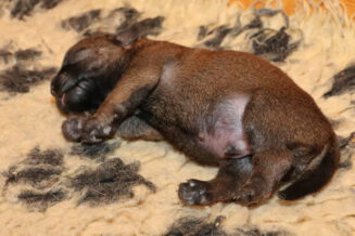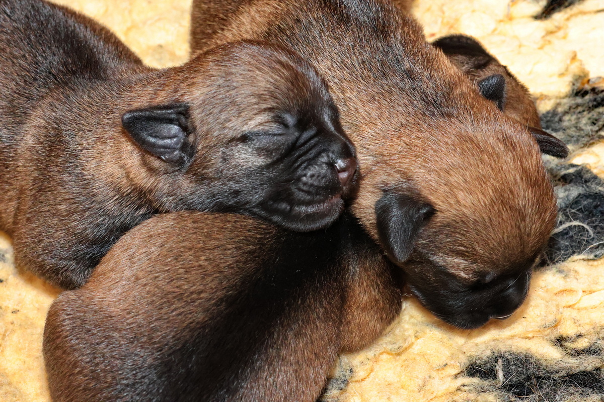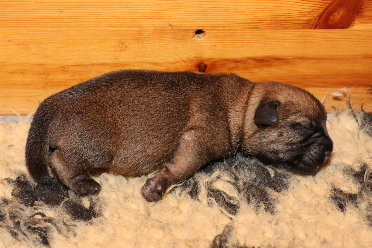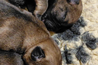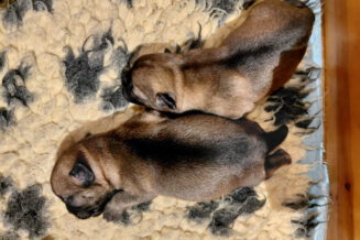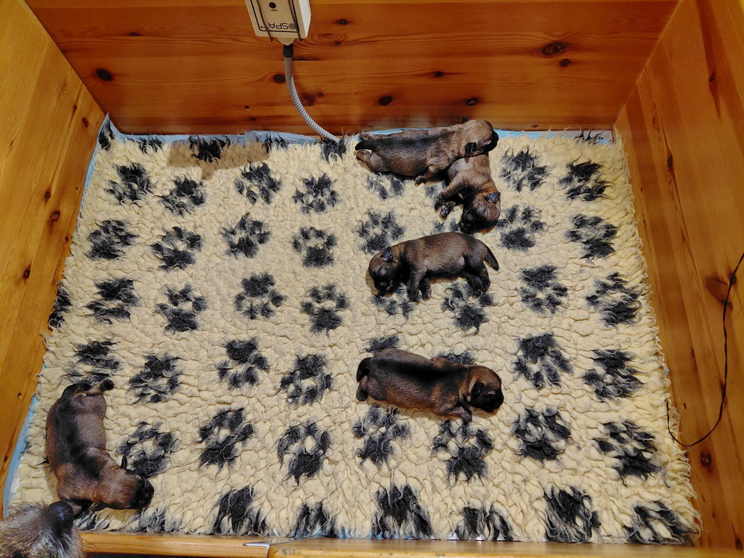 Alle puppy’s zijn ook heel tevreden, je hoort nauwelijks een piepje. Ze groeien allemaal heel goed, we verwachten binnen een paar dagen al een verdubbeling van hun gewicht. Het zijn sterke en actieve pups. Ze kruipen de hele werpkist door en soms staan ze al even op hun pootjes. We hadden eerst een laag plankje bij de uitgang van de werpkist, maar dat moest al gauw door een hoger plankje worden vervangen. Ze moeten nog even wachten met het verkennen van de omgeving.
