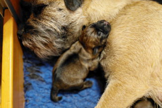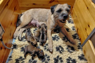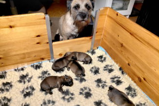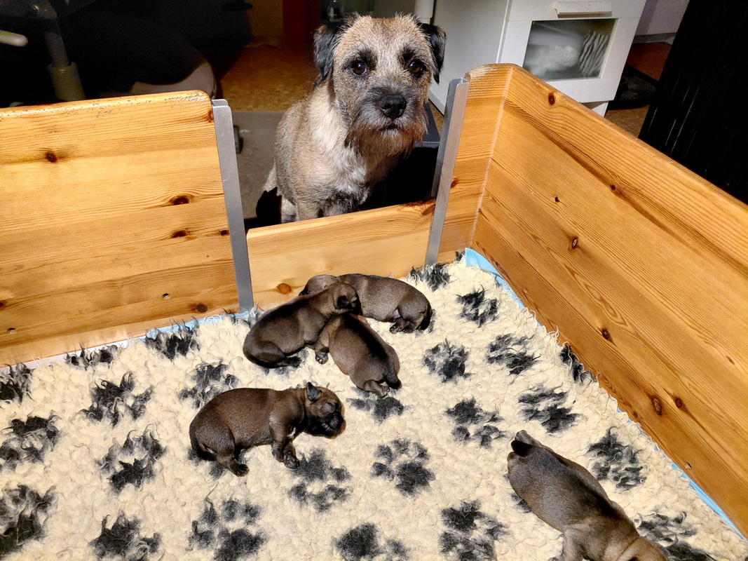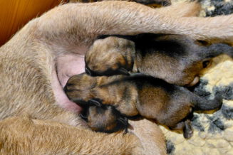 De eerste dagen was Rosie niet bij haar pups weg te krijgen. Even naar buiten voor een plas en een poep en dan gauw weer terug naar de puppy’s. Aan het einde van deze week is dat al wat minder geworden. Rosie ziet dat het goed gaat met haar kroost en kan er nu wat langer van weg. Maar ze is altijd op tijd om ze te voeren!