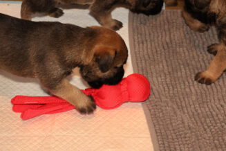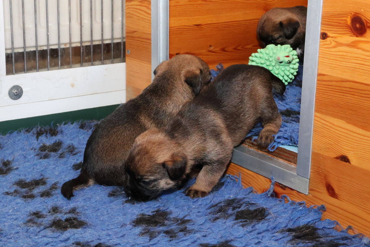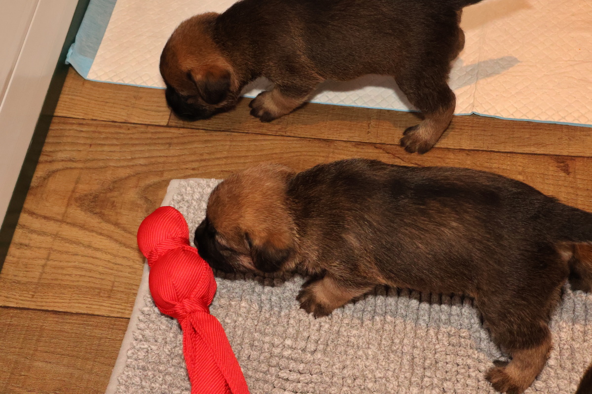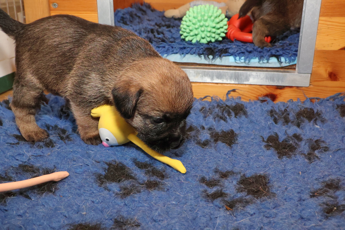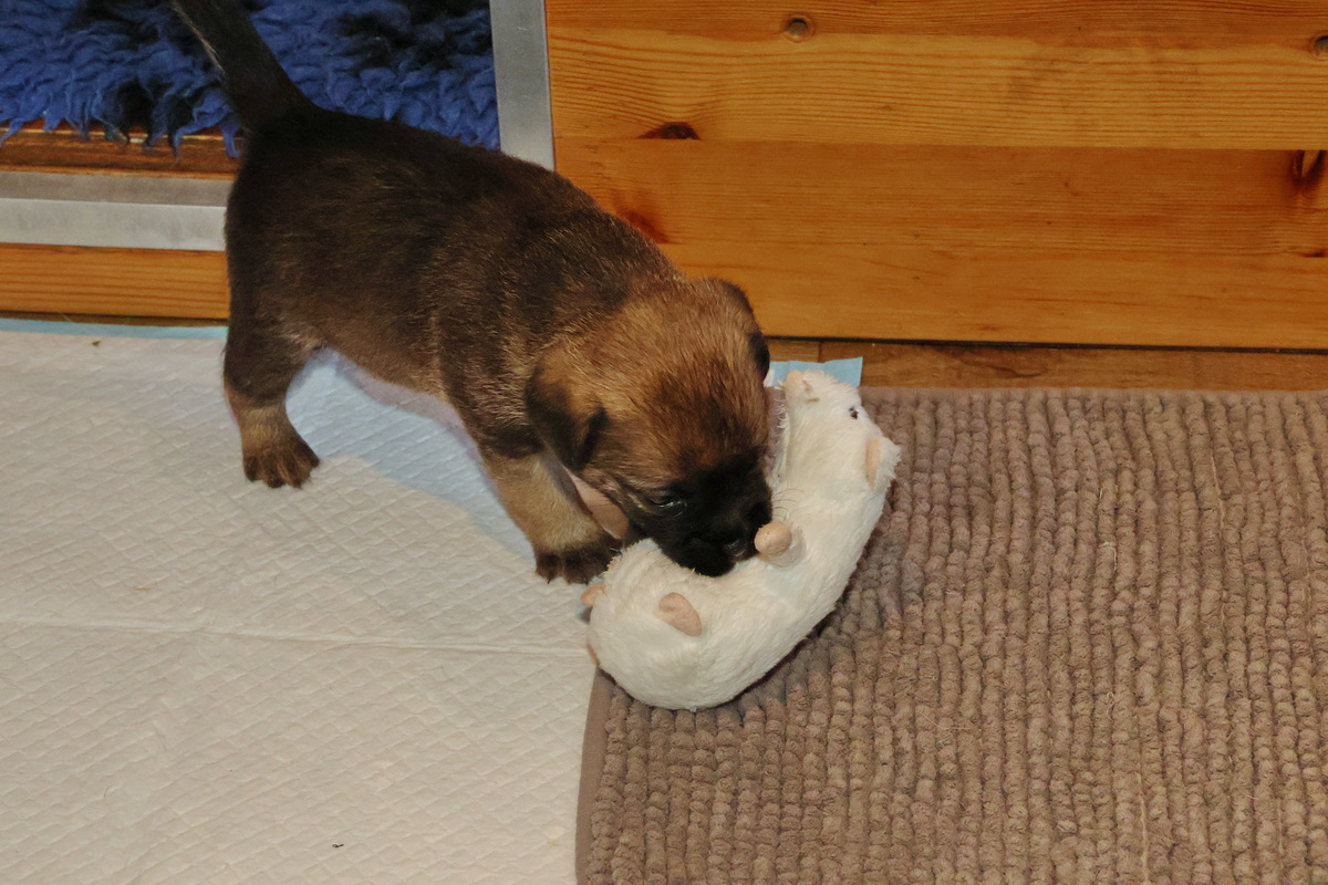 De pups kunnen steeds beter zien, horen en bewegen. Daardoor zijn veel meer met elkaar en met hun omgeving bezig. Ze gaan hun speeltjes ontdekken en kijken wat je daar allemaal mee kunt doen. Ze zijn er nog heel voorzichtig mee, ze “slopen” nog niets.