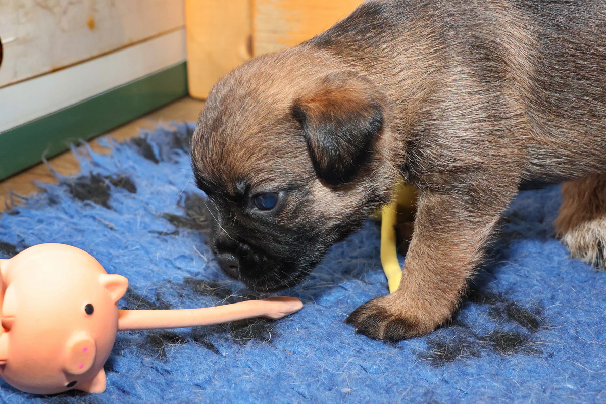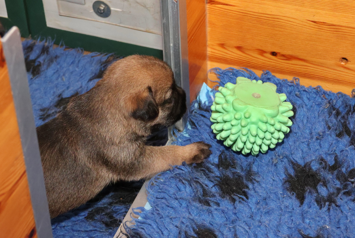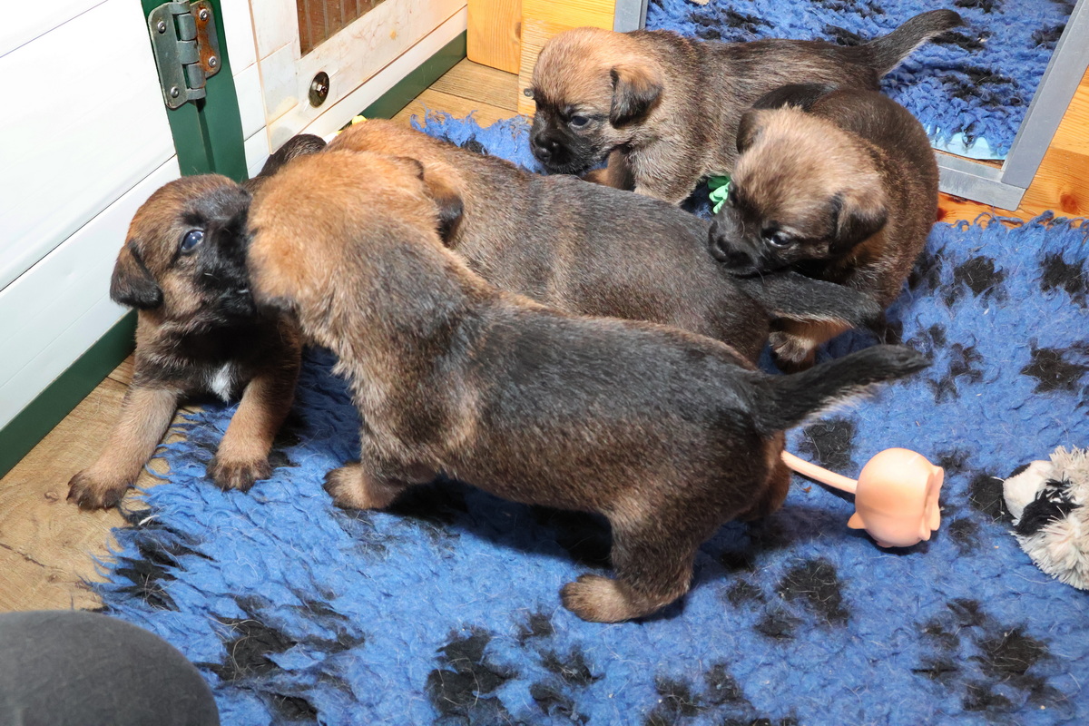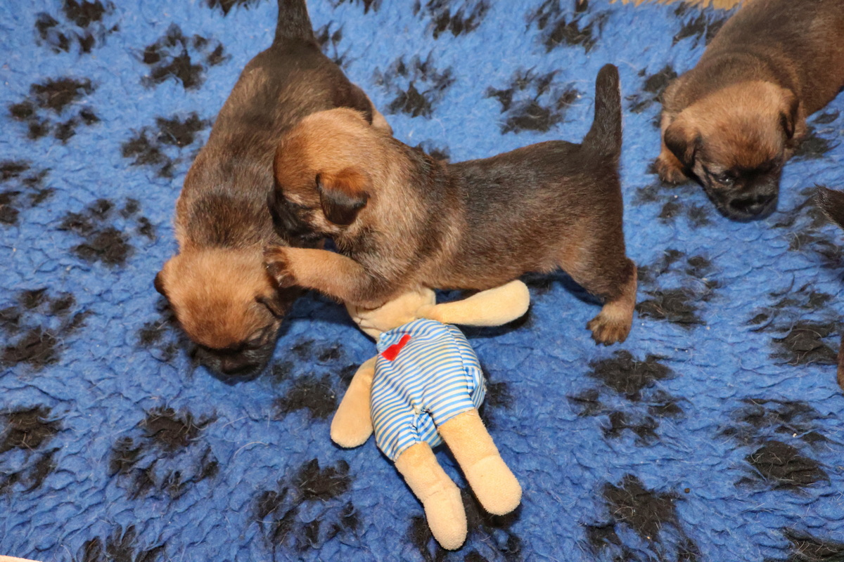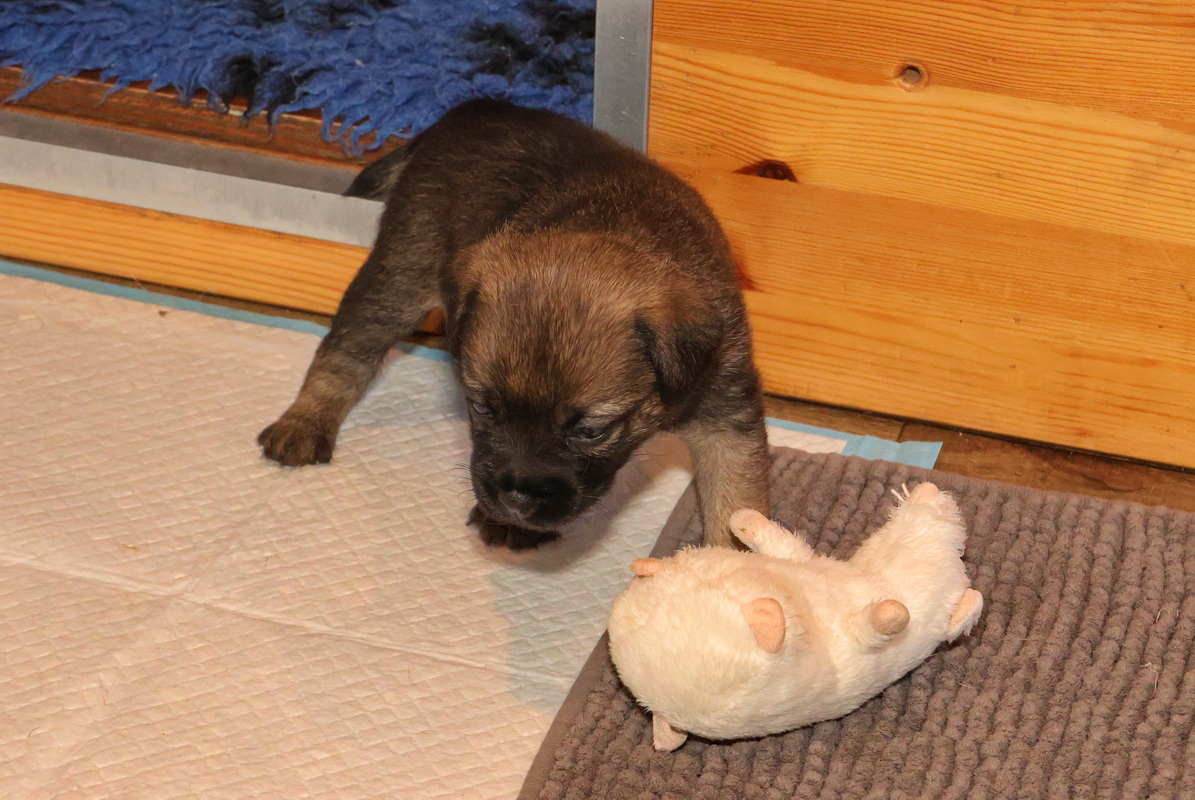 De pups kunnen steeds beter zien, horen en bewegen. Daardoor zijn veel meer met elkaar en met hun omgeving bezig. Ze gaan hun speeltjes ontdekken en kijken wat je daar allemaal mee kunt doen. Ze zijn er nog heel voorzichtig mee, ze “slopen” nog niets.