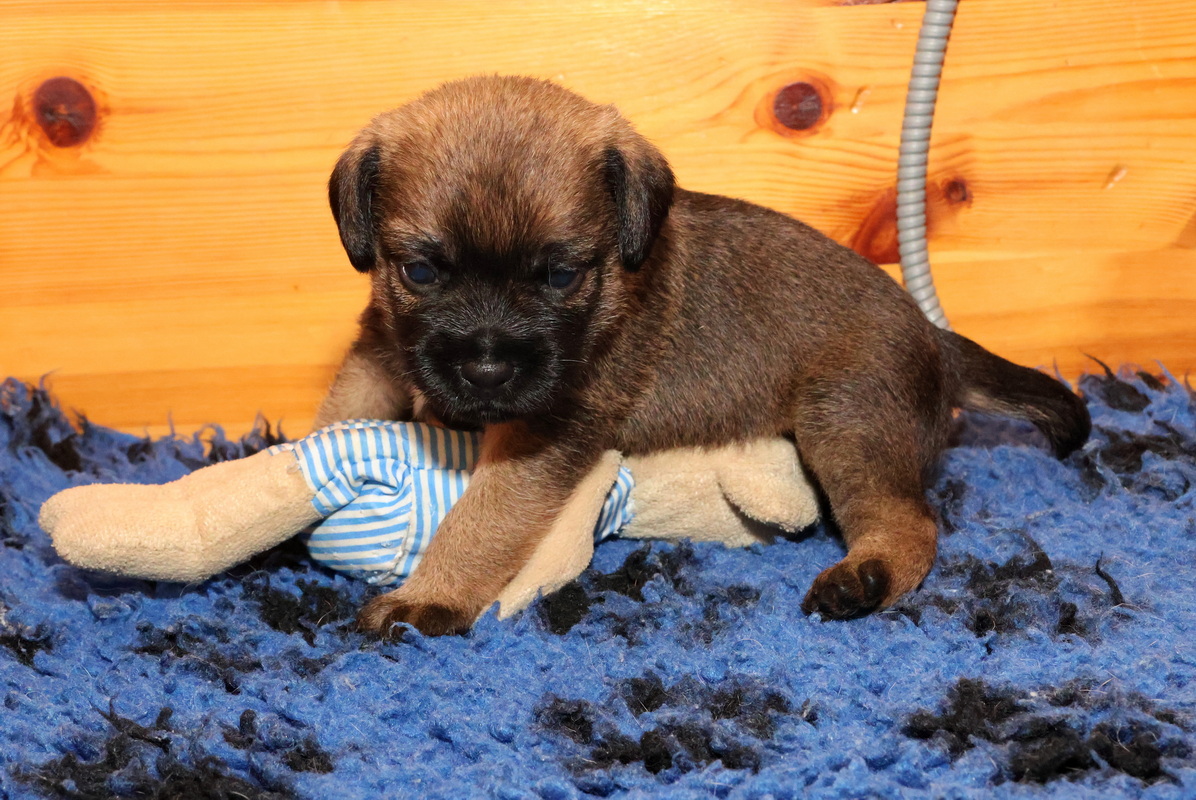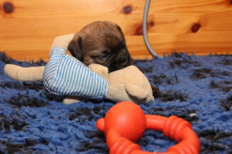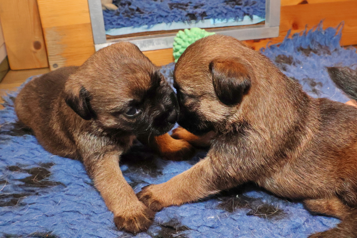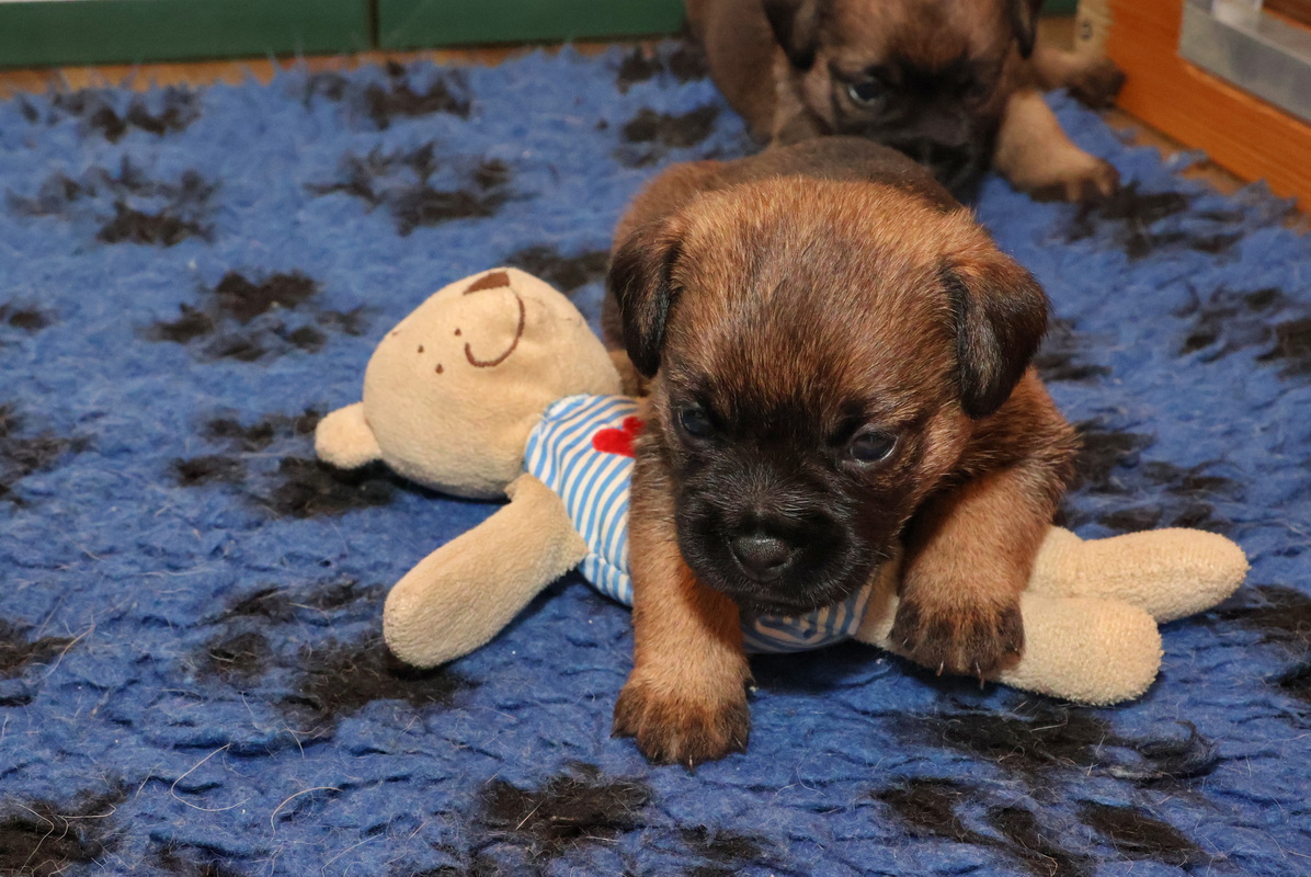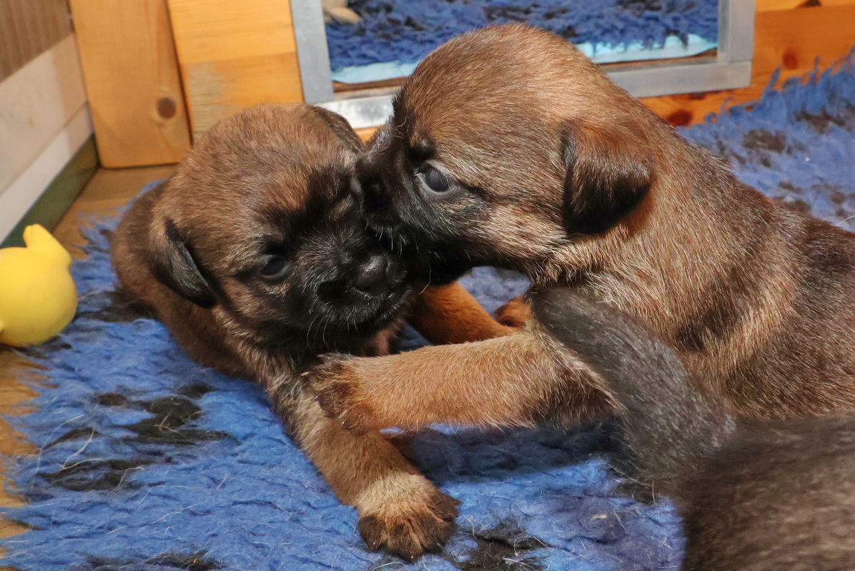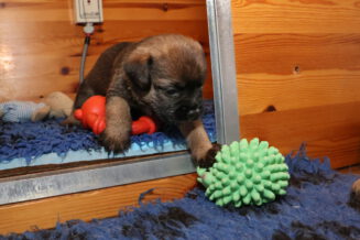 De pups kunnen steeds beter zien, horen en bewegen. Daardoor zijn veel meer met elkaar en met hun omgeving bezig. Ze gaan hun speeltjes ontdekken en kijken wat je daar allemaal mee kunt doen. Ze zijn er nog heel voorzichtig mee, ze “slopen” nog niets.