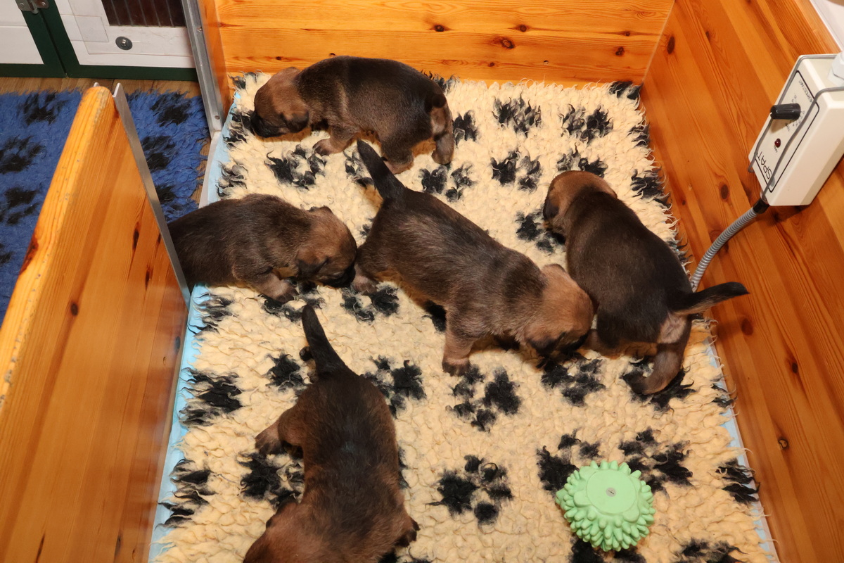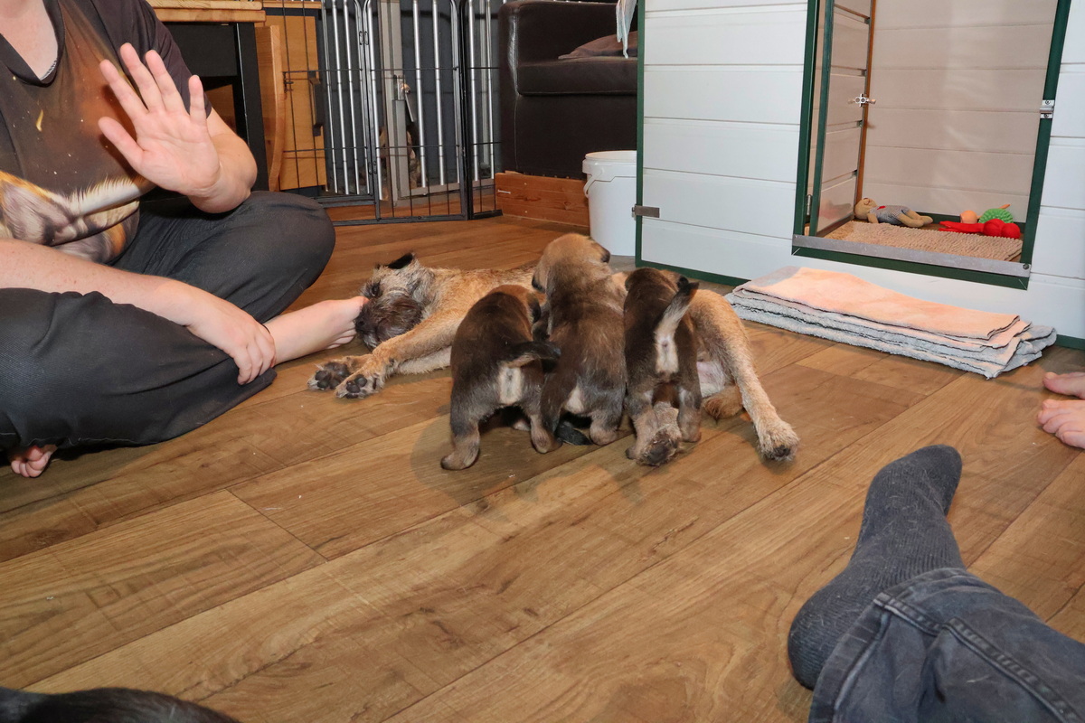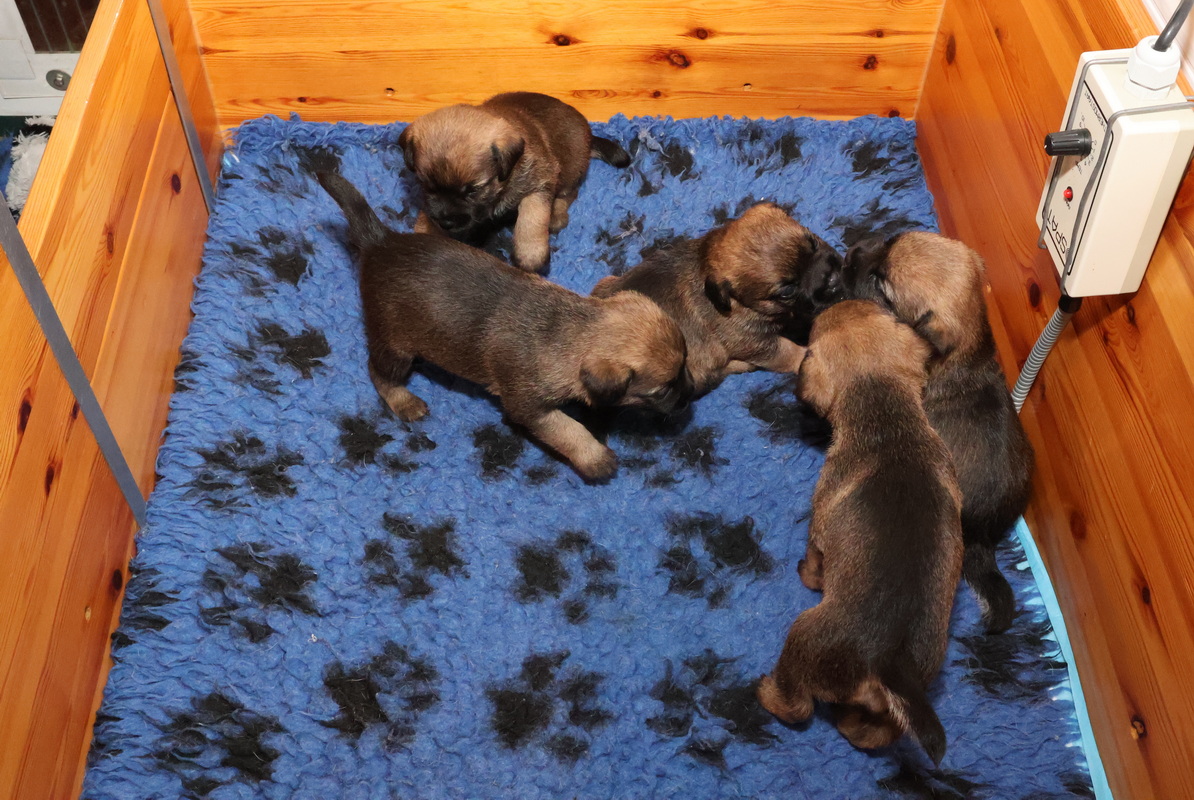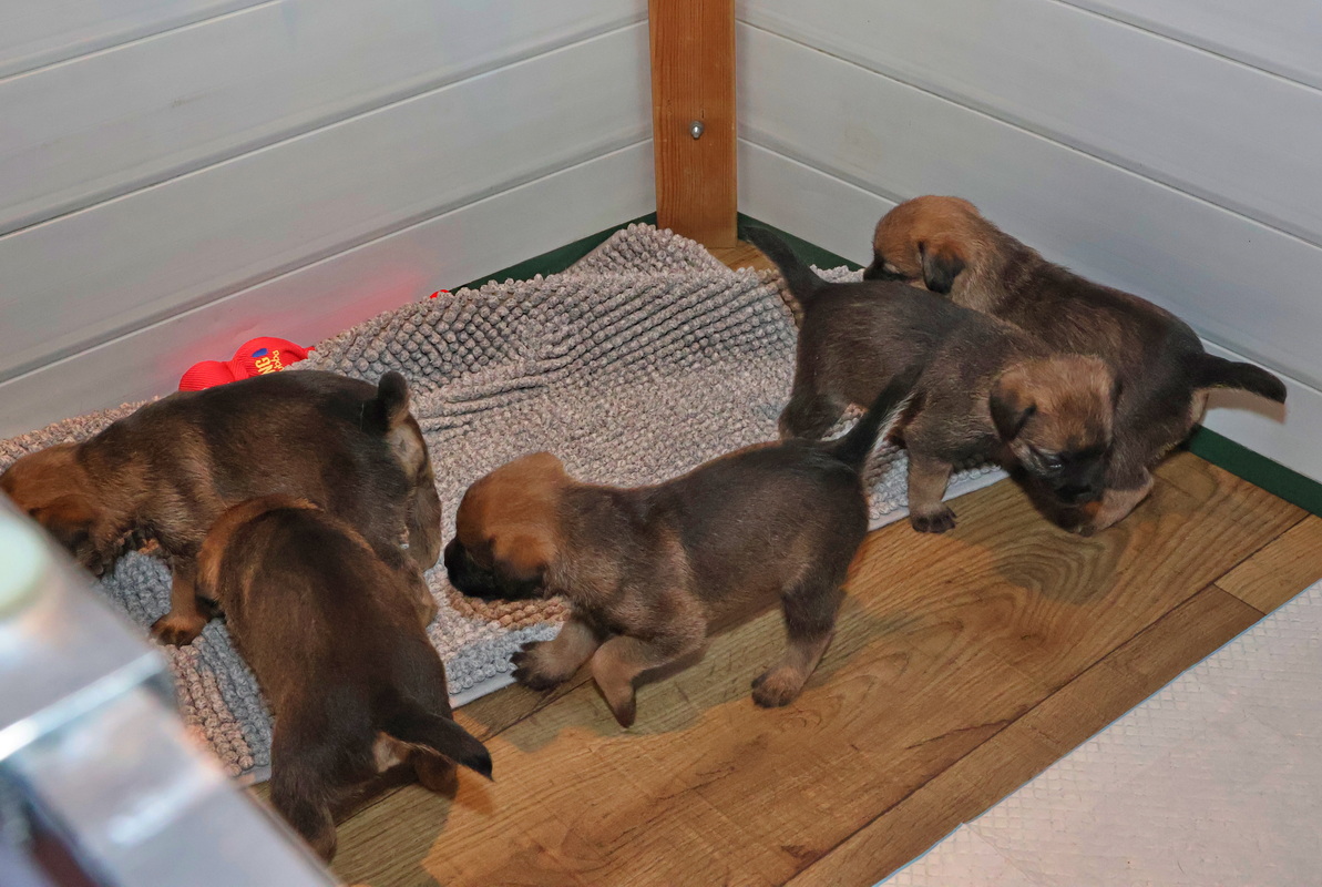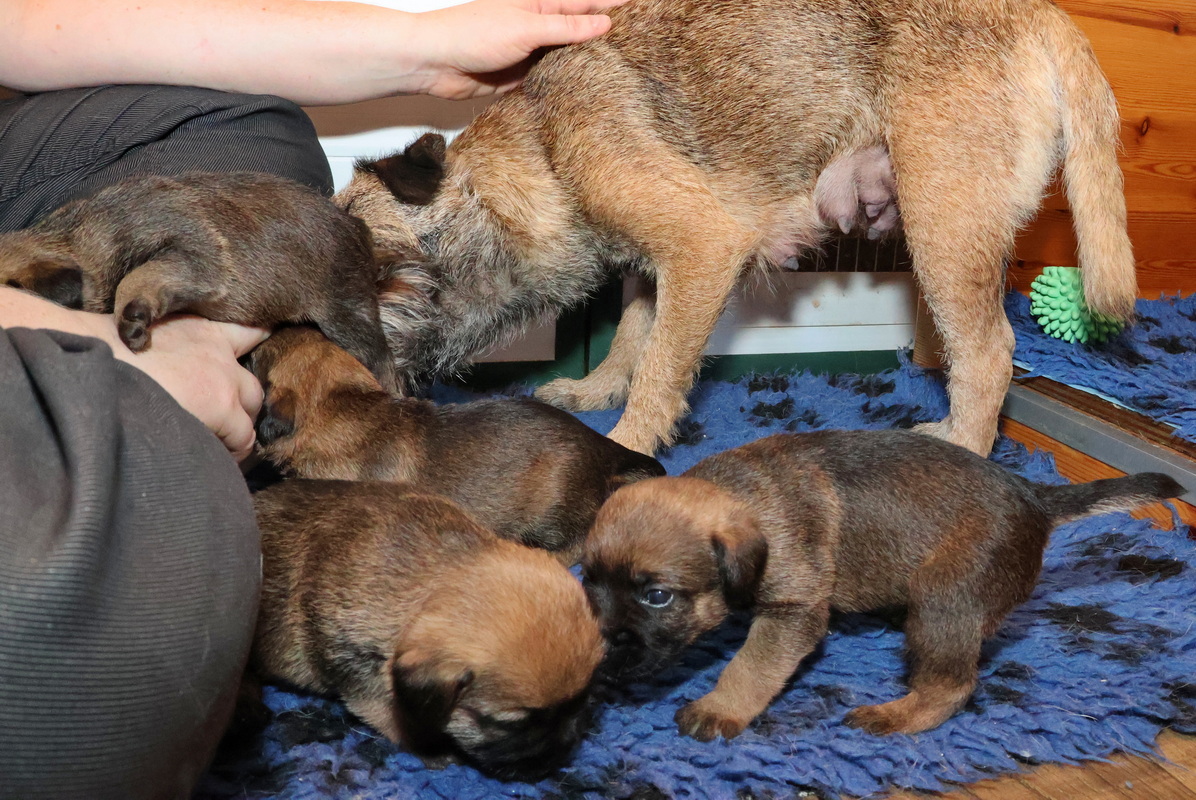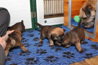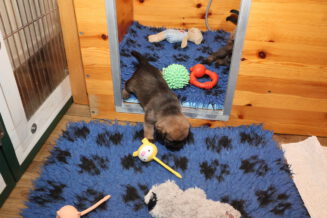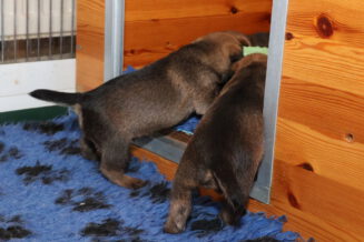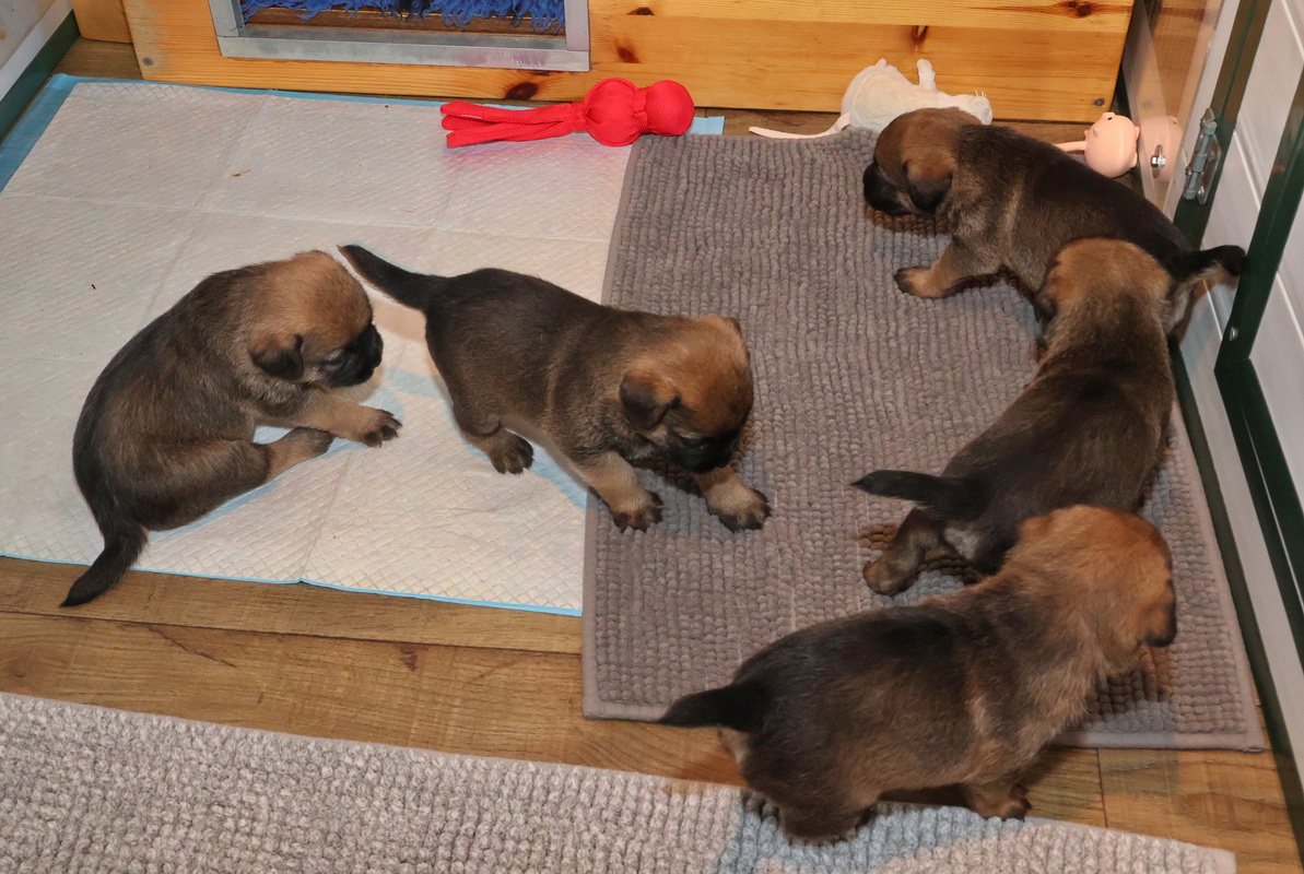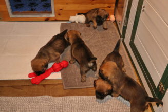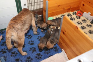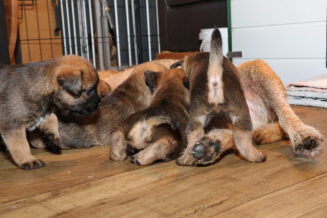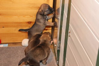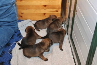 De puppy’s zijn elke keer wat langer wakker.  Ze gaan dan lekker in de werpkist of de kamerkennel spelen. En natuurlijk om de drie uur even bij Rosie langs voor wat lekkers.